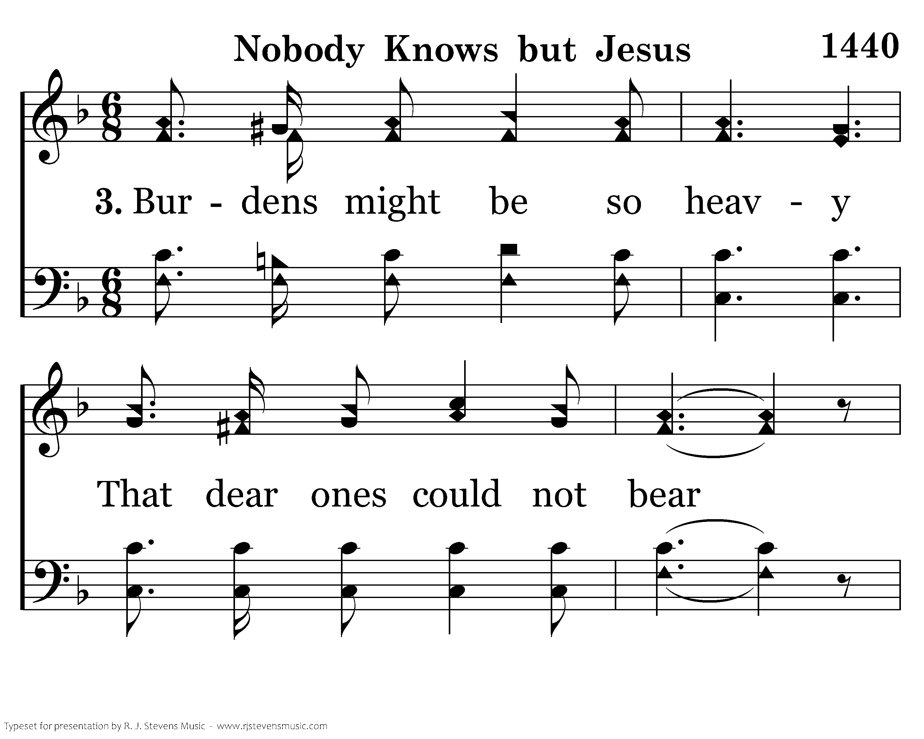 Nobody knows but Jesus; 'Tis music for today; And thru the hardest trials, Helps me along the way.