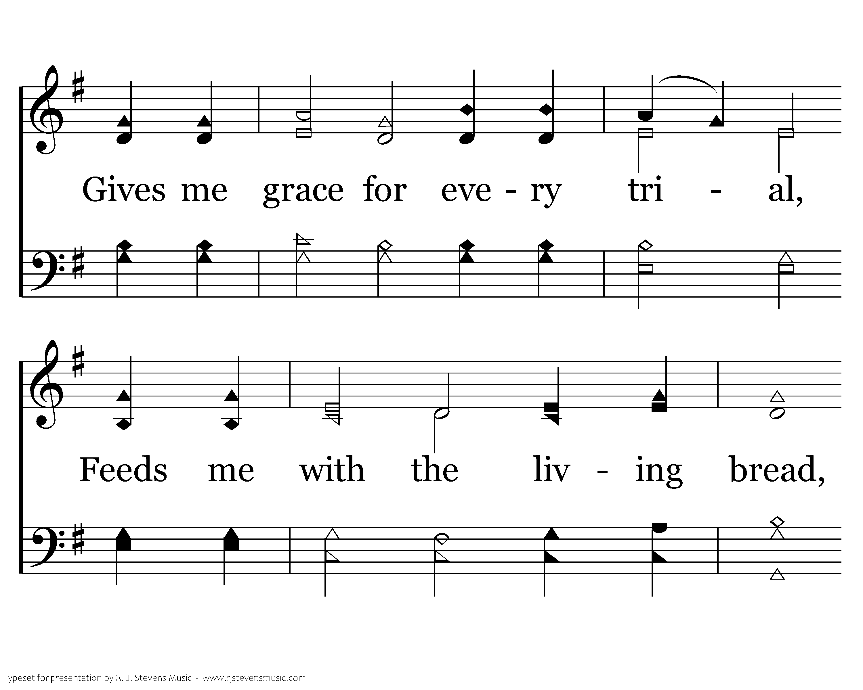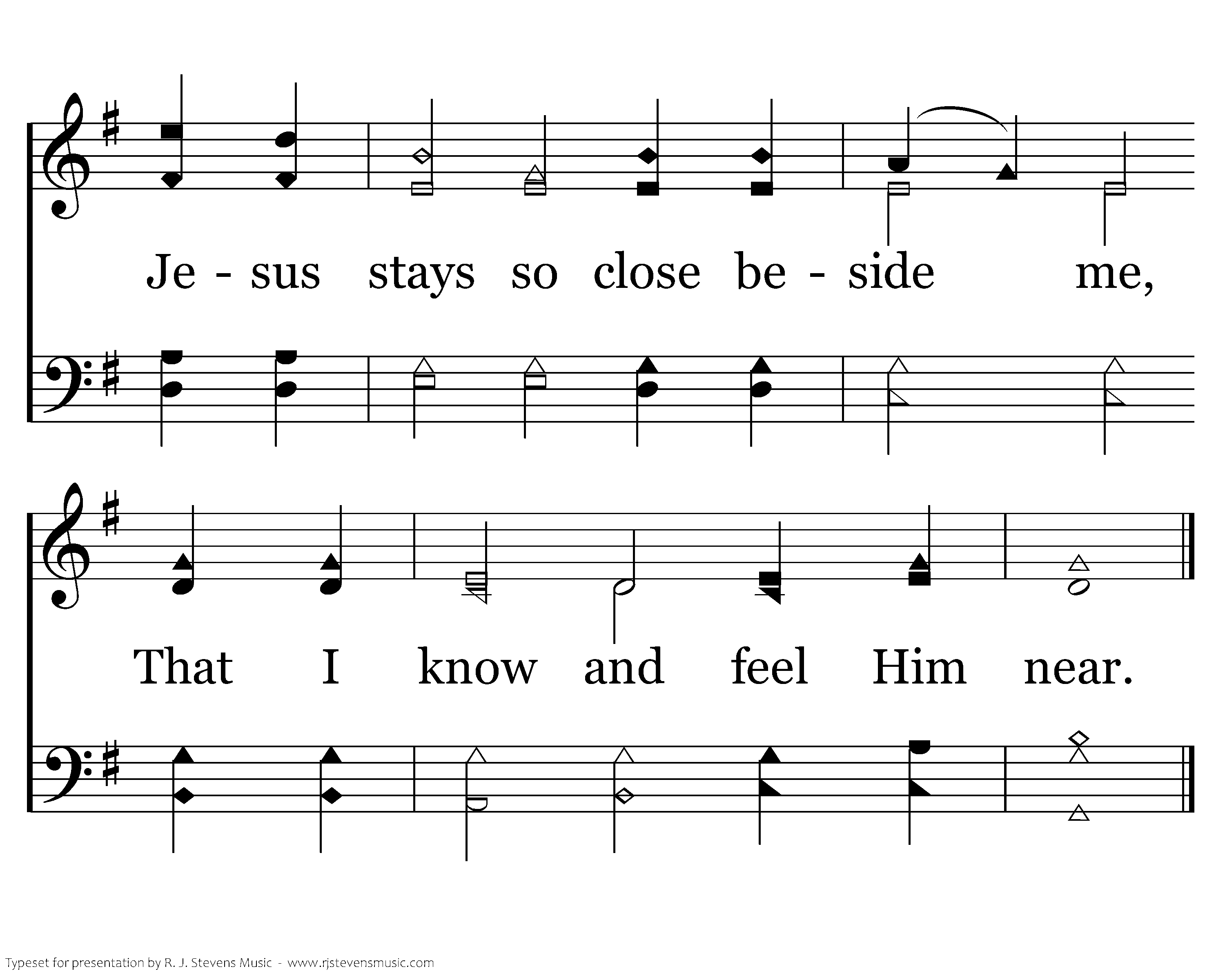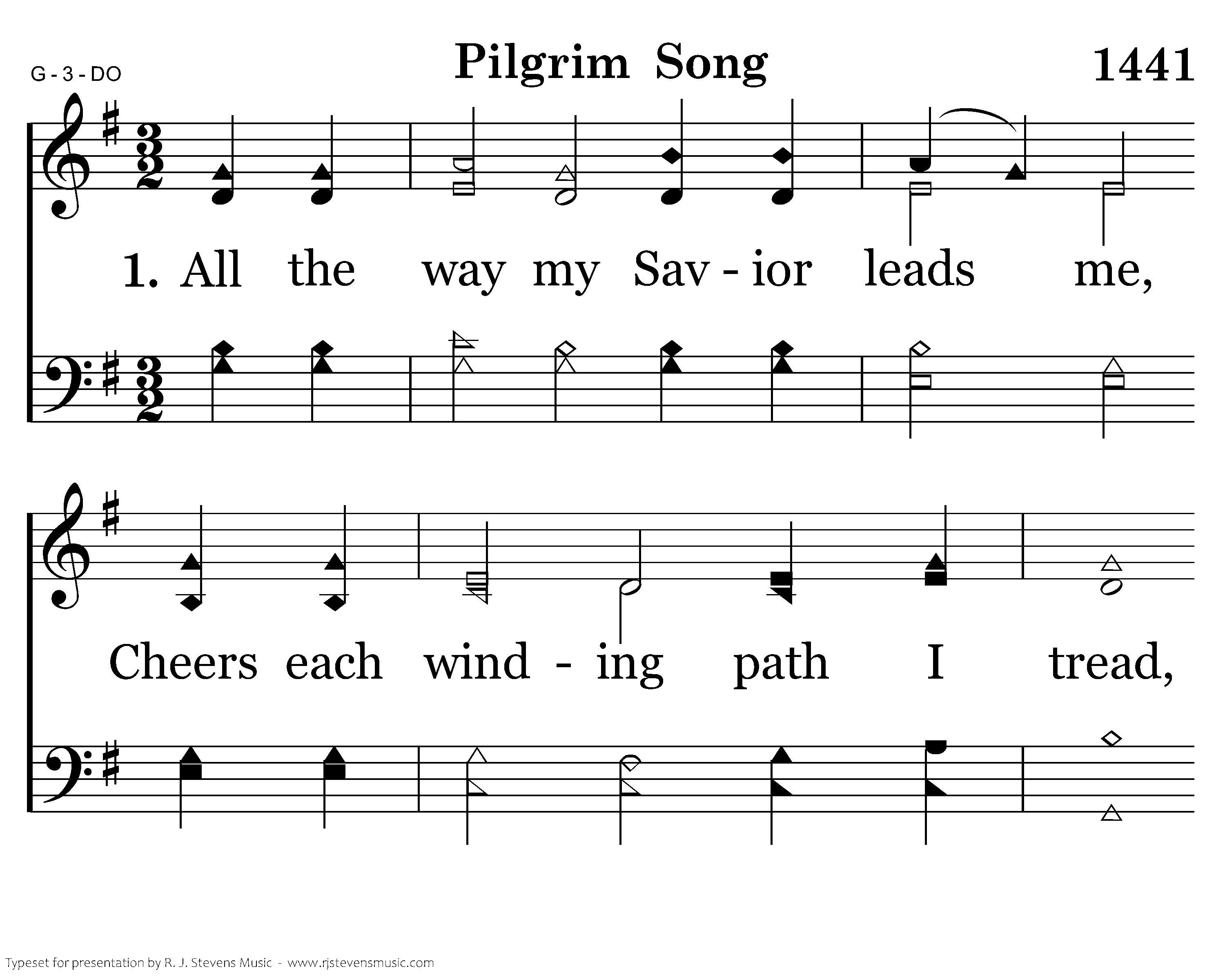 All the way my Savior leads me, Cheers each winding path I tread, Gives me grace for every trial, Feeds me with the living bread, Whether good or ill betide me, Whether skies be dark or clear, Jesus stays so close beside me, That I know and feel Him near.