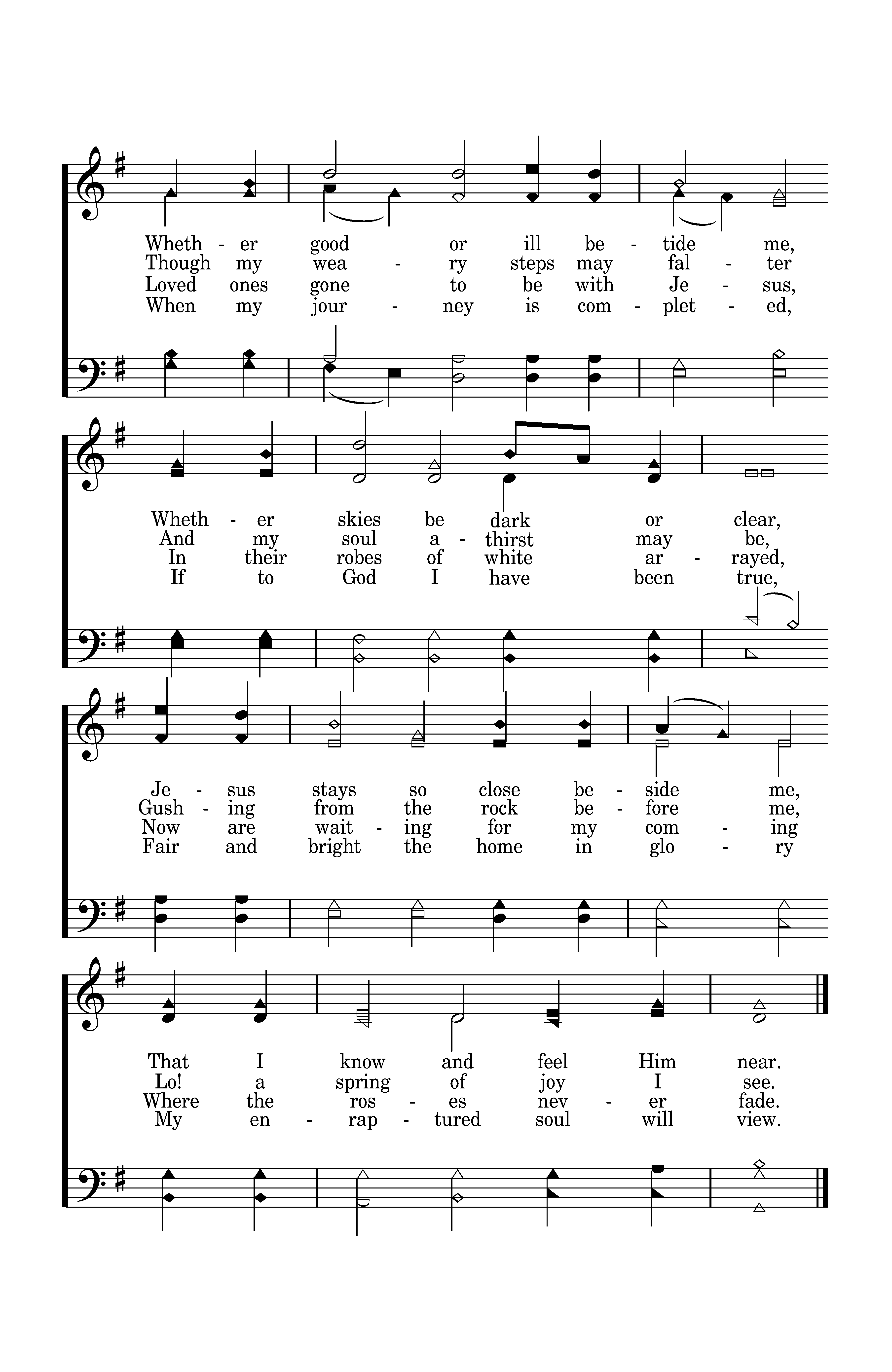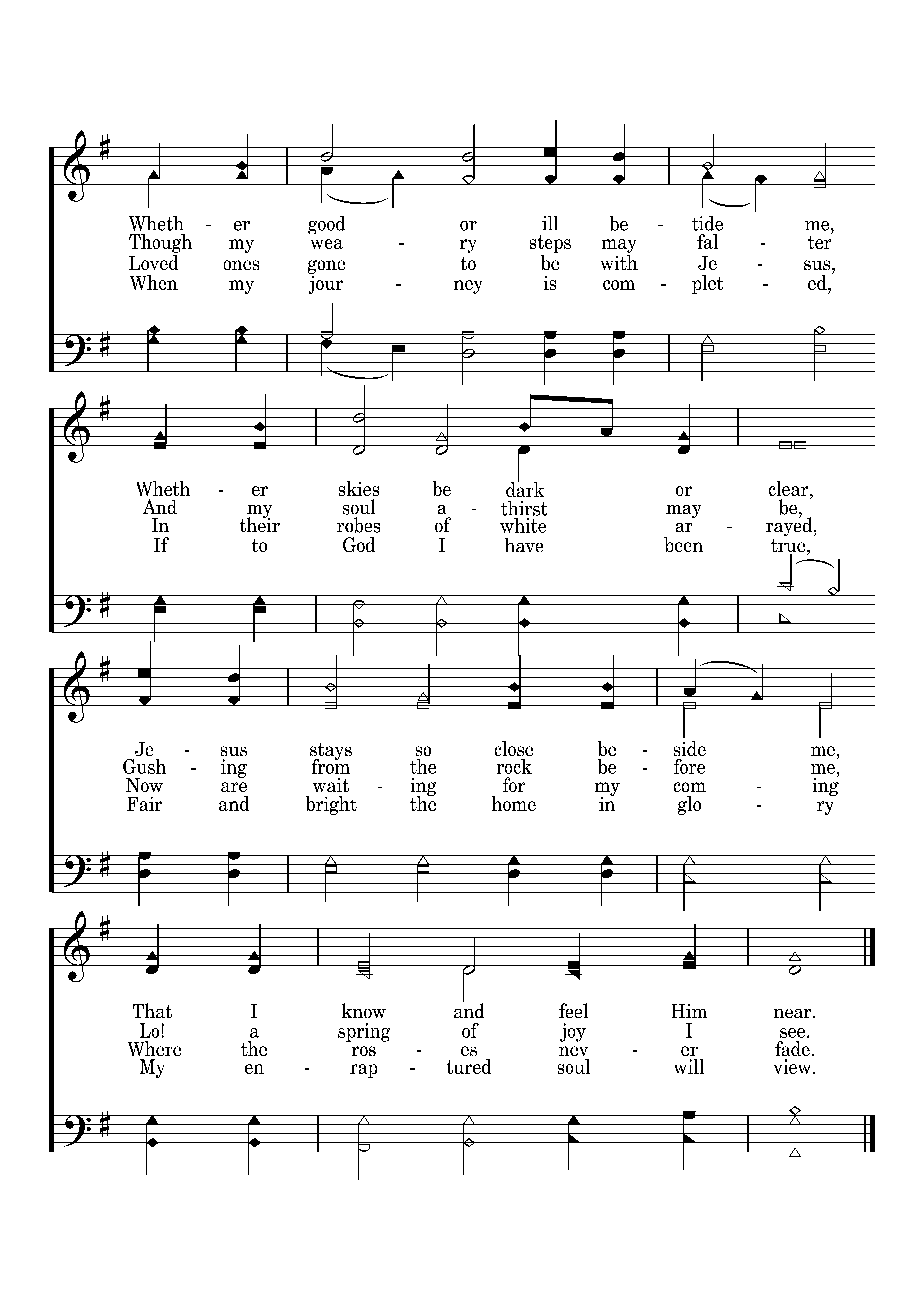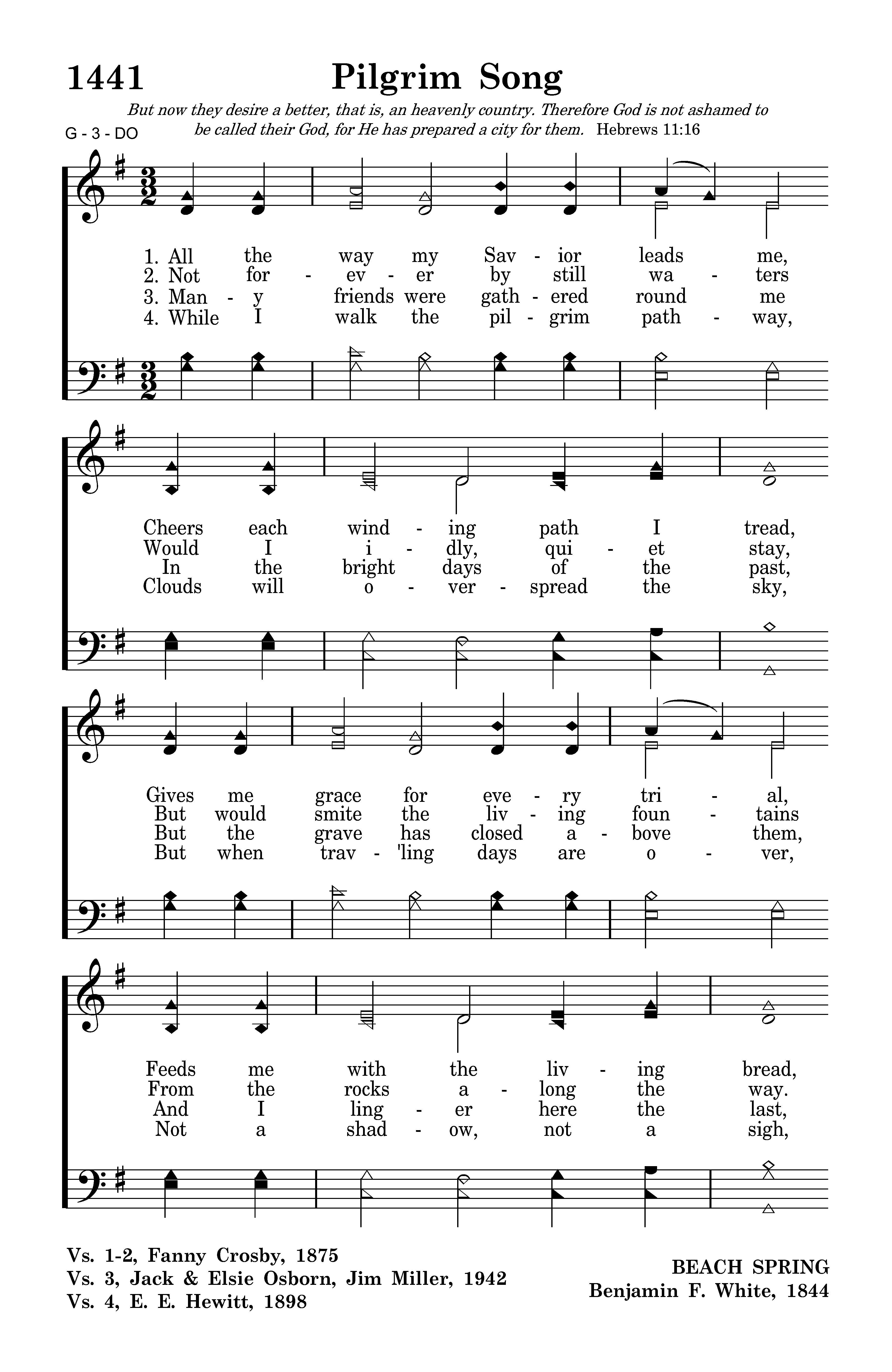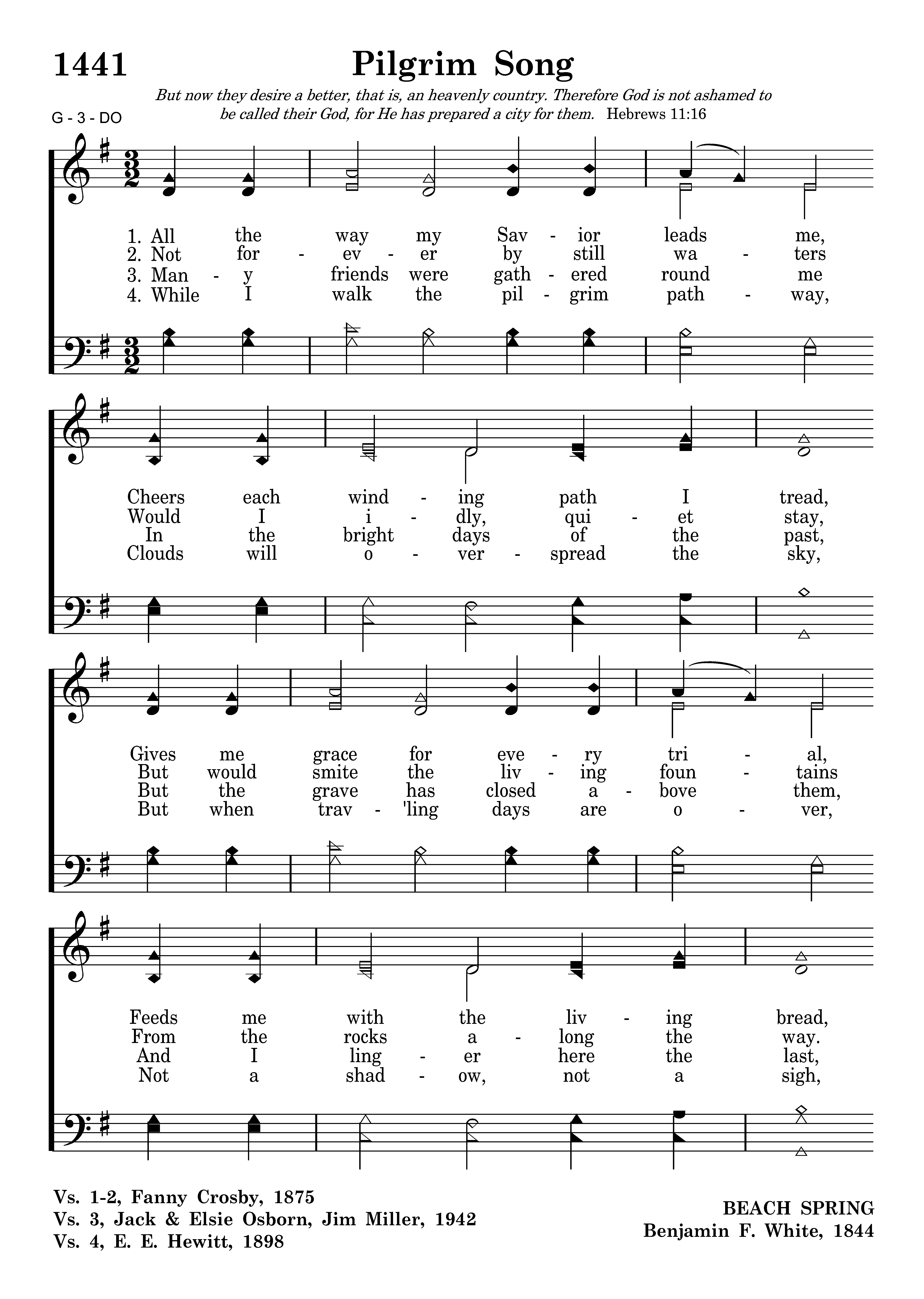 All the way my Savior leads me, Cheers each winding path I tread, Gives me grace for every trial, Feeds me with the living bread, Whether good or ill betide me, Whether skies be dark or clear, Jesus stays so close beside me, That I know and feel Him near.
