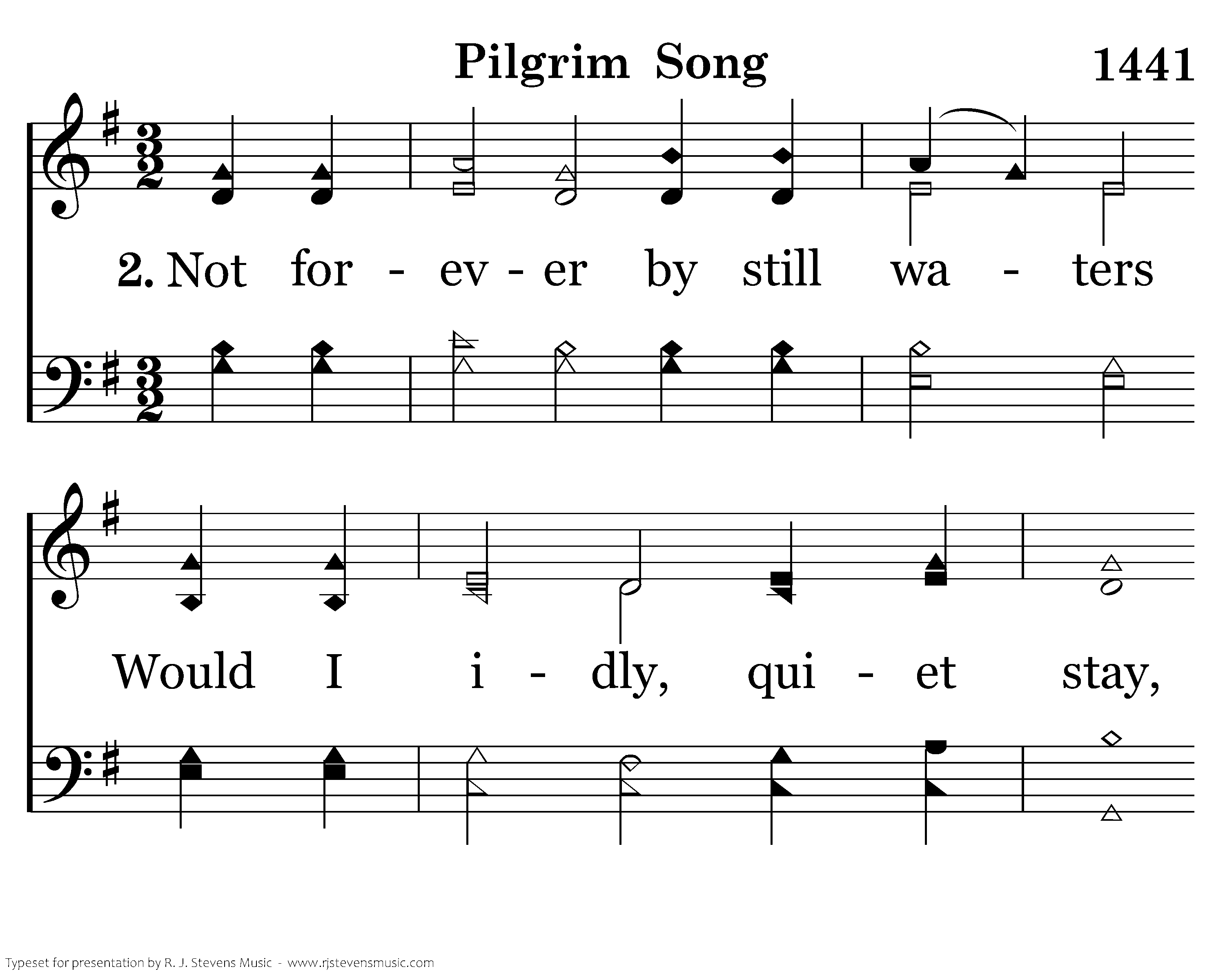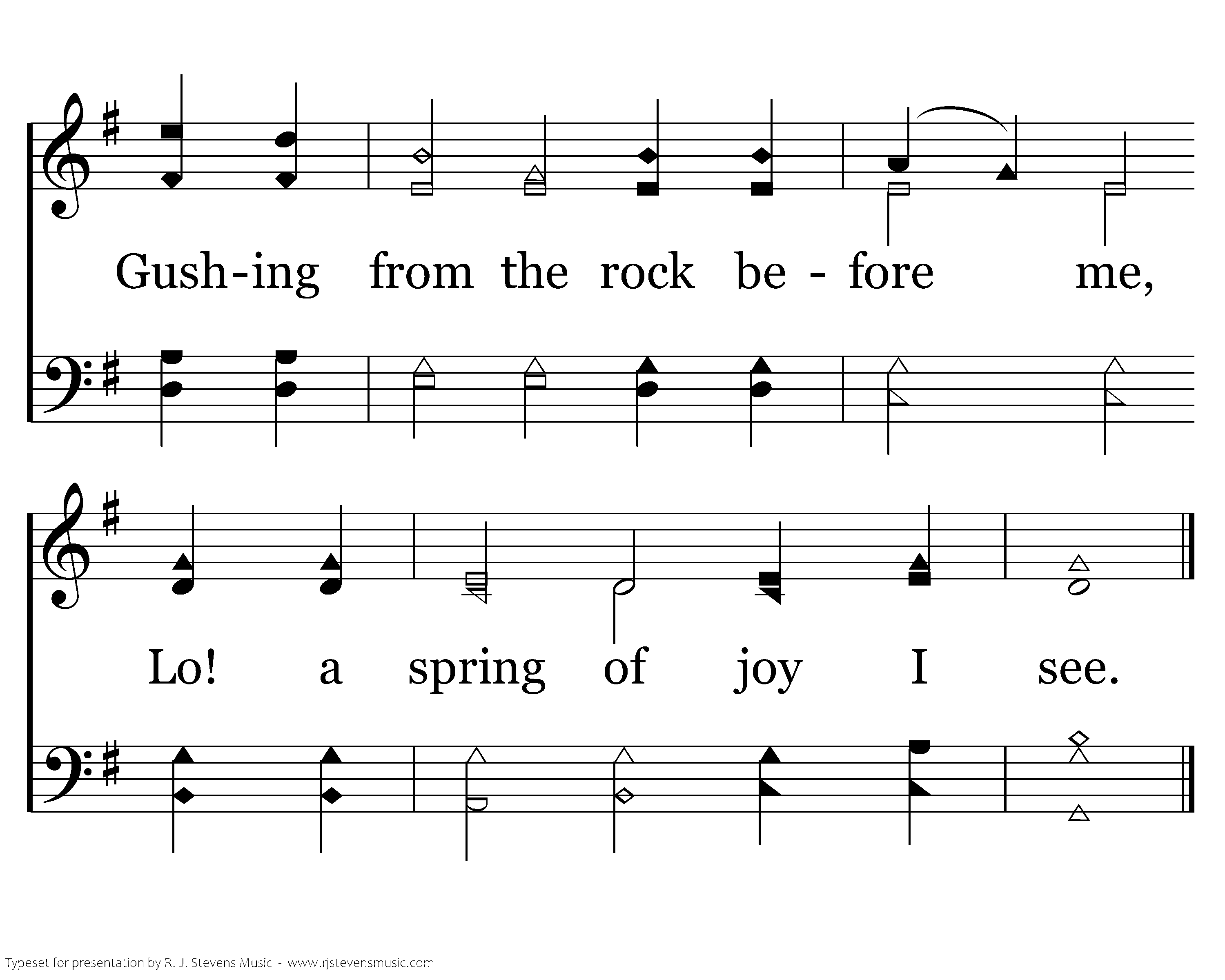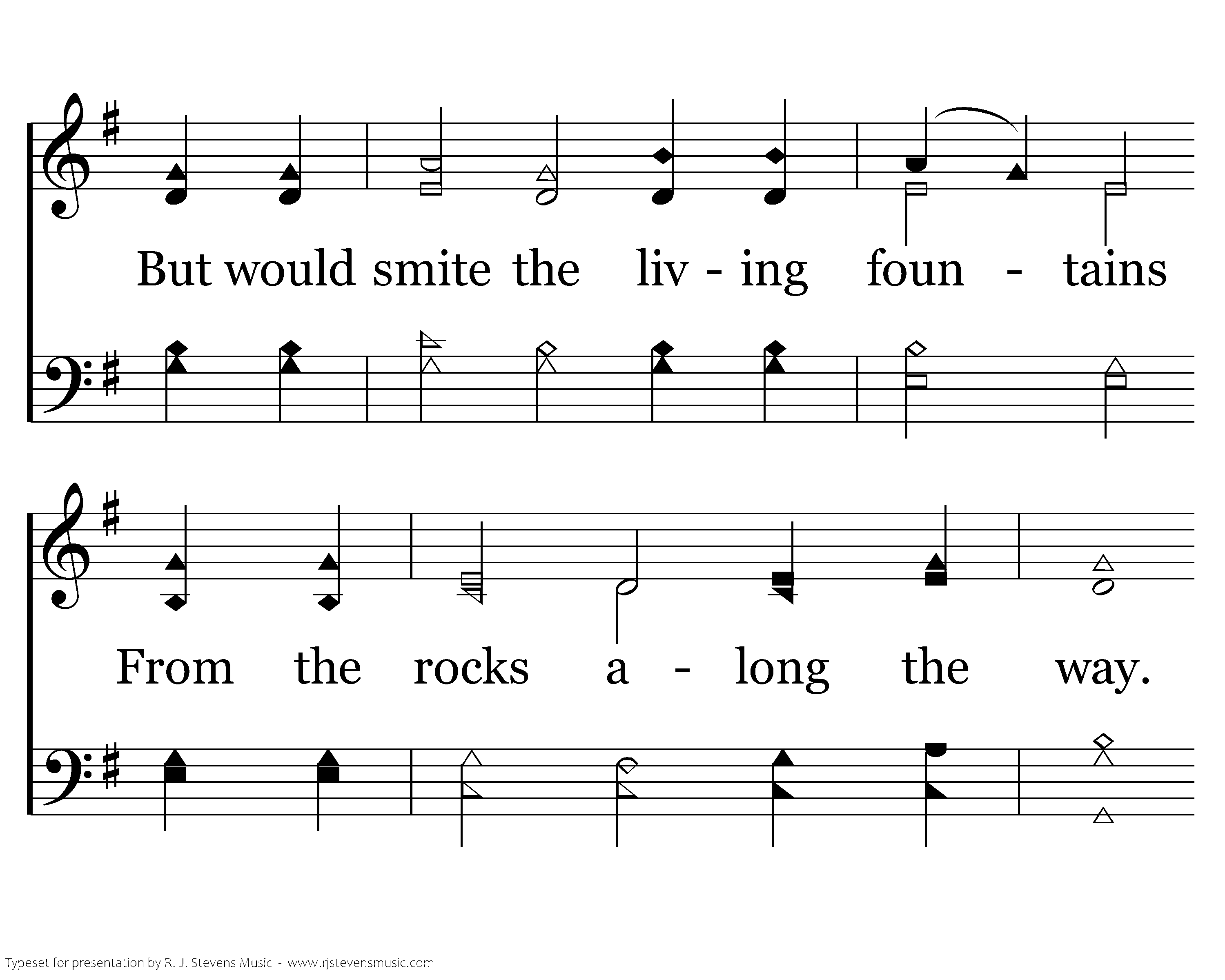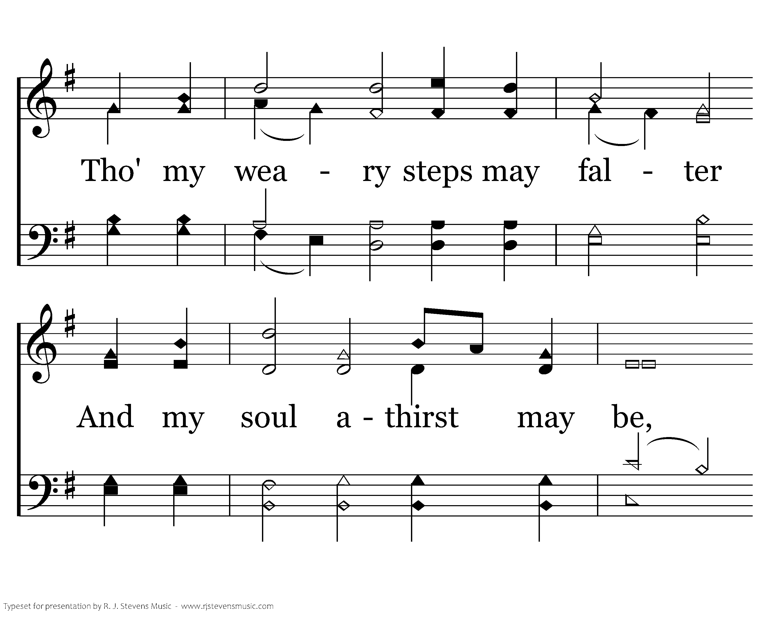 Not forever by still waters Would I idly, quiet stay, But would smite the living fountains From the rocks along the way. Though my weary steps may falter And my soul athirst may be, Gushing from the rock before me, Lo! a spring of joy I see.