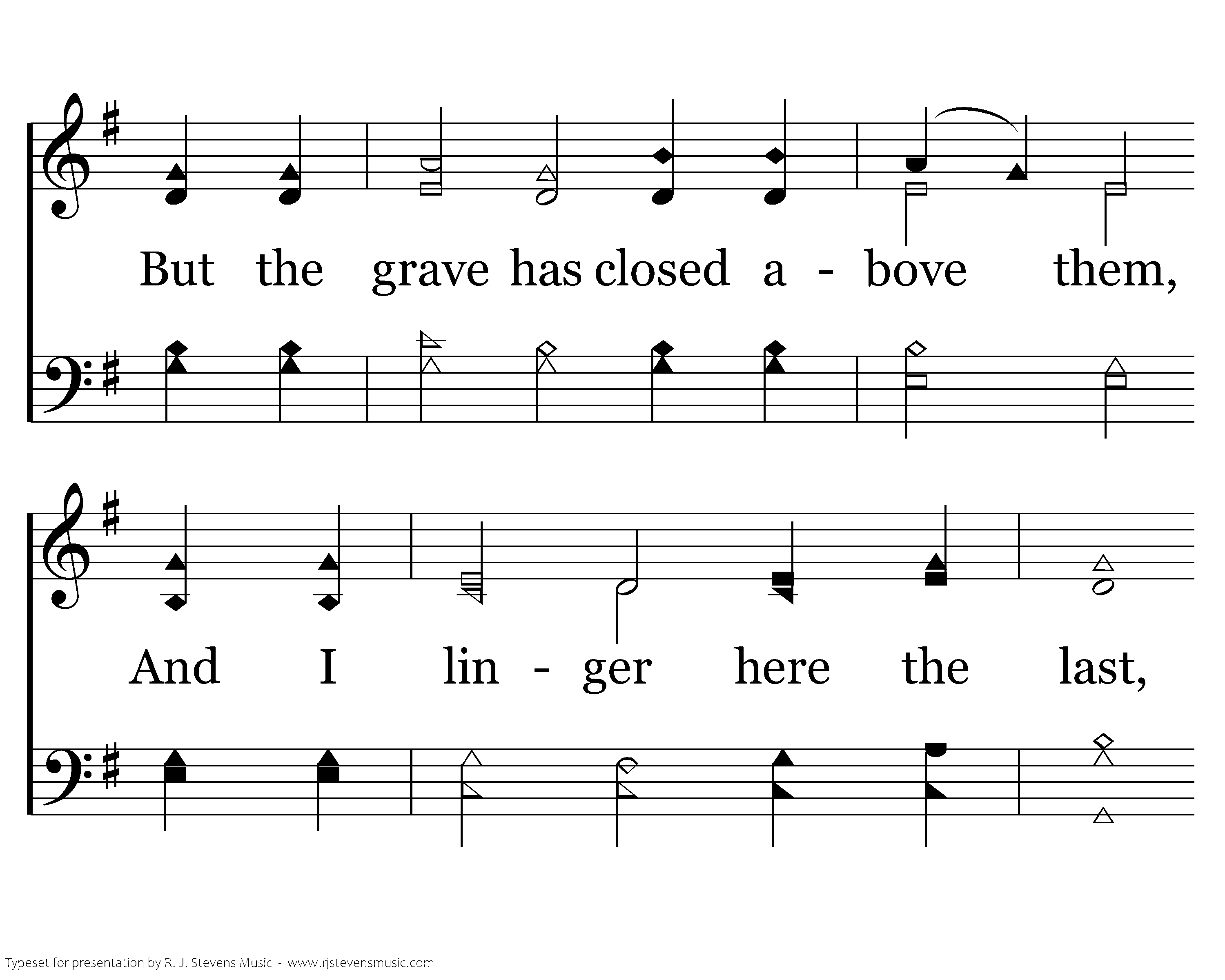 Many friends were gathered round me In the bright days of the past, But the grave has closed above them, And I linger here the last, Loved ones gone to be with Jesus, In their robes of white arrayed, Now are waiting for my coming Where the roses never fade.