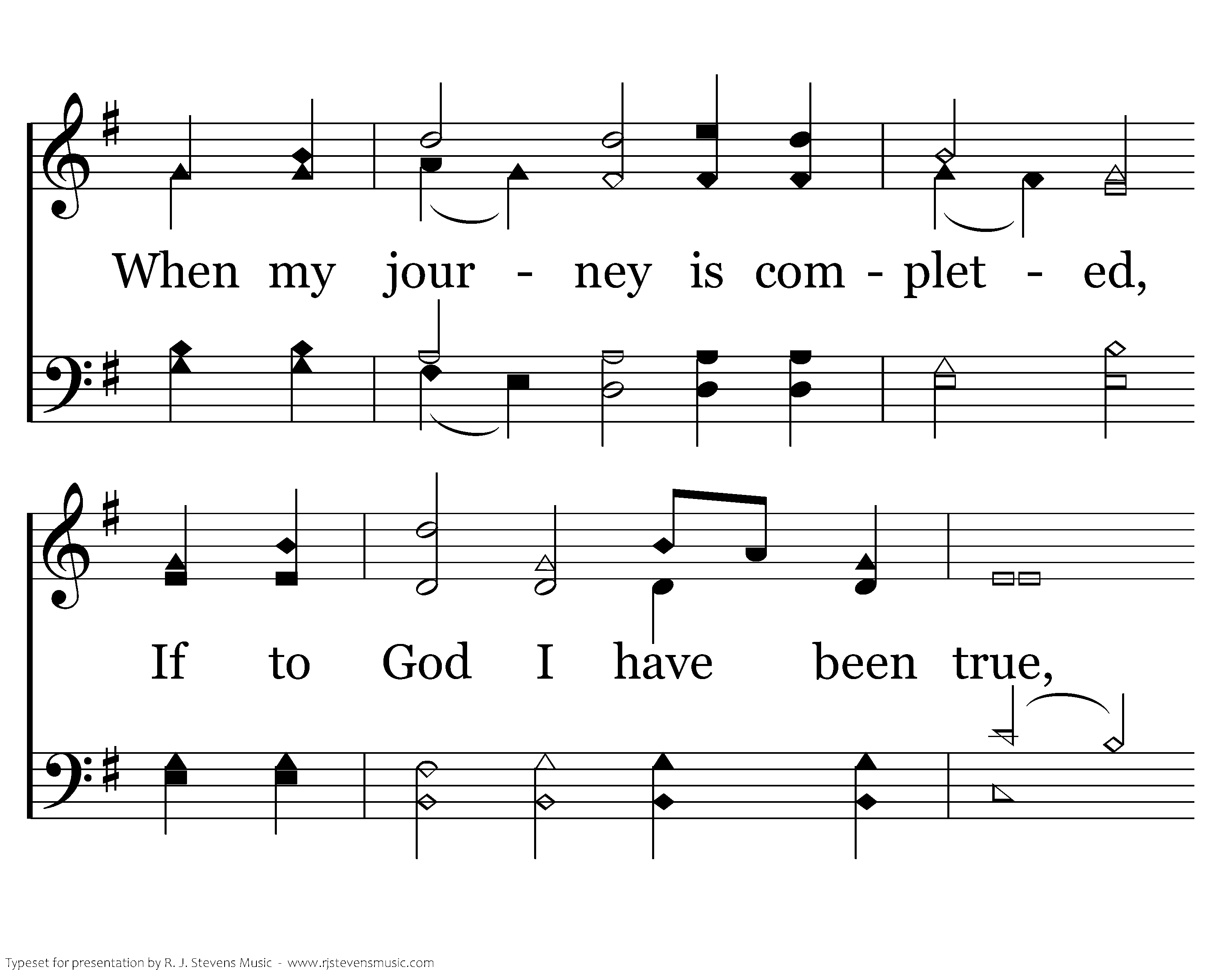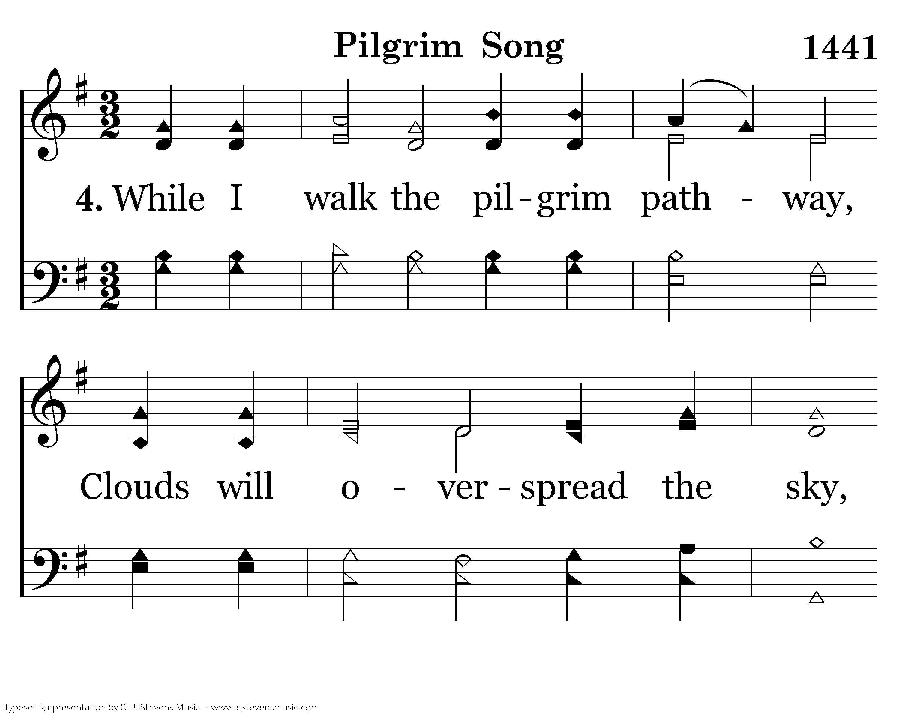 While I walk the pilgrim pathway, Clouds will overspread the sky, But when trav'ling days are over, Not a shadow, not a sigh, When my journey is completed, If to God I have been true, Fair and bright the home in glory My enraptured soul will view.