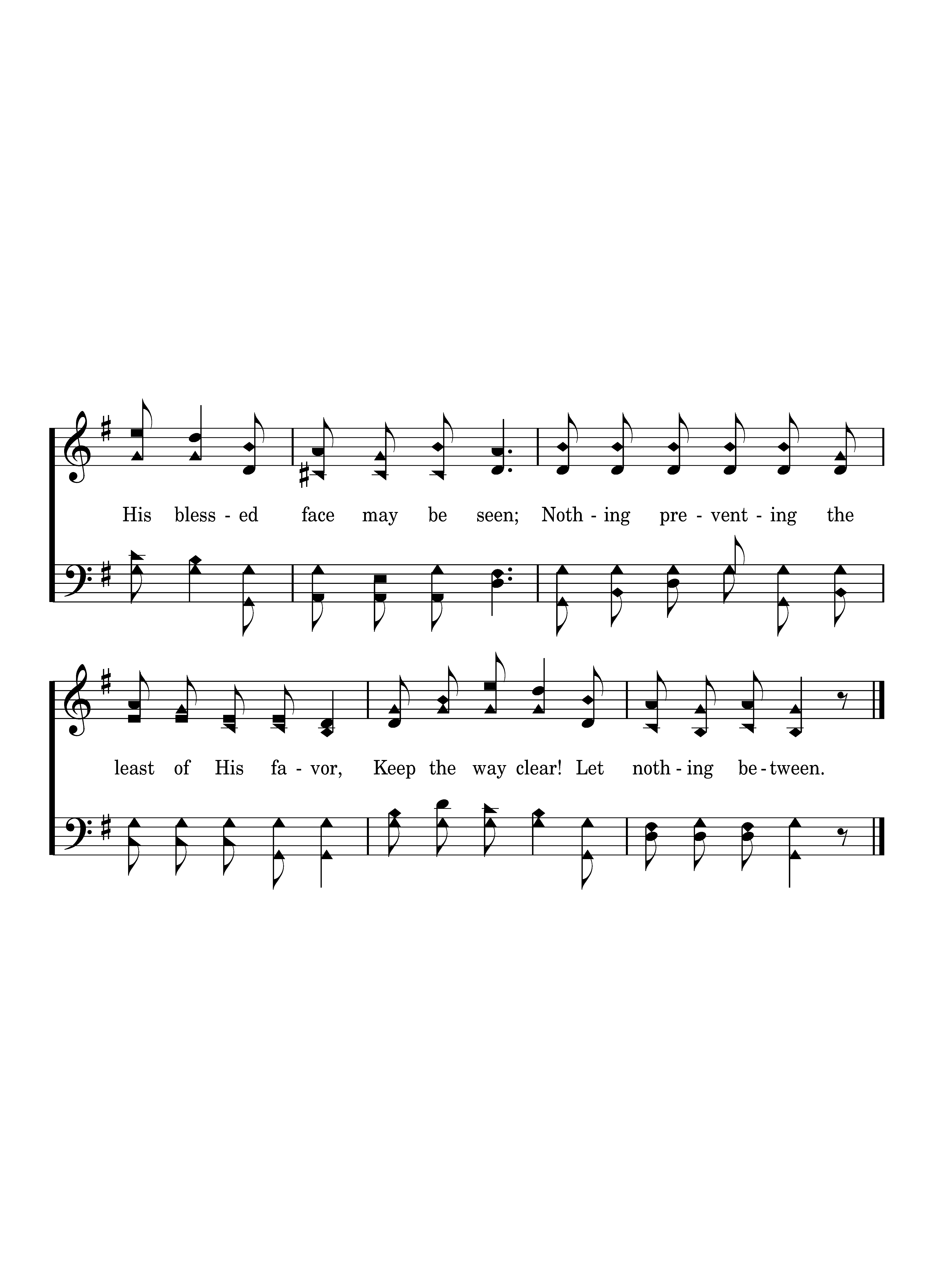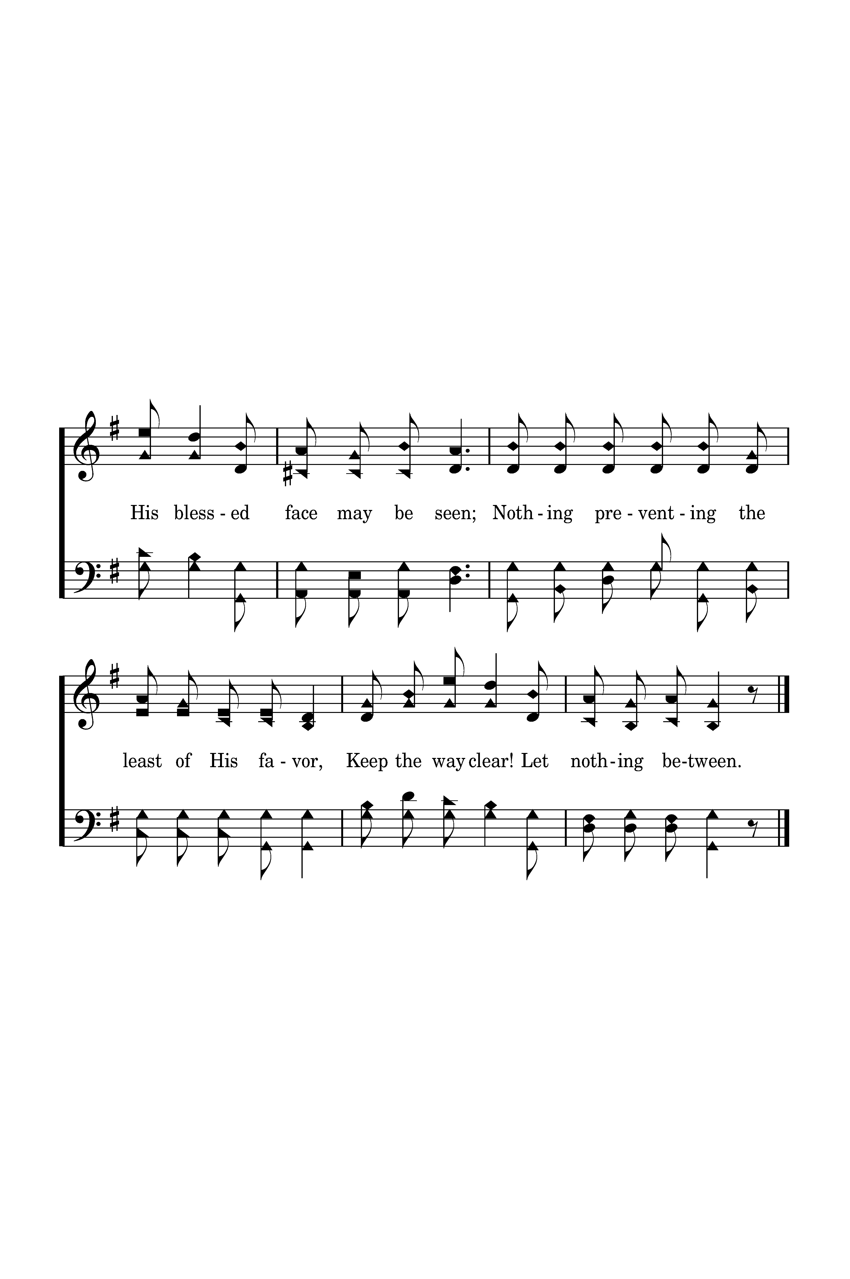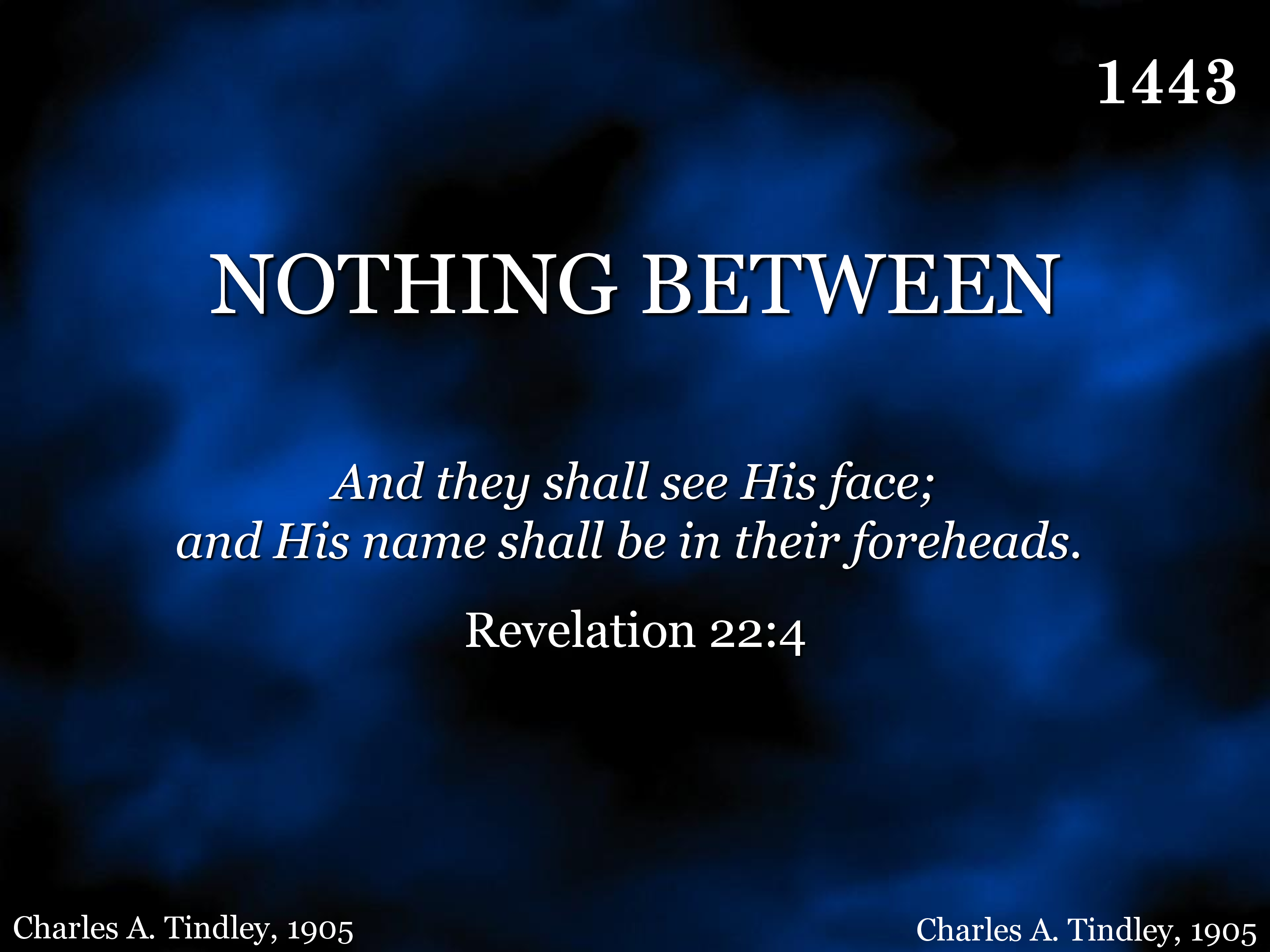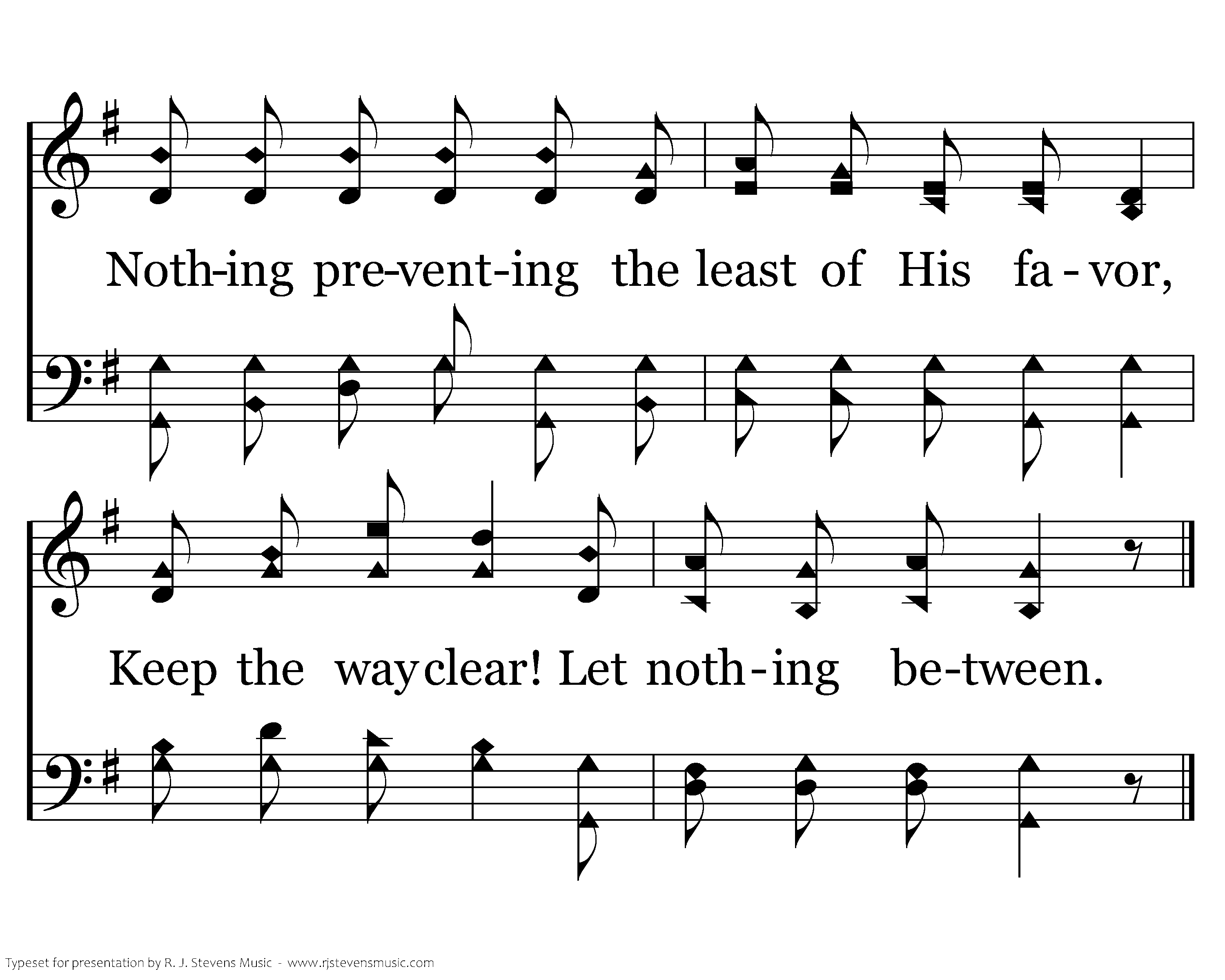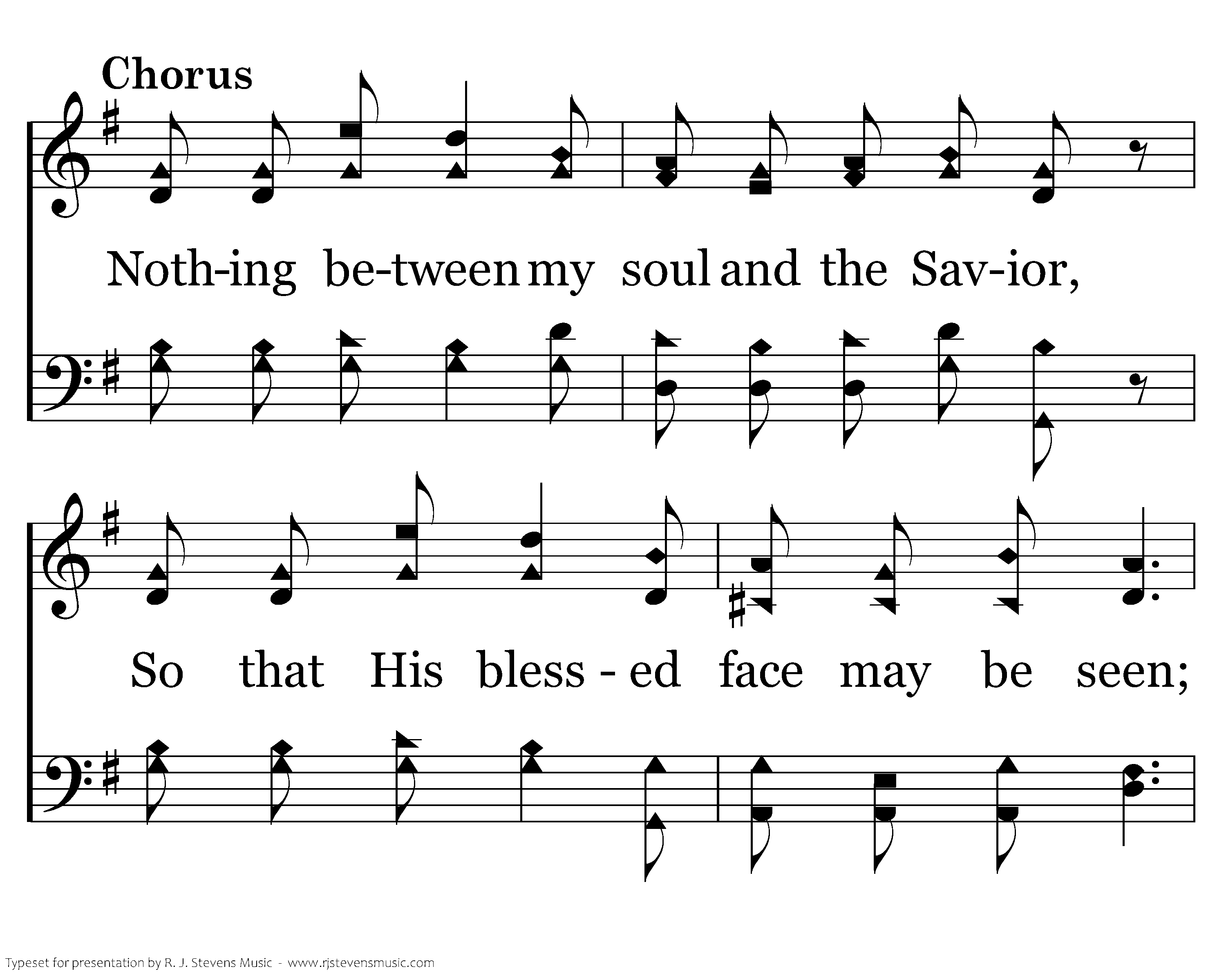 Nothing between my soul and the Savior, So that His blessed face may be seen; Nothing preventing the least of His favor, Keep the way clear! Let nothing between.