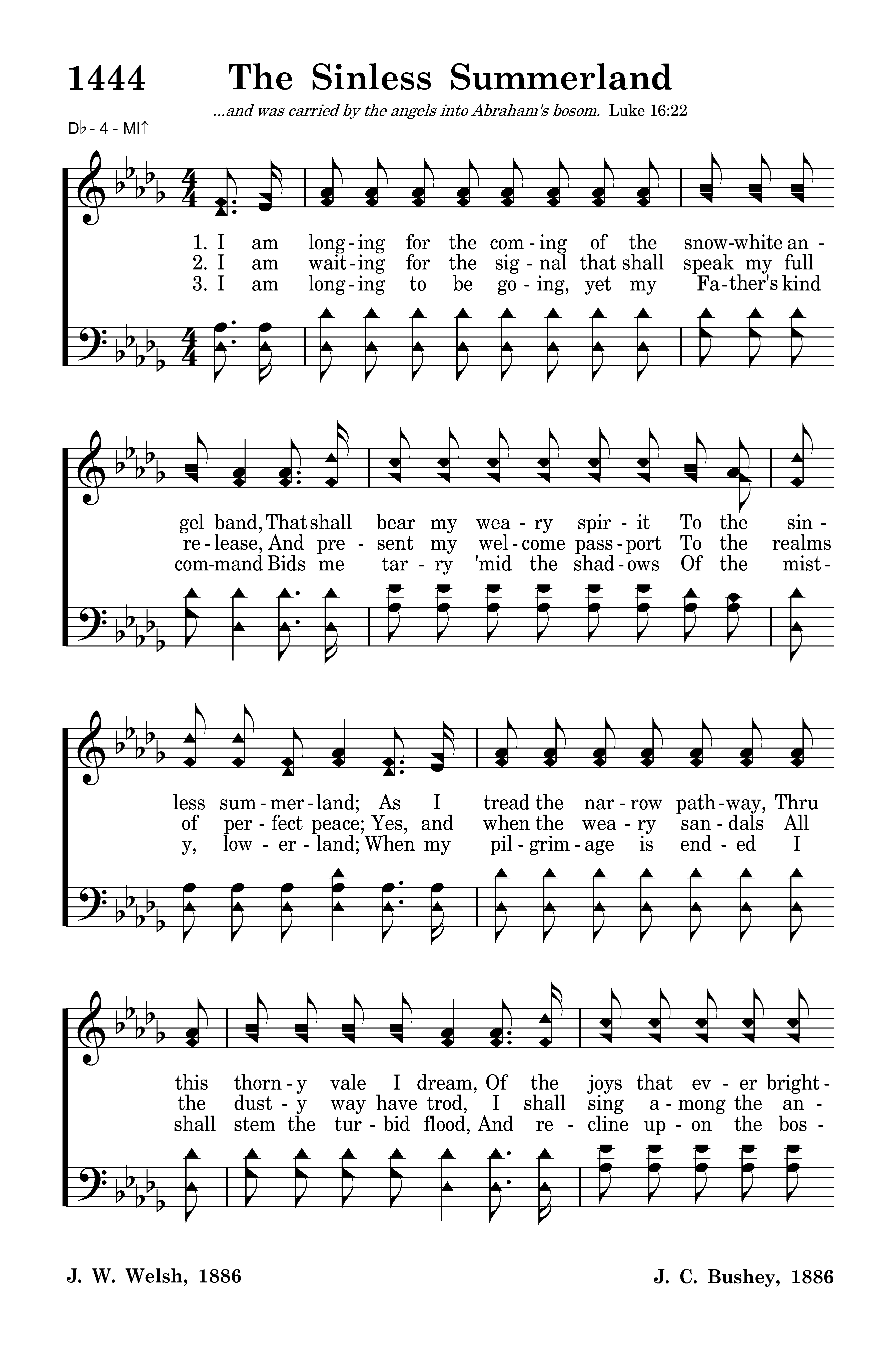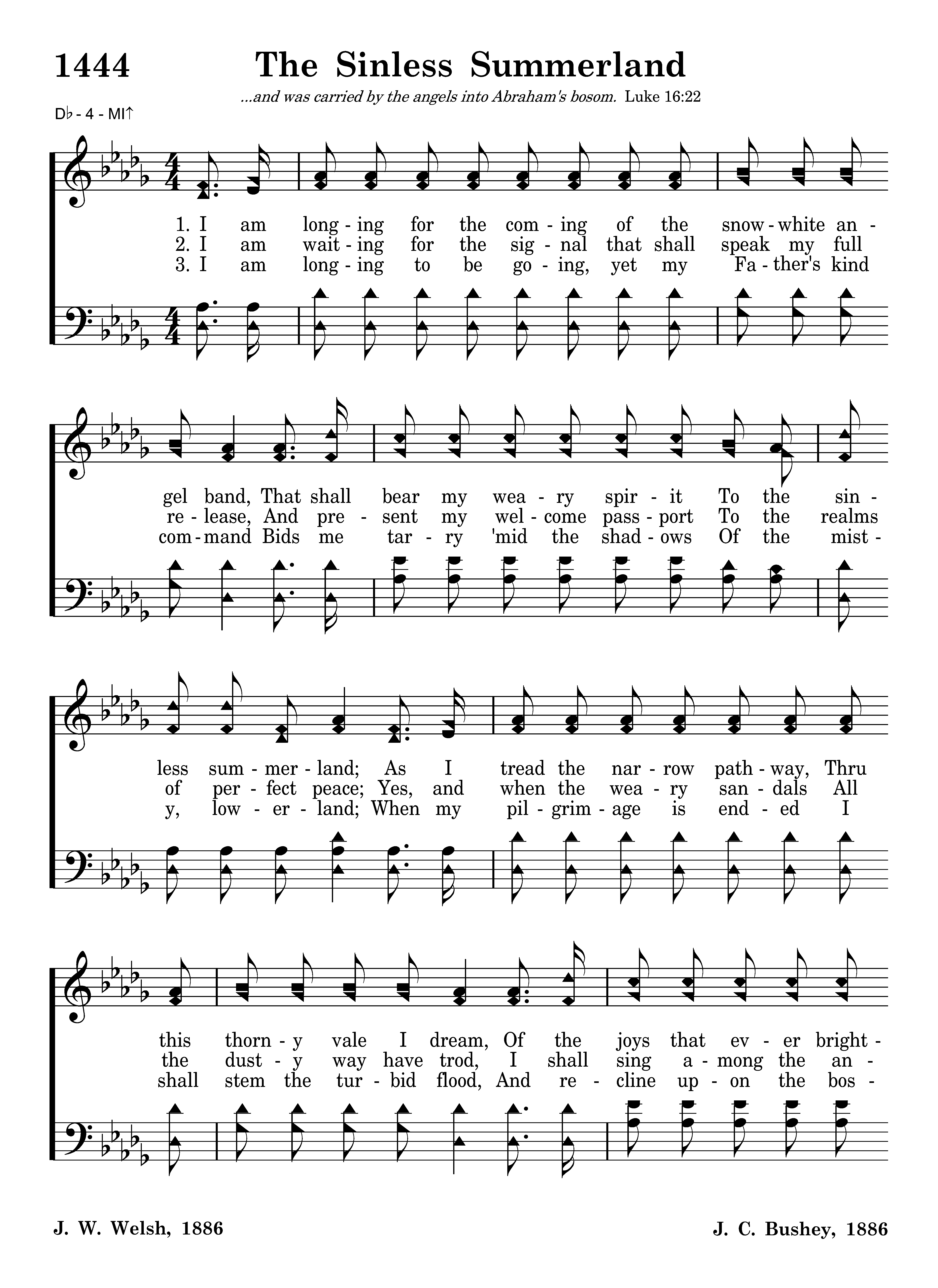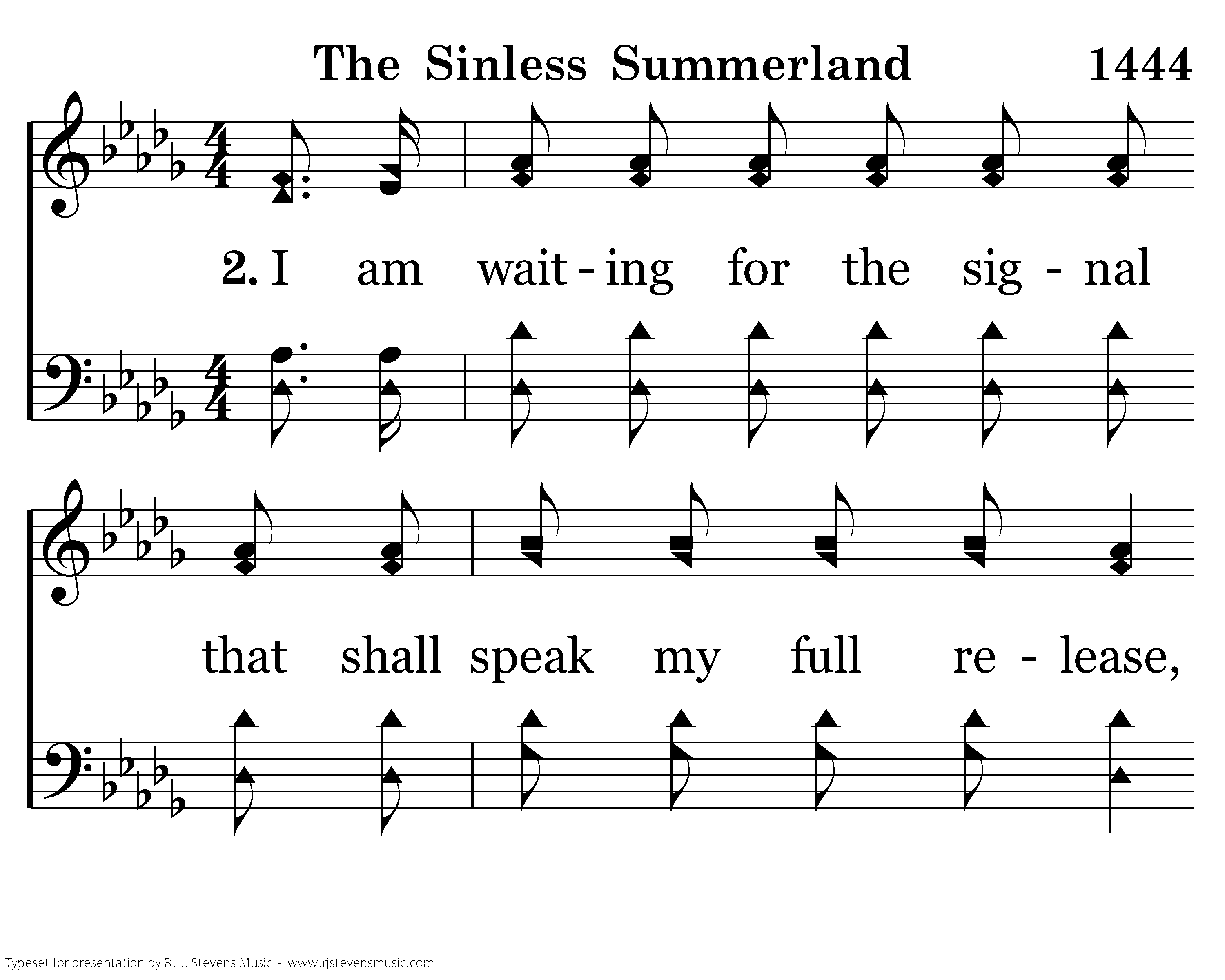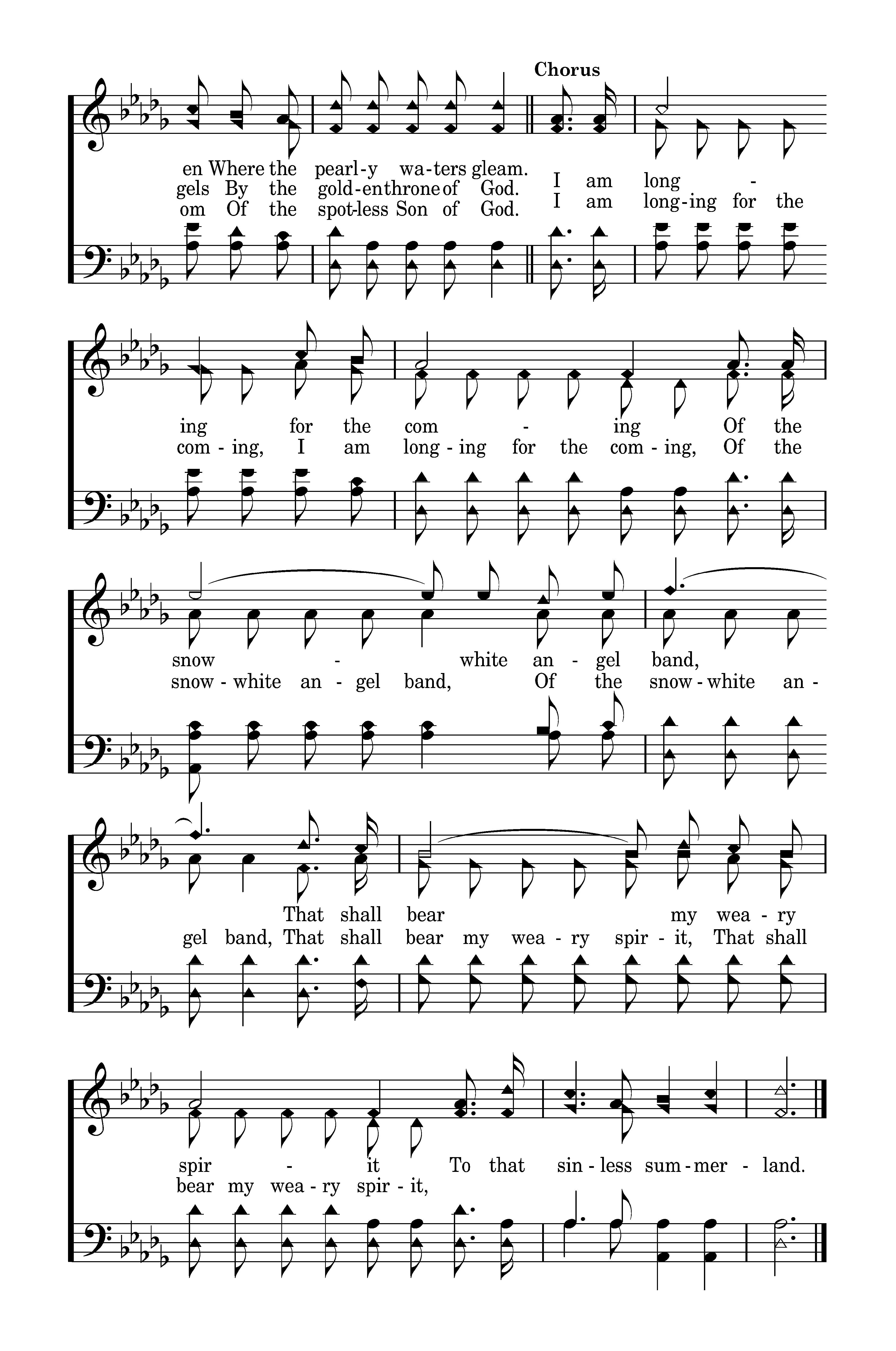 I am longing for the coming of the snowwhite angel band, That shall bear my weary spirit To the sinless summerland; As I tread the narrow pathway, Thru this thorny vale I dream, Of the joys that ever brighten Where the pearly waters gleam.