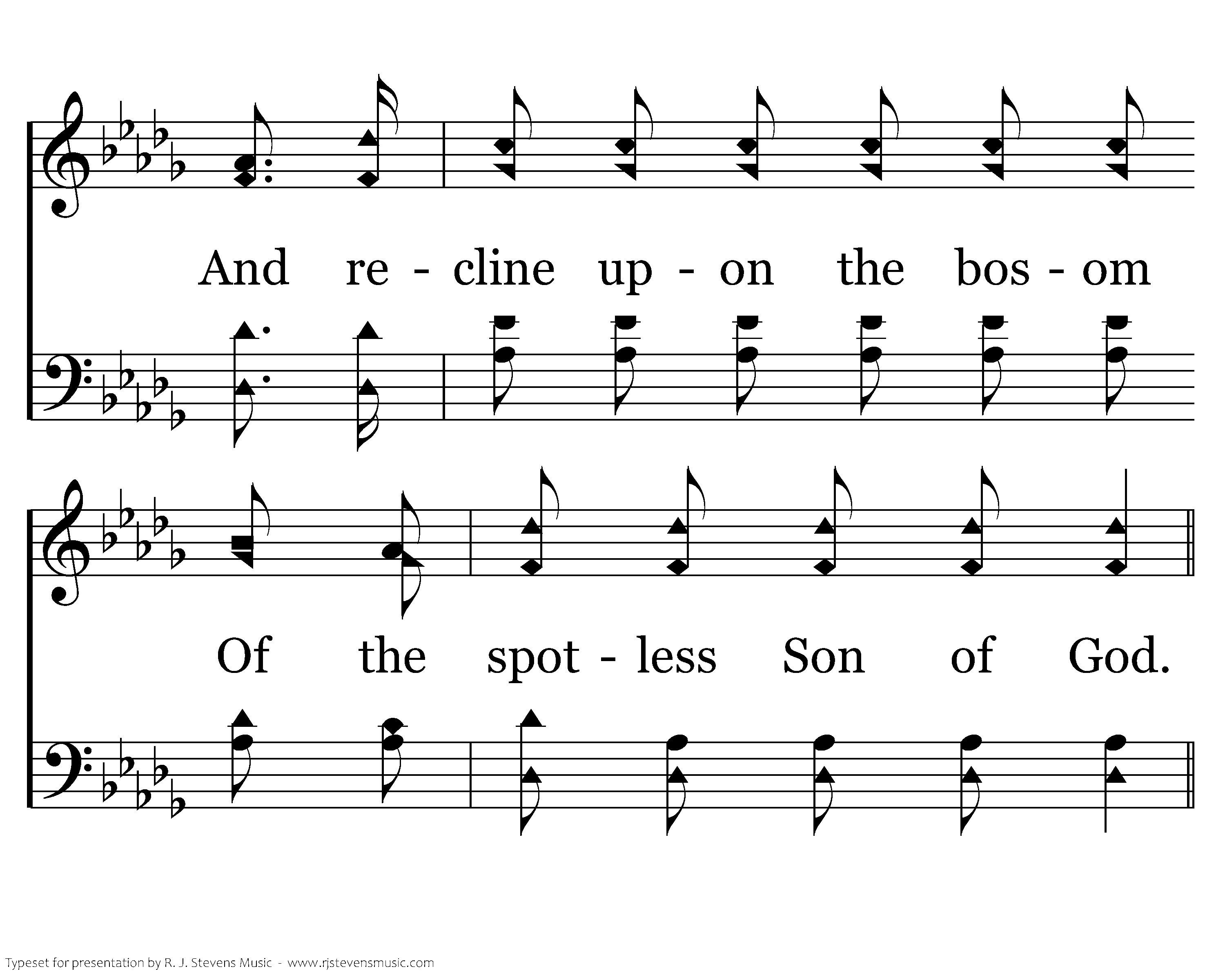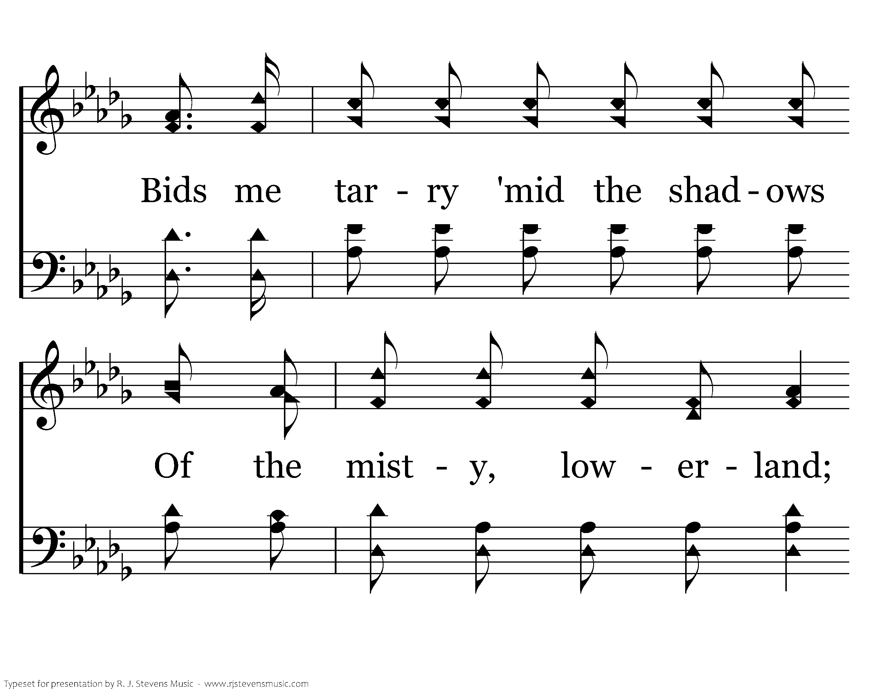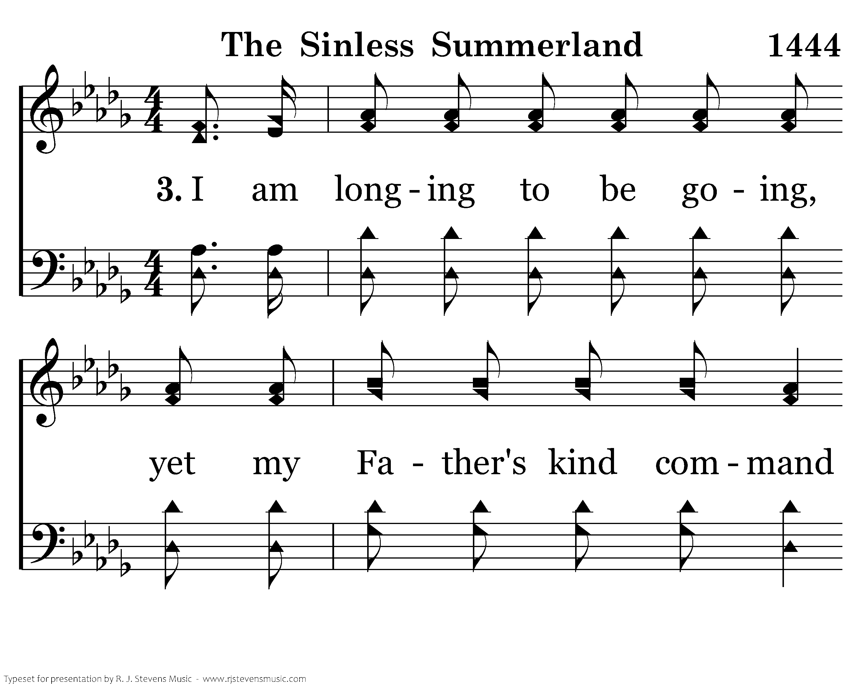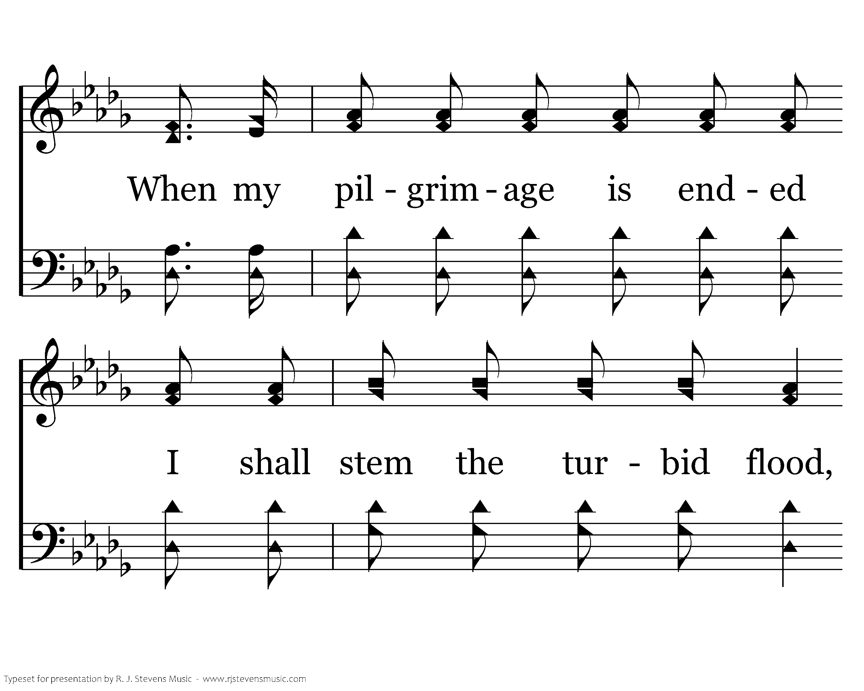 I am longing to be going, yet my Father's kind command Bids me tarry 'mid the shadows Of the misty, lowerland; When my pilgrimage is ended I shall stem the turbid flood, And recline upon the bosom Of the spotless Son of God.