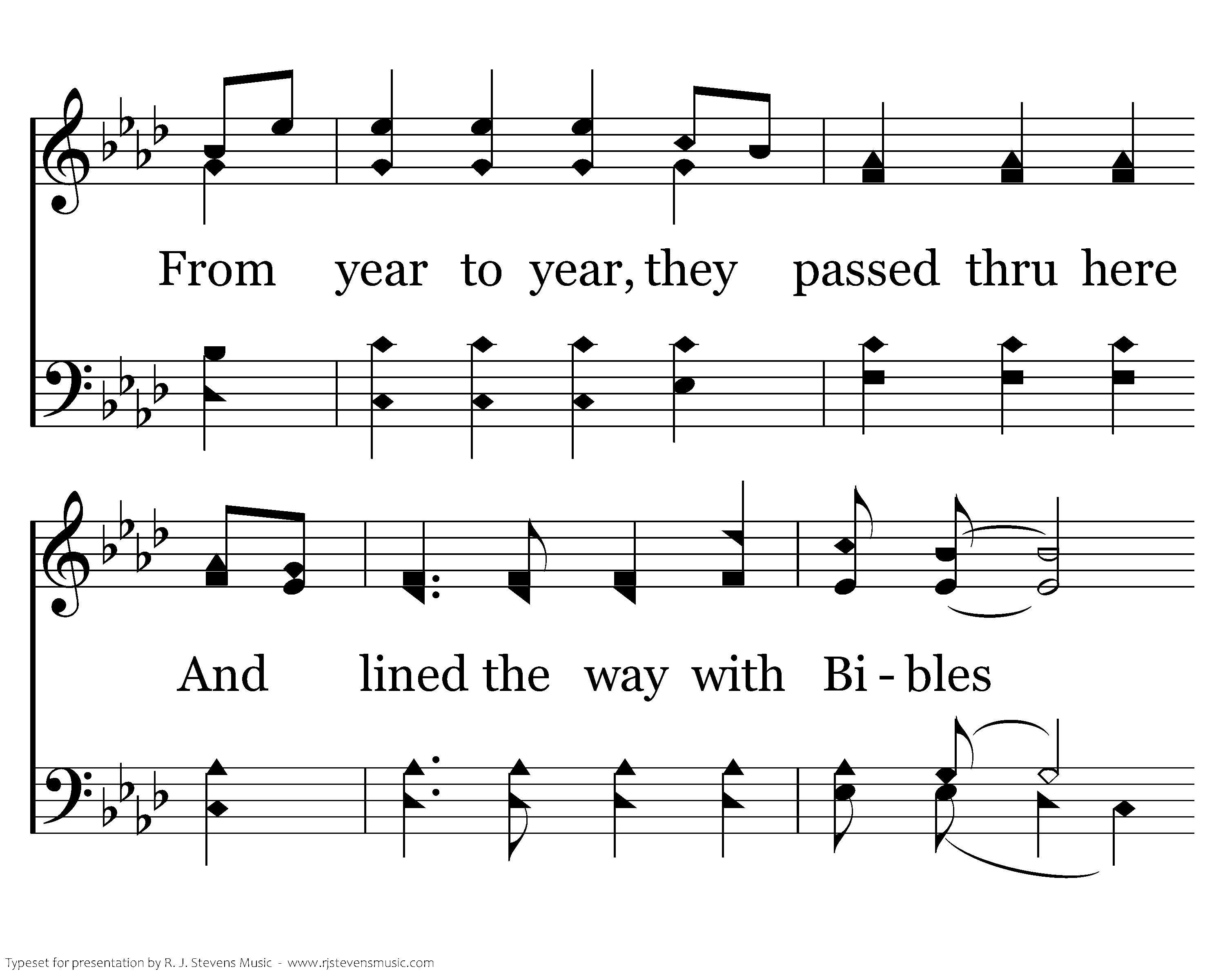 Ahead are dear disciples Who walked this very ground; From year to year, they passed through here And lined the way with Bibles To mark the path they found.