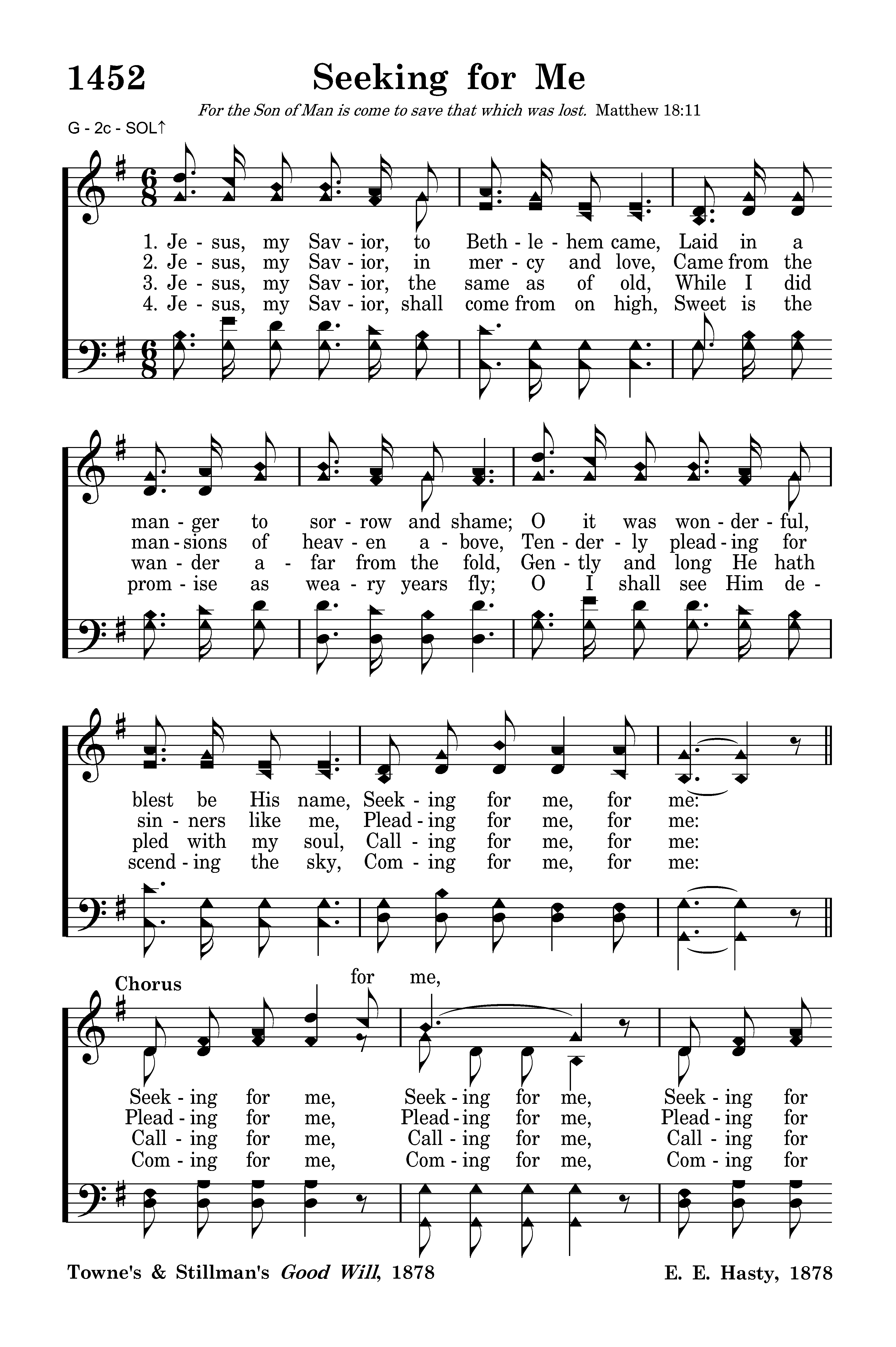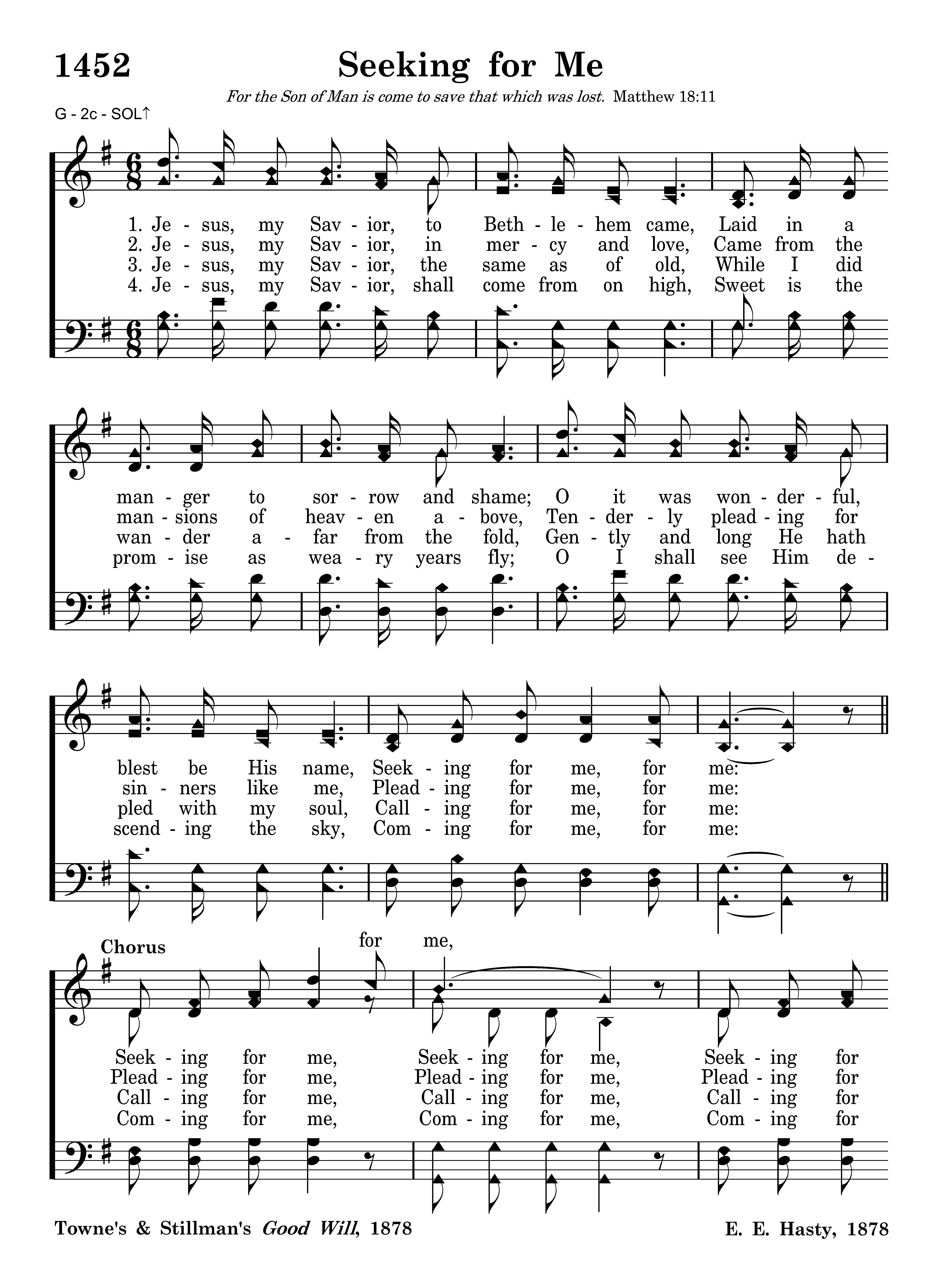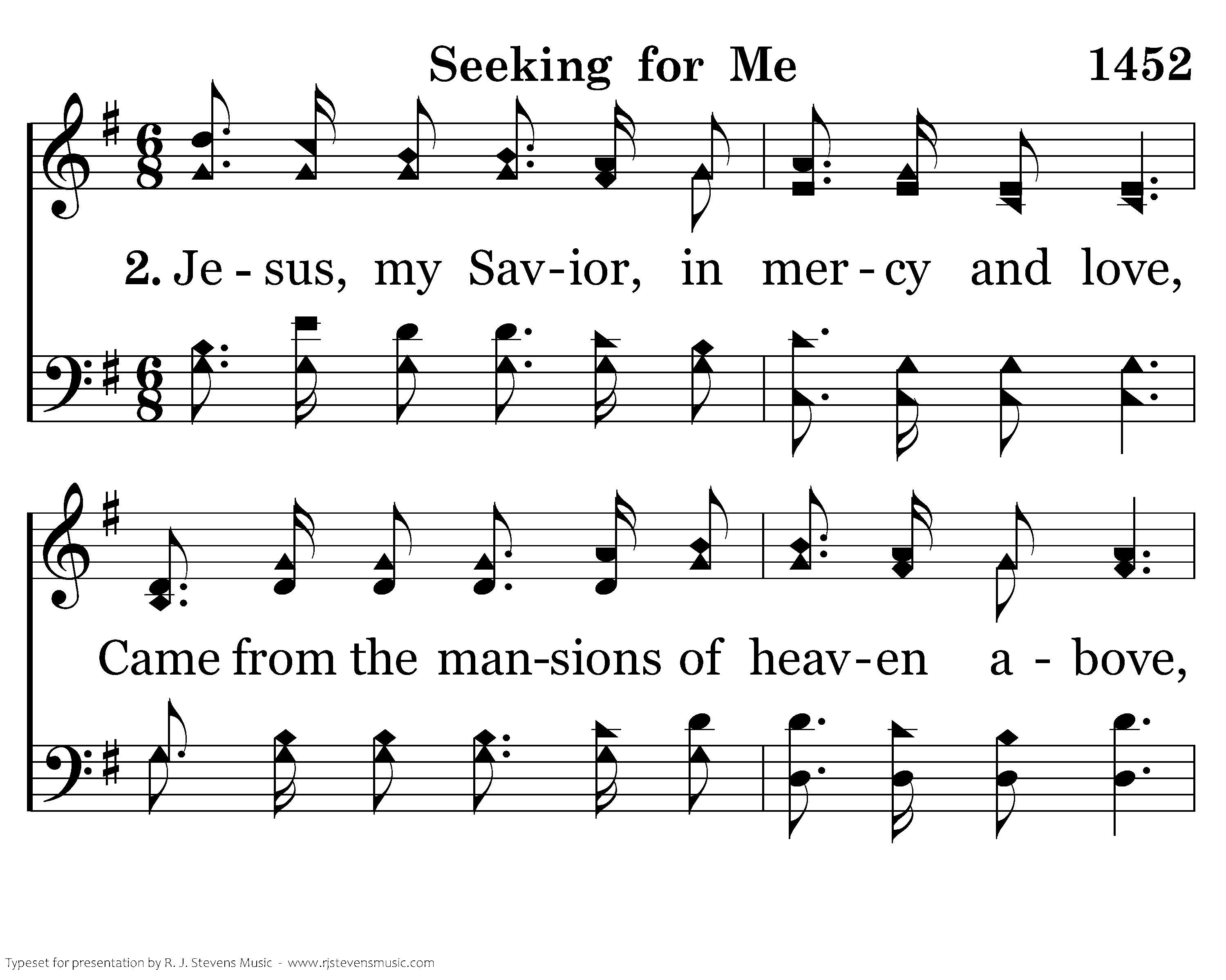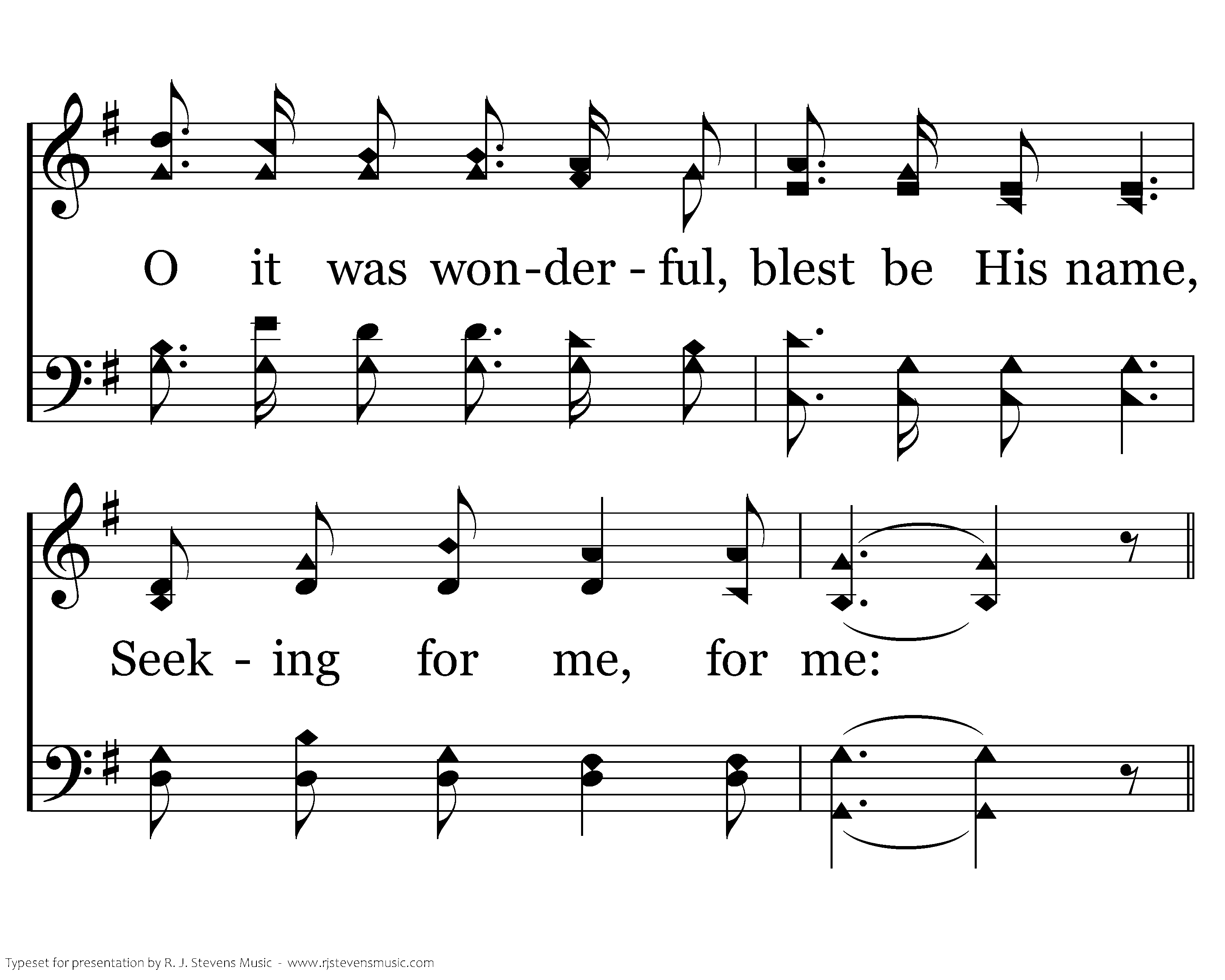 Jesus, my Savior, to Bethlehem came, Laid in a manger to sorrow and shame; O it was wonderful, blest be His name, Seeking for me, for me: Seeking for me, Seeking for me, Seeking for me, Seeking for me: O it was wonderful, blest be His name, Seeking for me, for me.