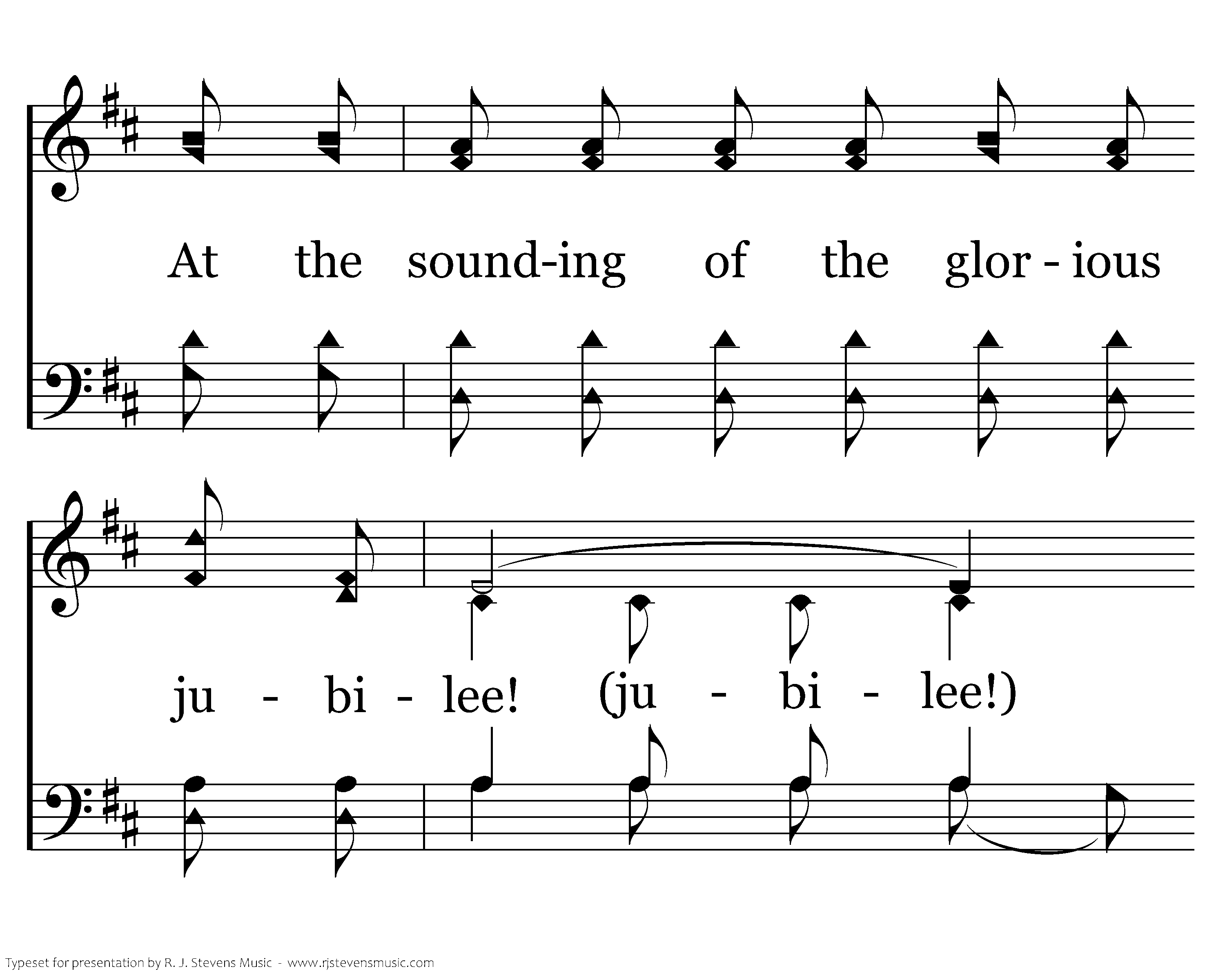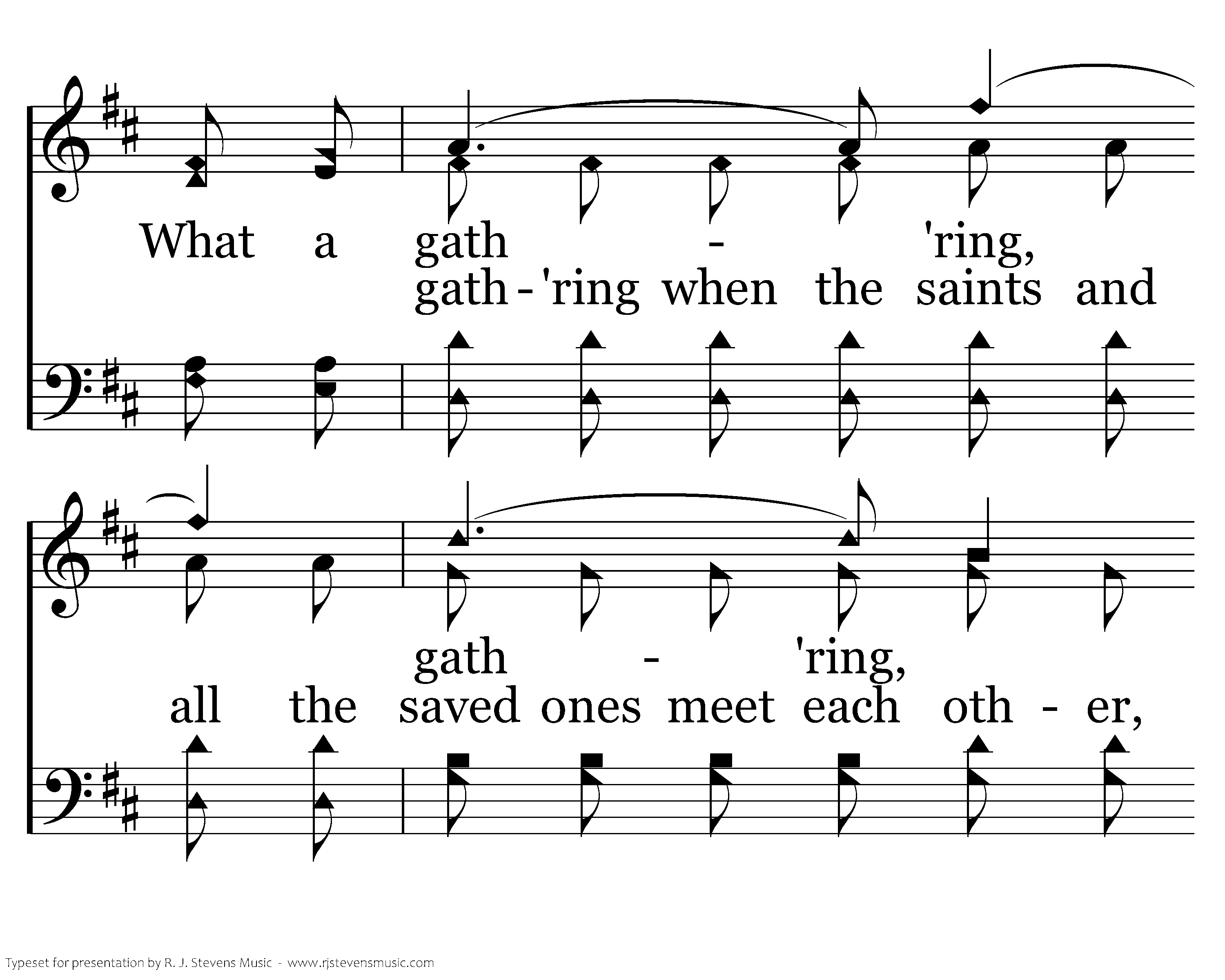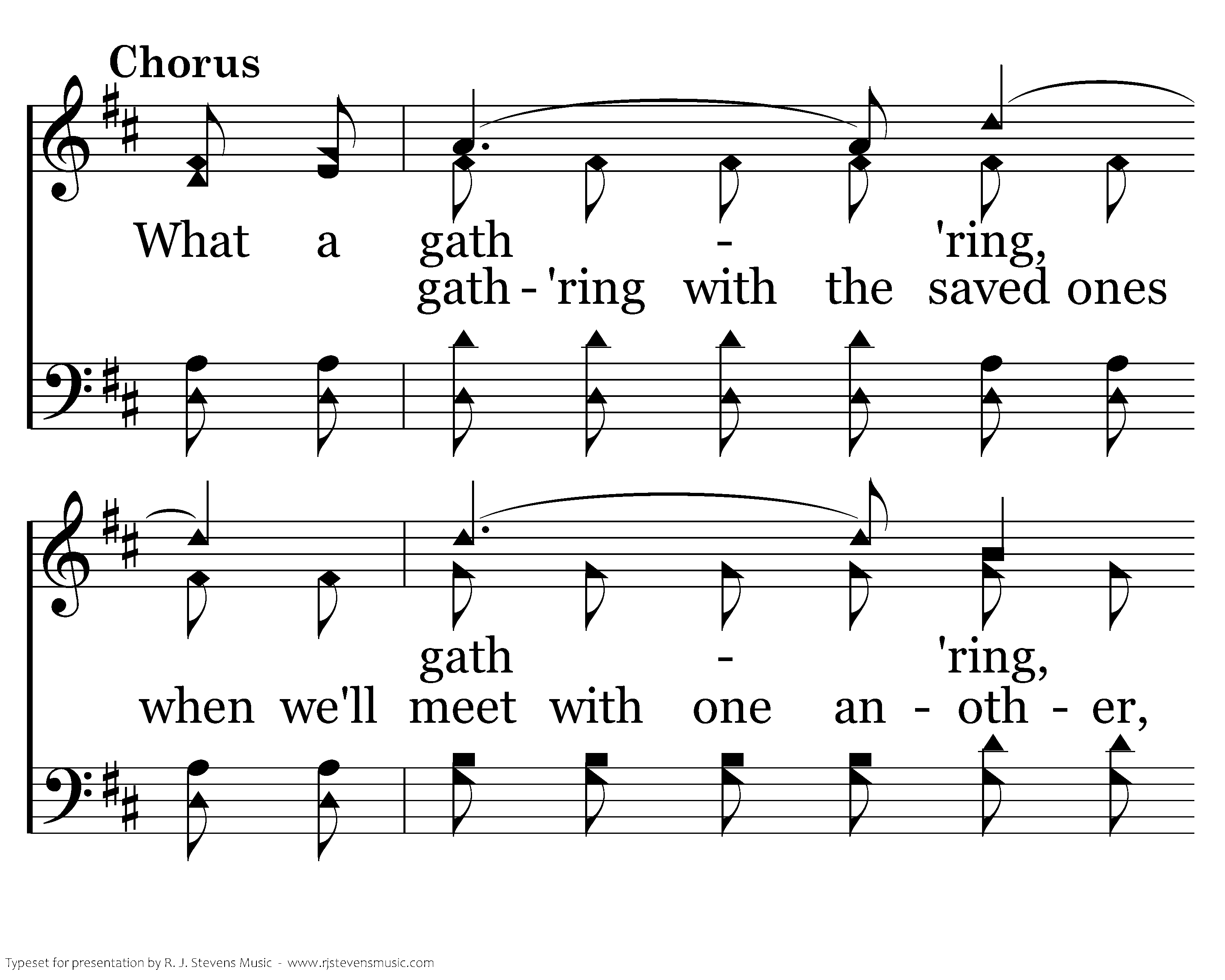 What a gath'ring, gath'ring, At the sounding of the glorious jubilee! What a gath'ring, gath'ring, What a gath'ring of the faithful that will be!