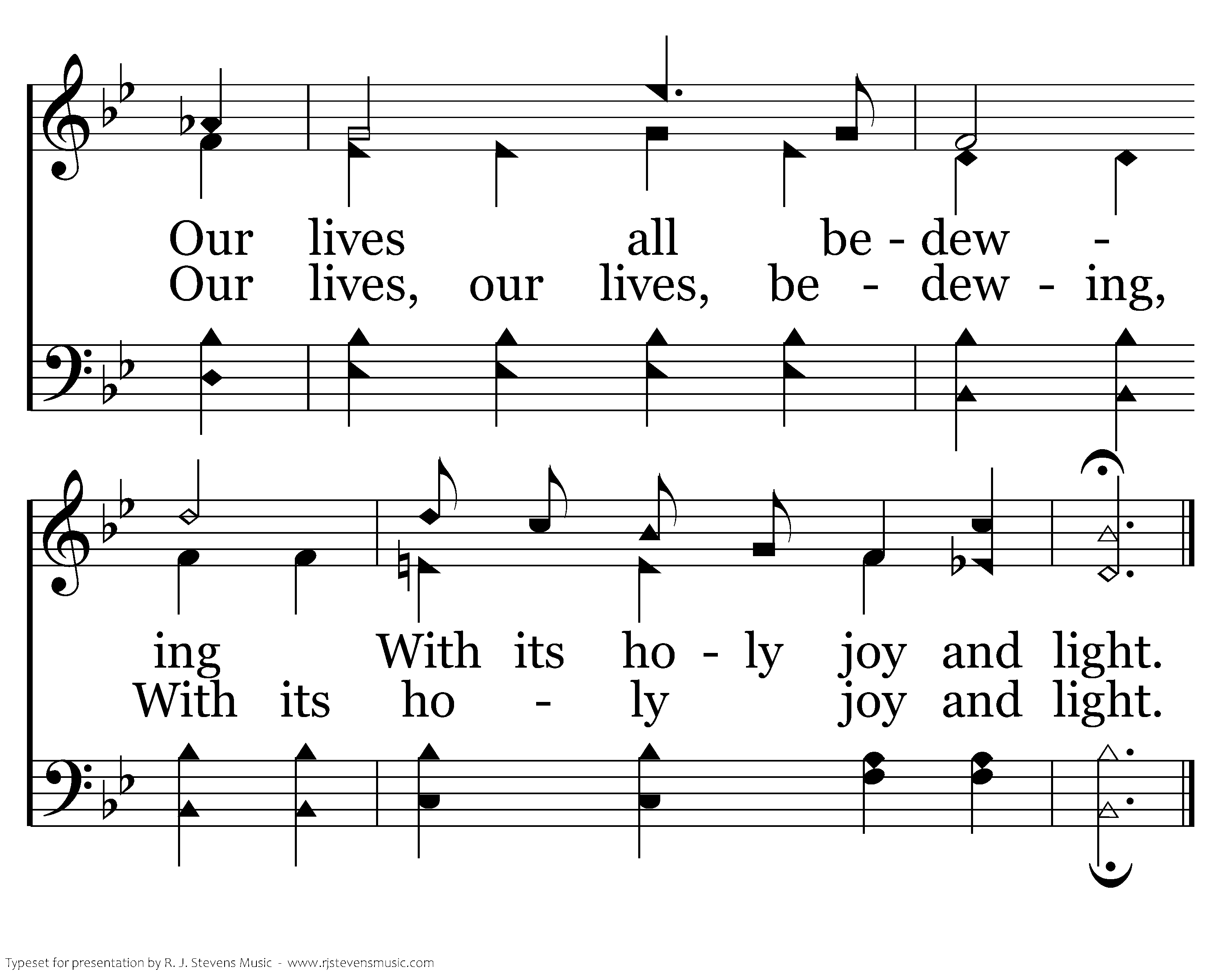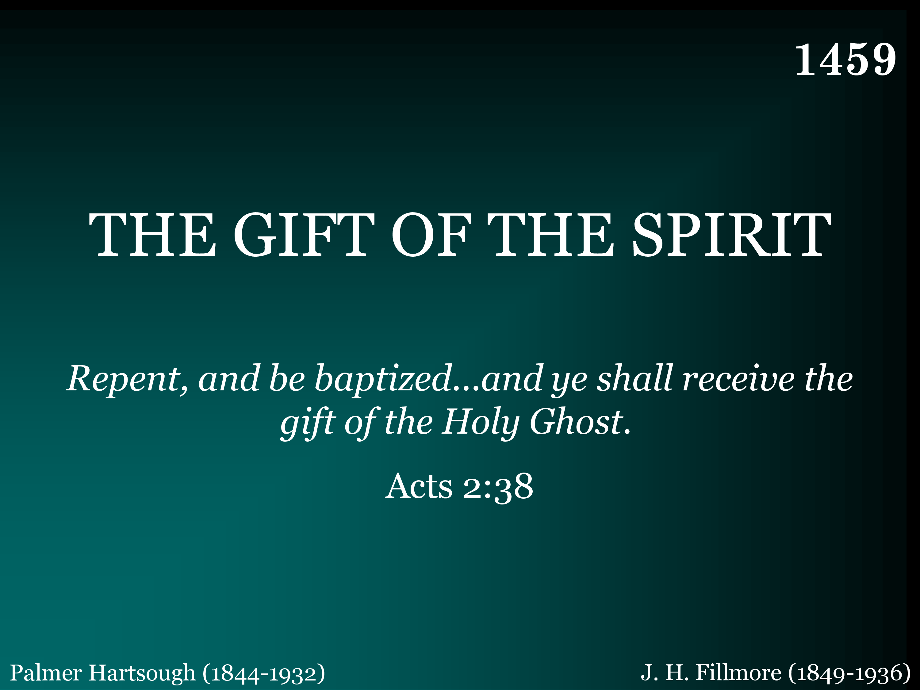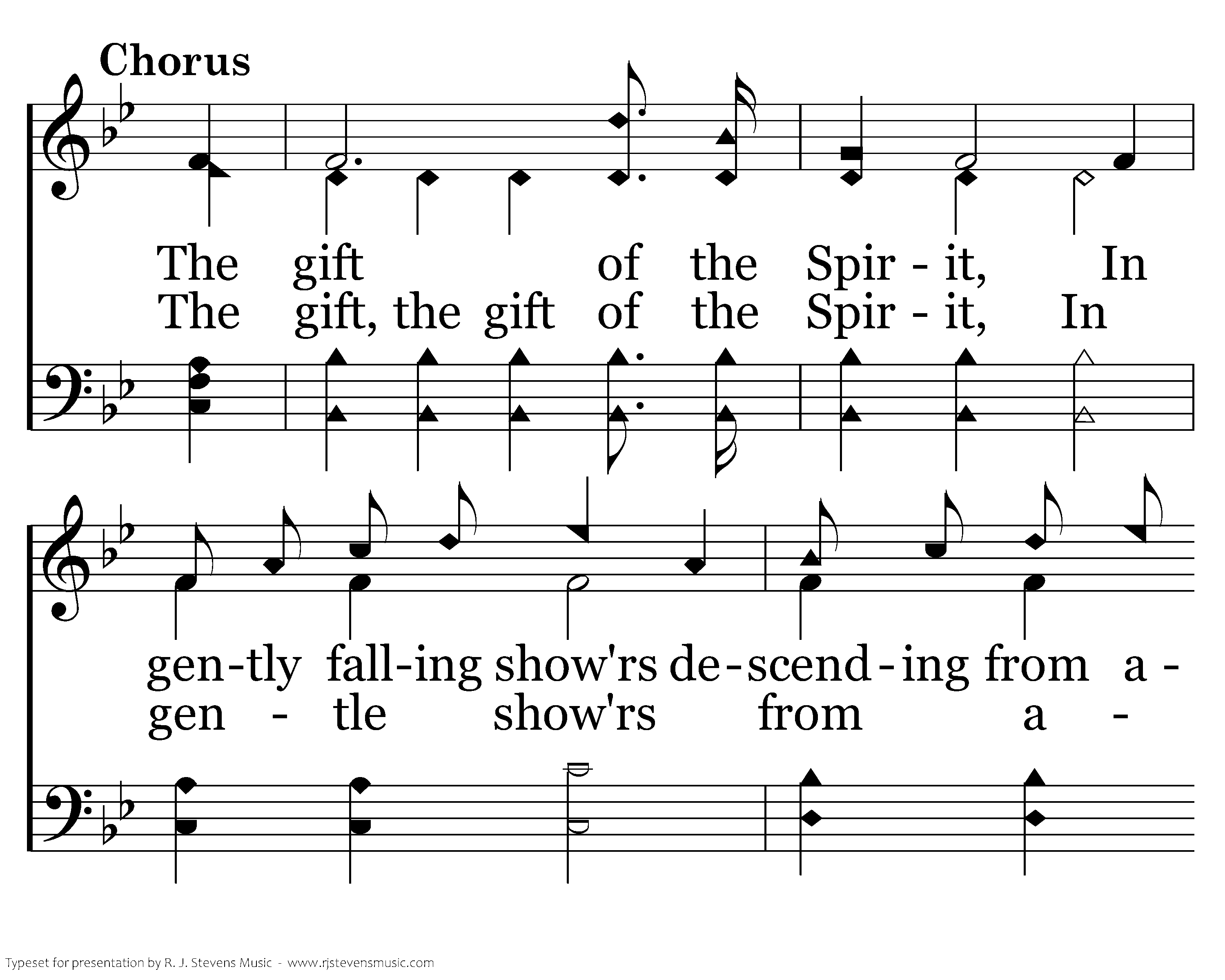 The gift of the Spirit, In gently falling show'rs descending from above, Shall we not receive it Sent to us from God in love? Our hearts all renewing, So peaceful and so pure, so beautiful and bright, Our lives all bedewing With its holy joy and light.