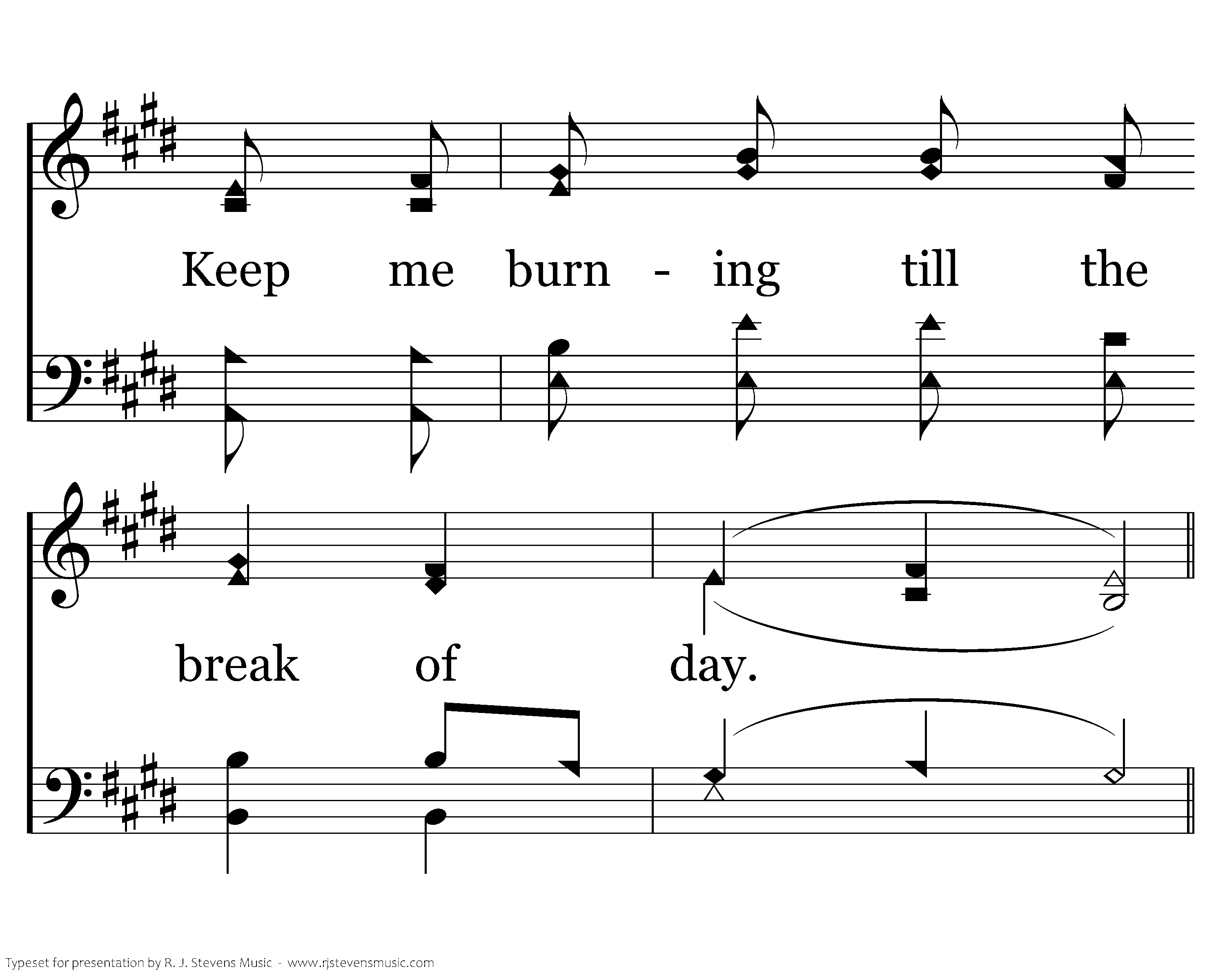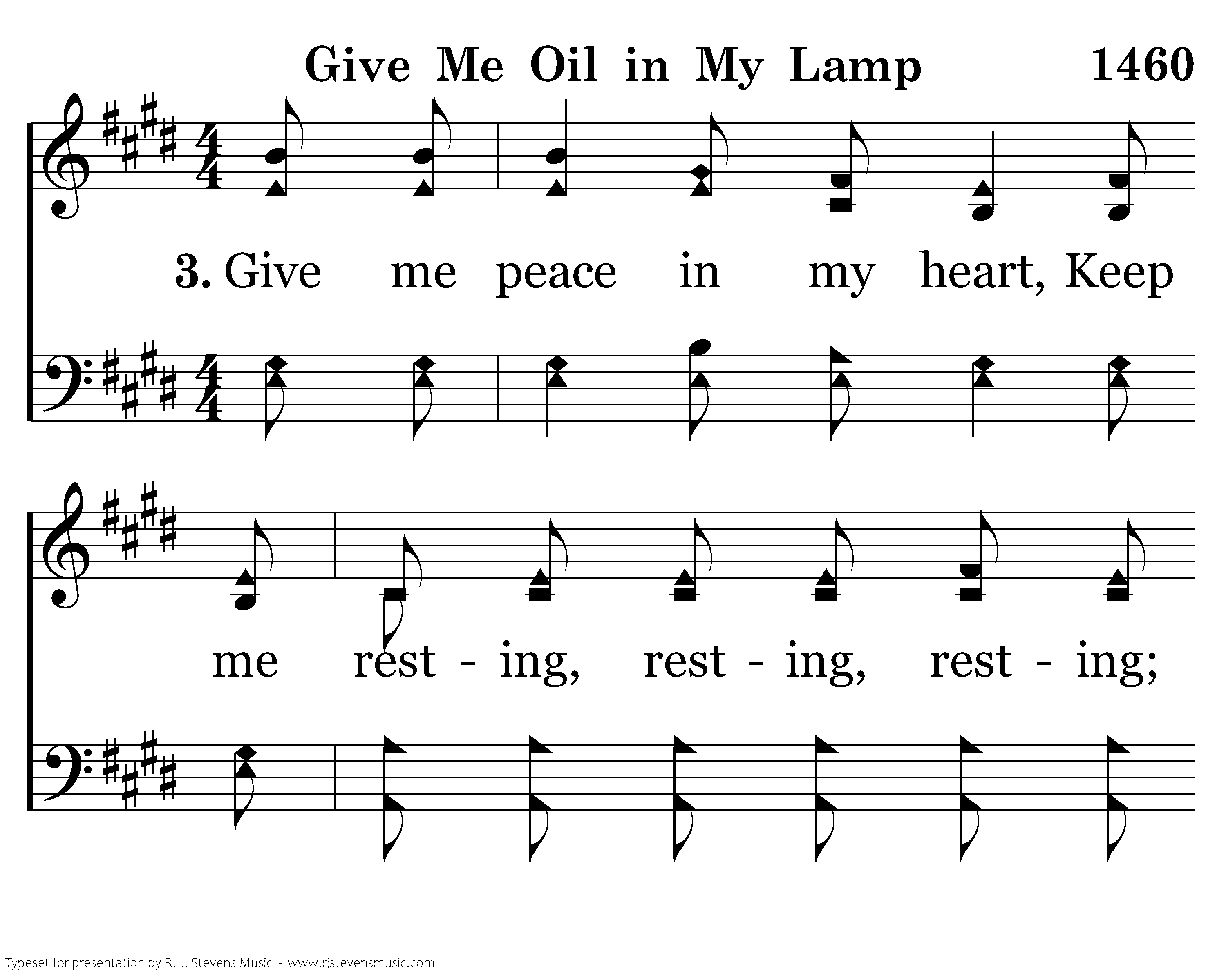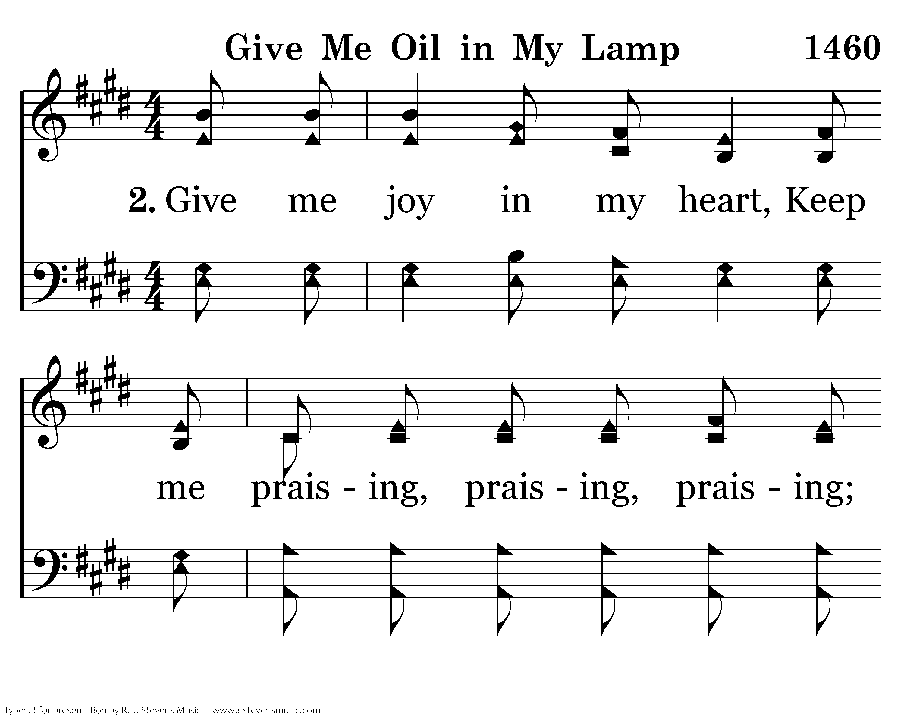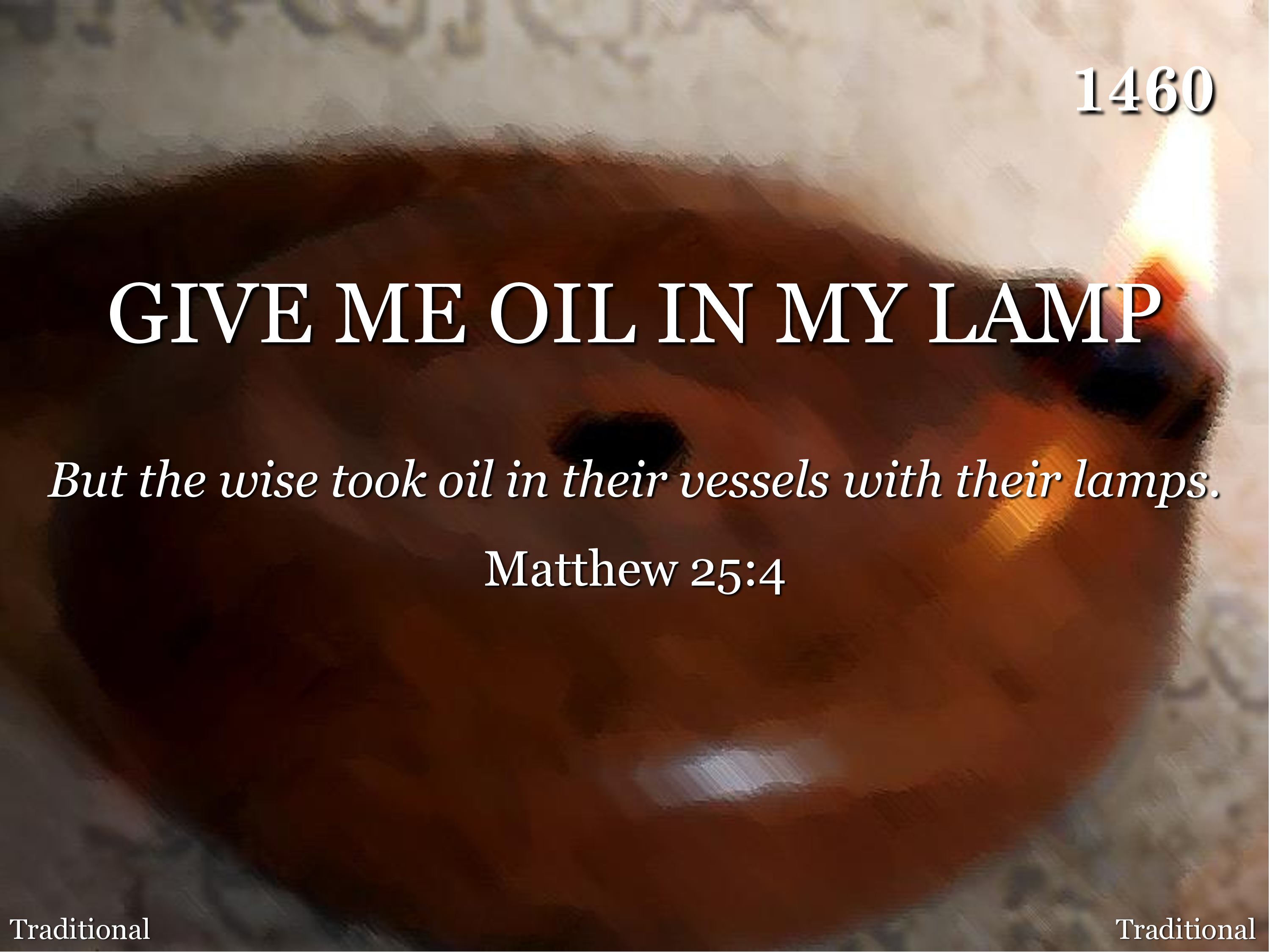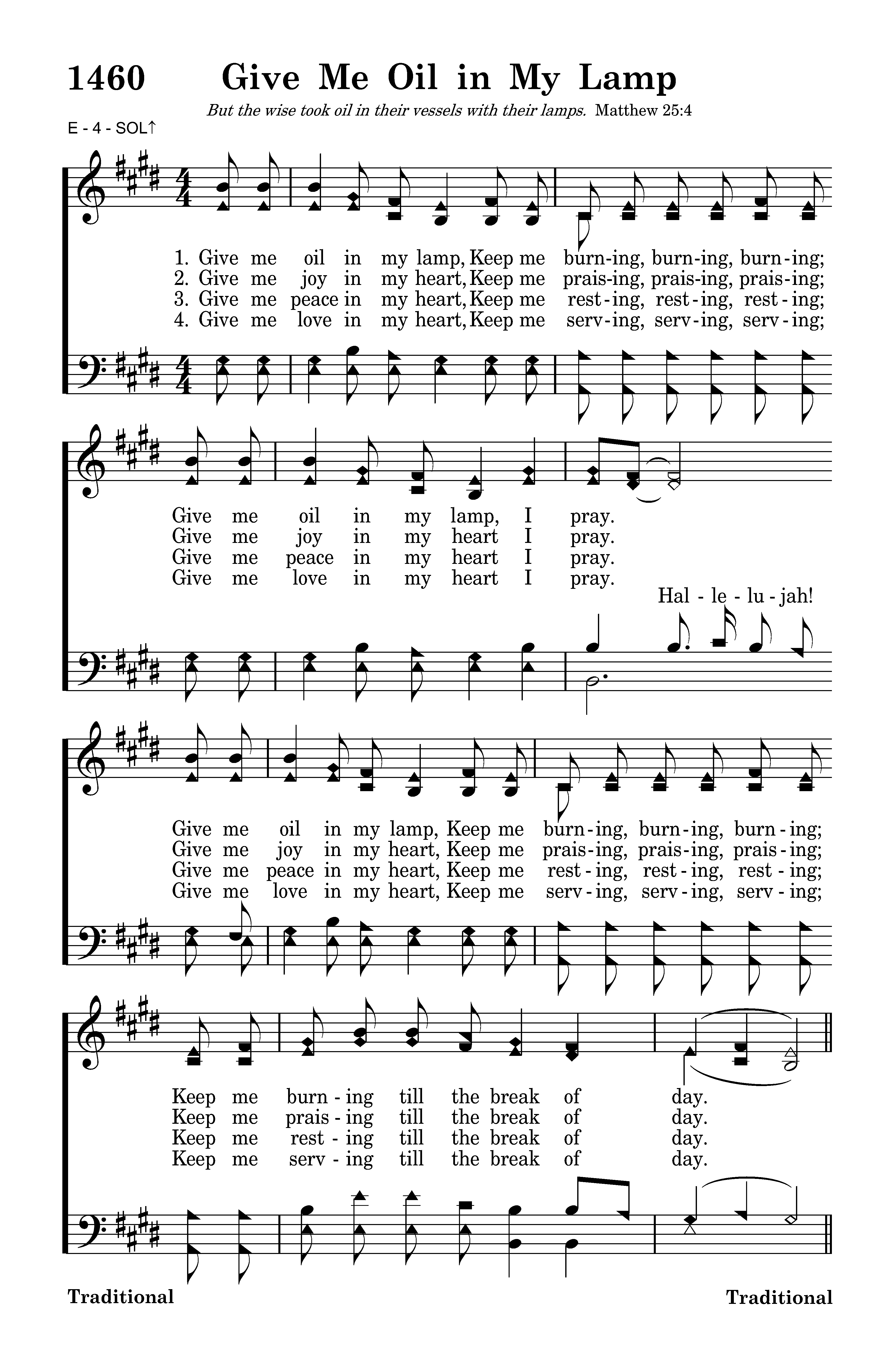 Give me oil in my lamp, Keep me burning, burning, burning; Give me oil in my lamp, I pray. Hallelujah! Give me oil in my lamp, Keep me burning, burning, burning; Keep me burning till the break of day.