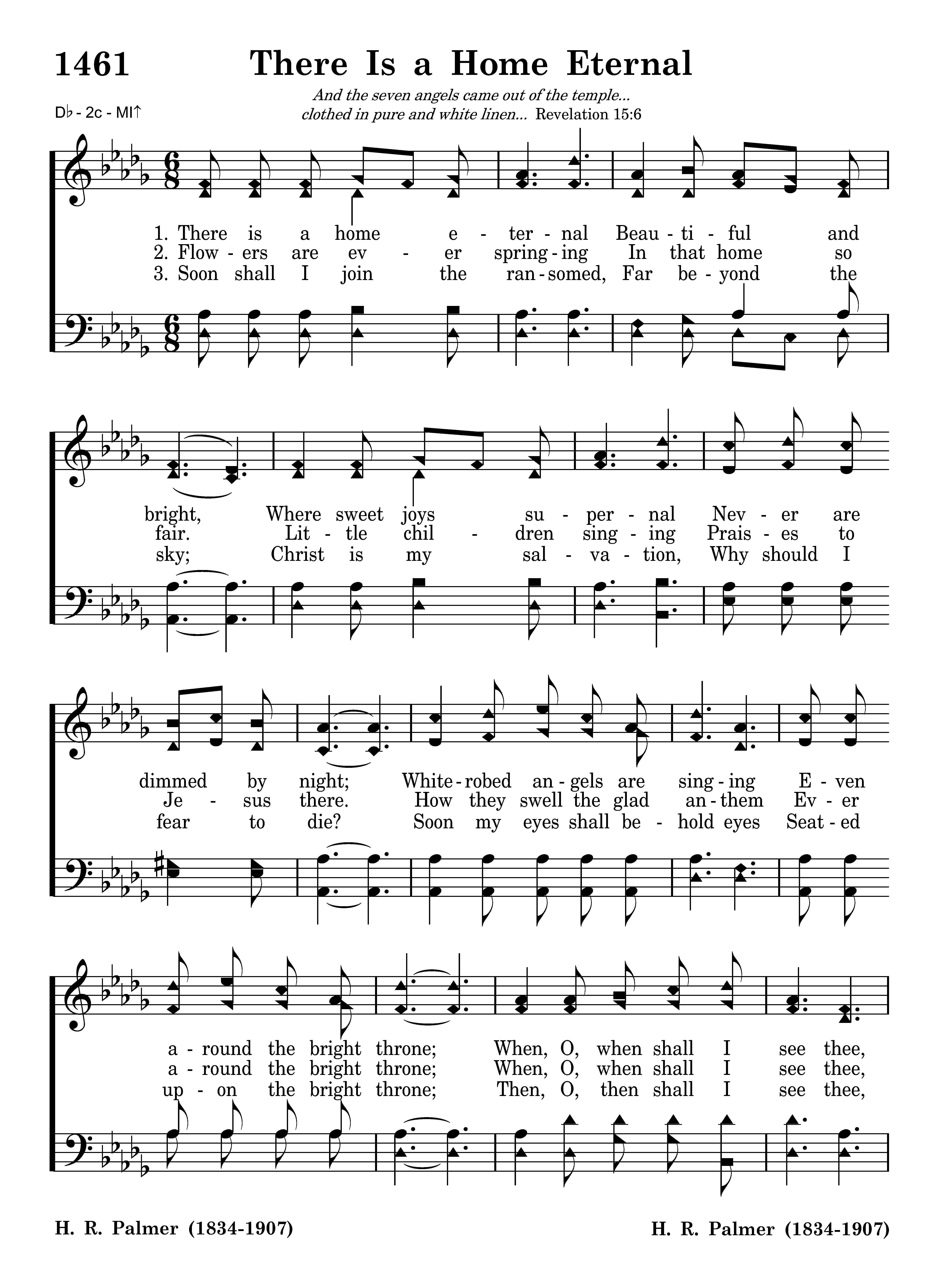 There is a home eternal Beautiful and bright, Where sweet joys supernal Never are dimmed by night; Whiterobed angels are singing Even around the bright throne; When, O, when shall I see thee, Beautiful, beautiful home?