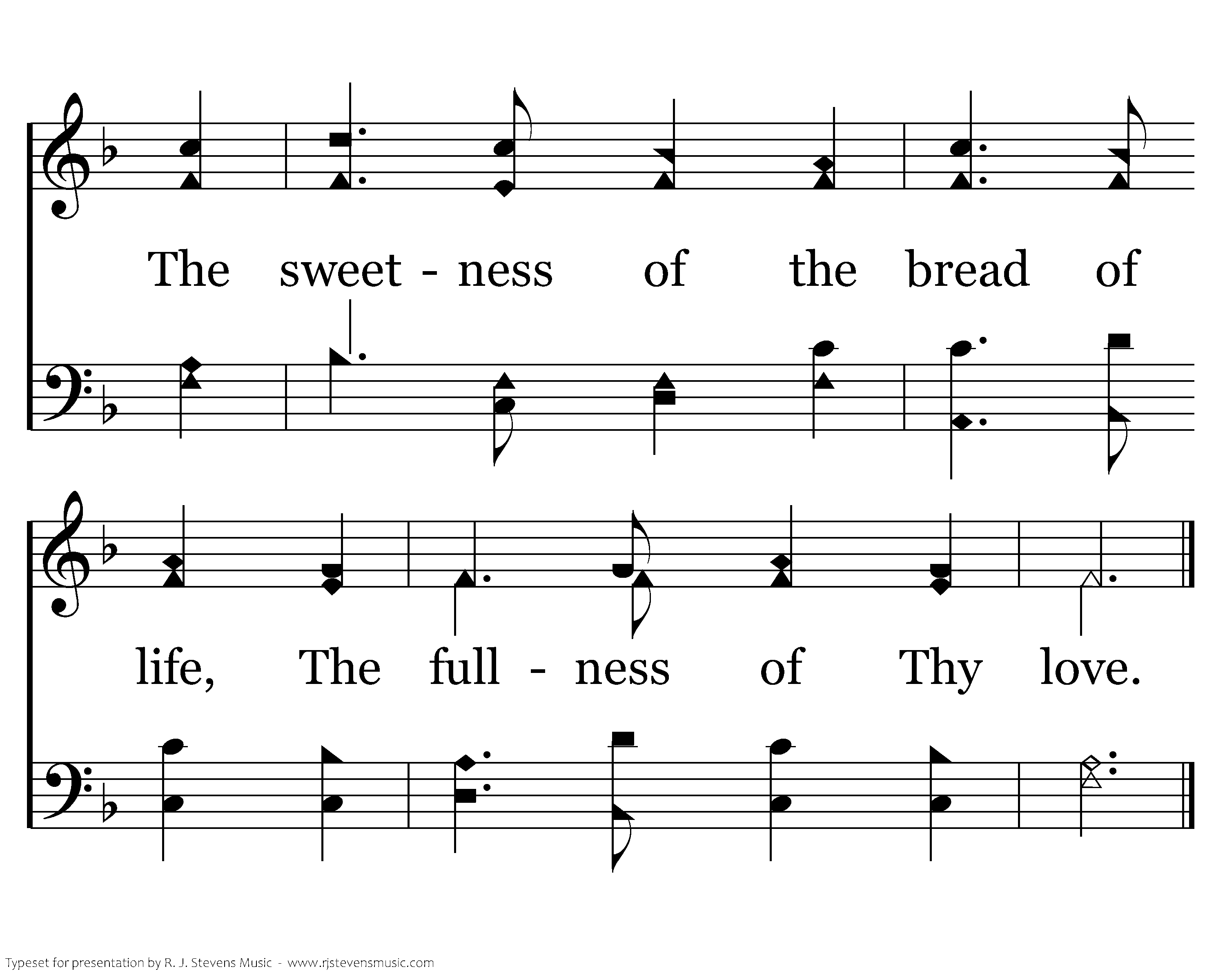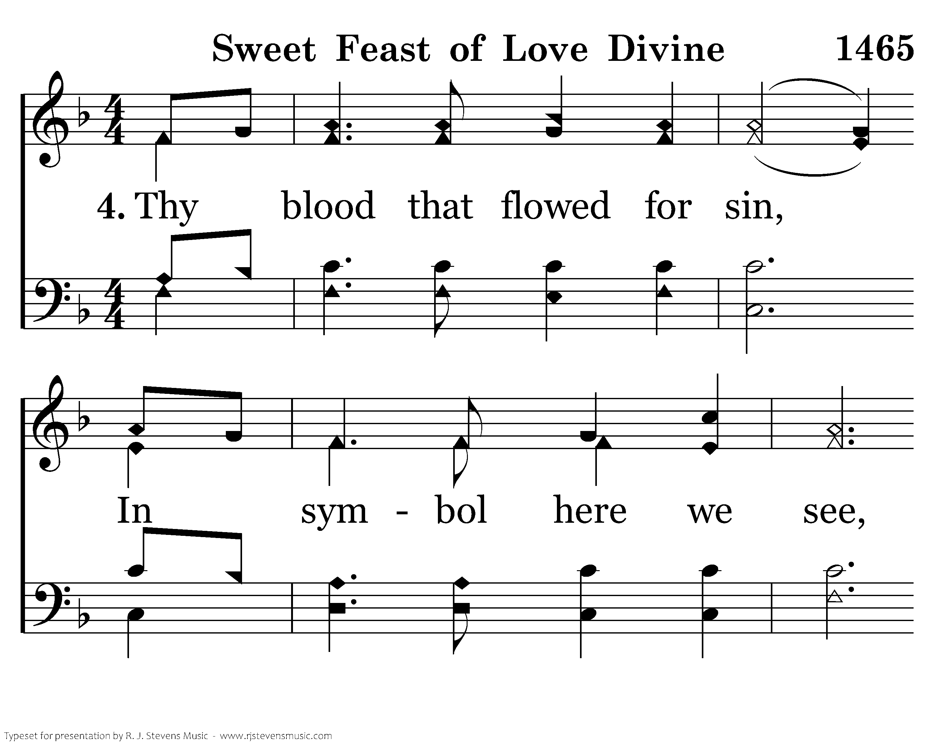 Sweet feast of love divine! 'Tis grace that makes us free To feed upon this bread and wine, In mem'ry, Lord, of Thee