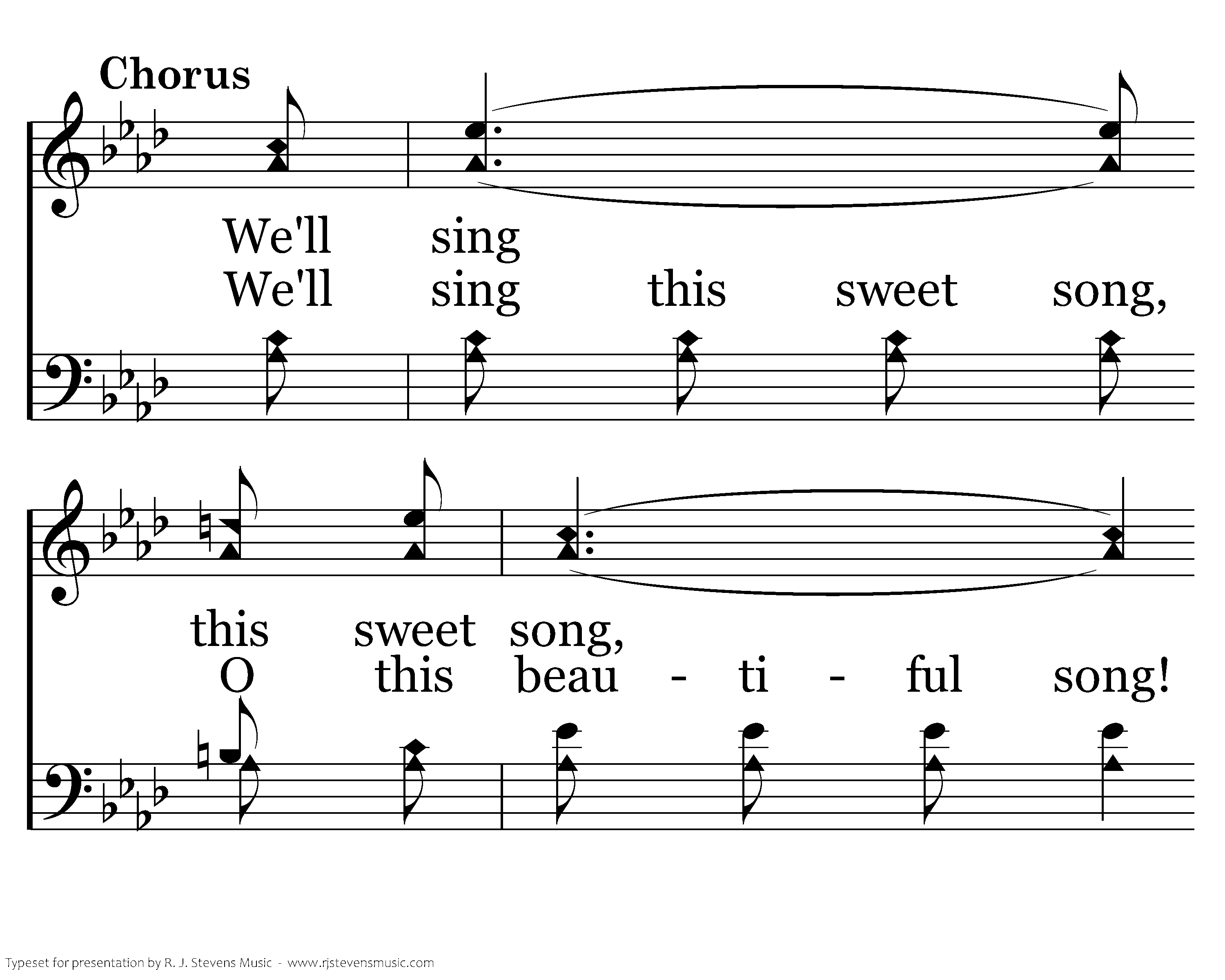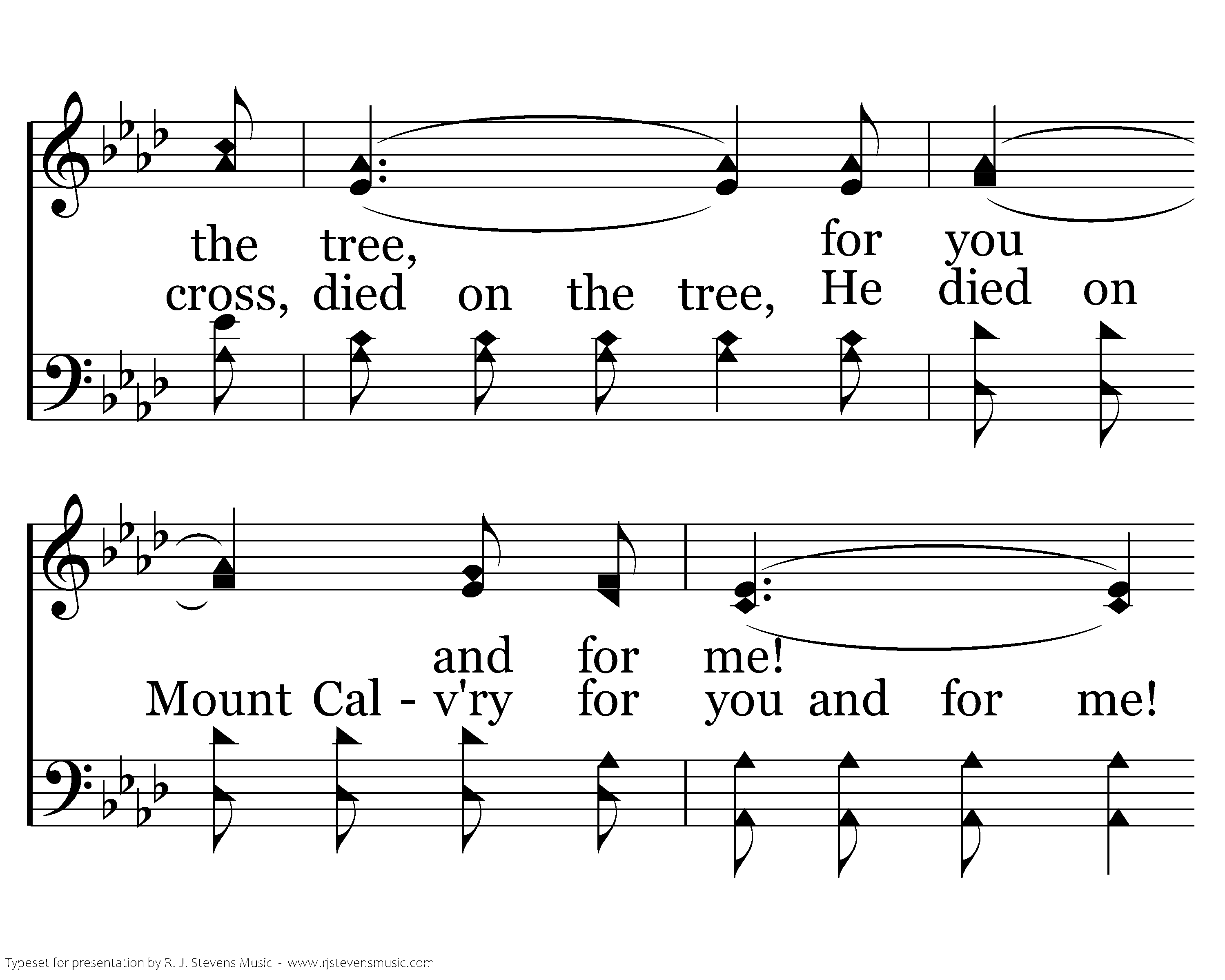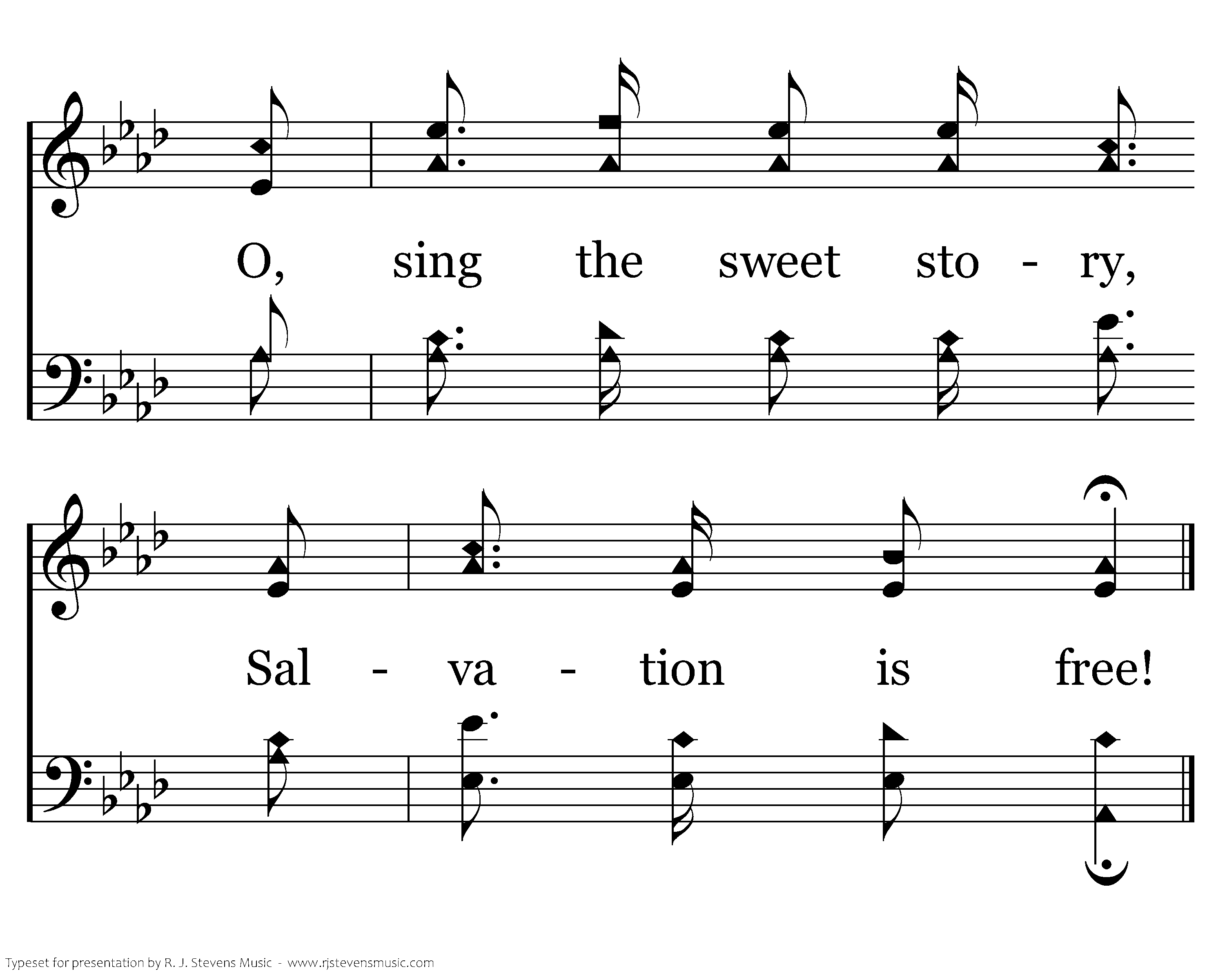 We'll sing this sweet song, this glorious song, Of Jesus who died on the tree! He died on the tree, for you and for me! O, sing the sweet story, Salvation is free!