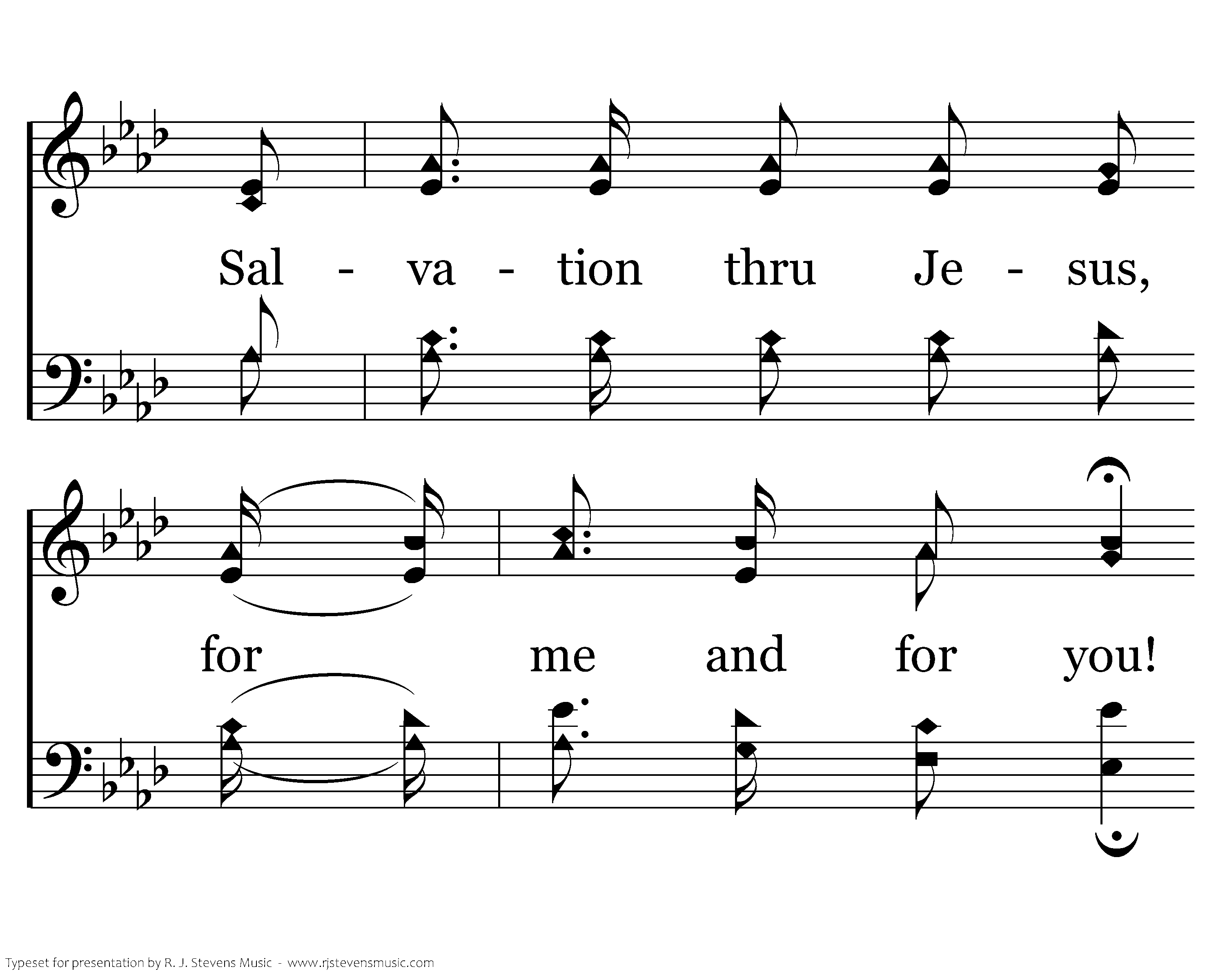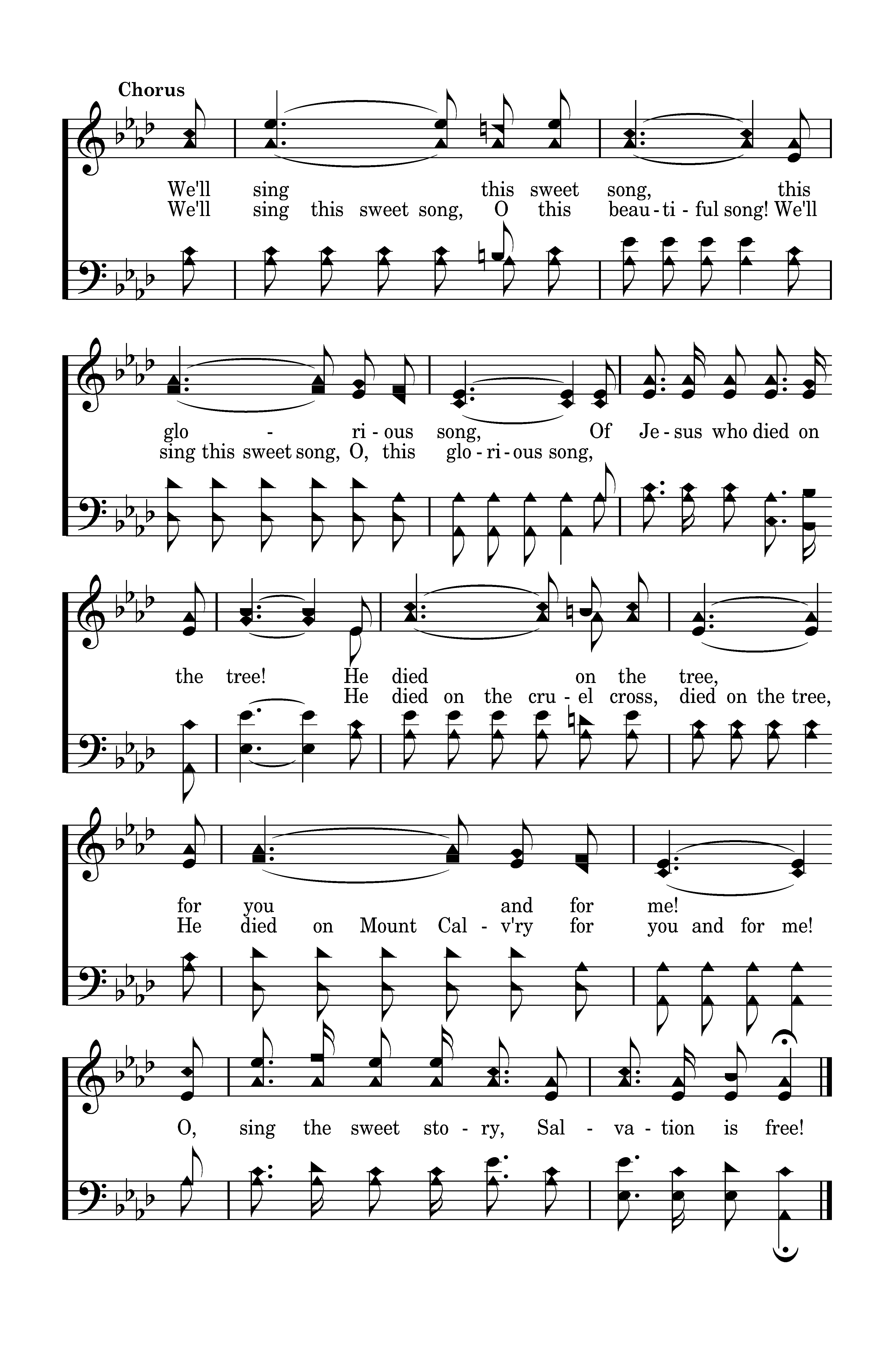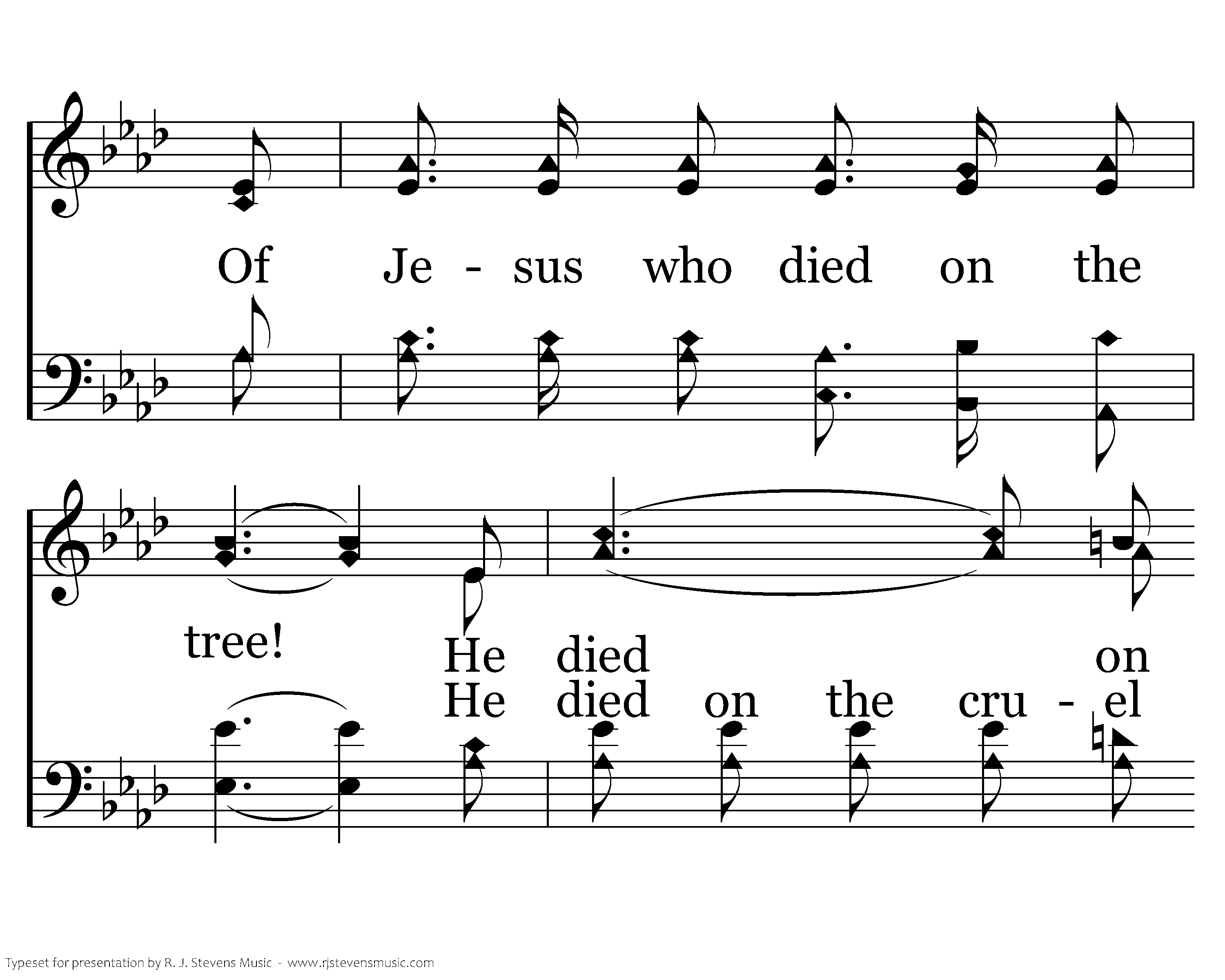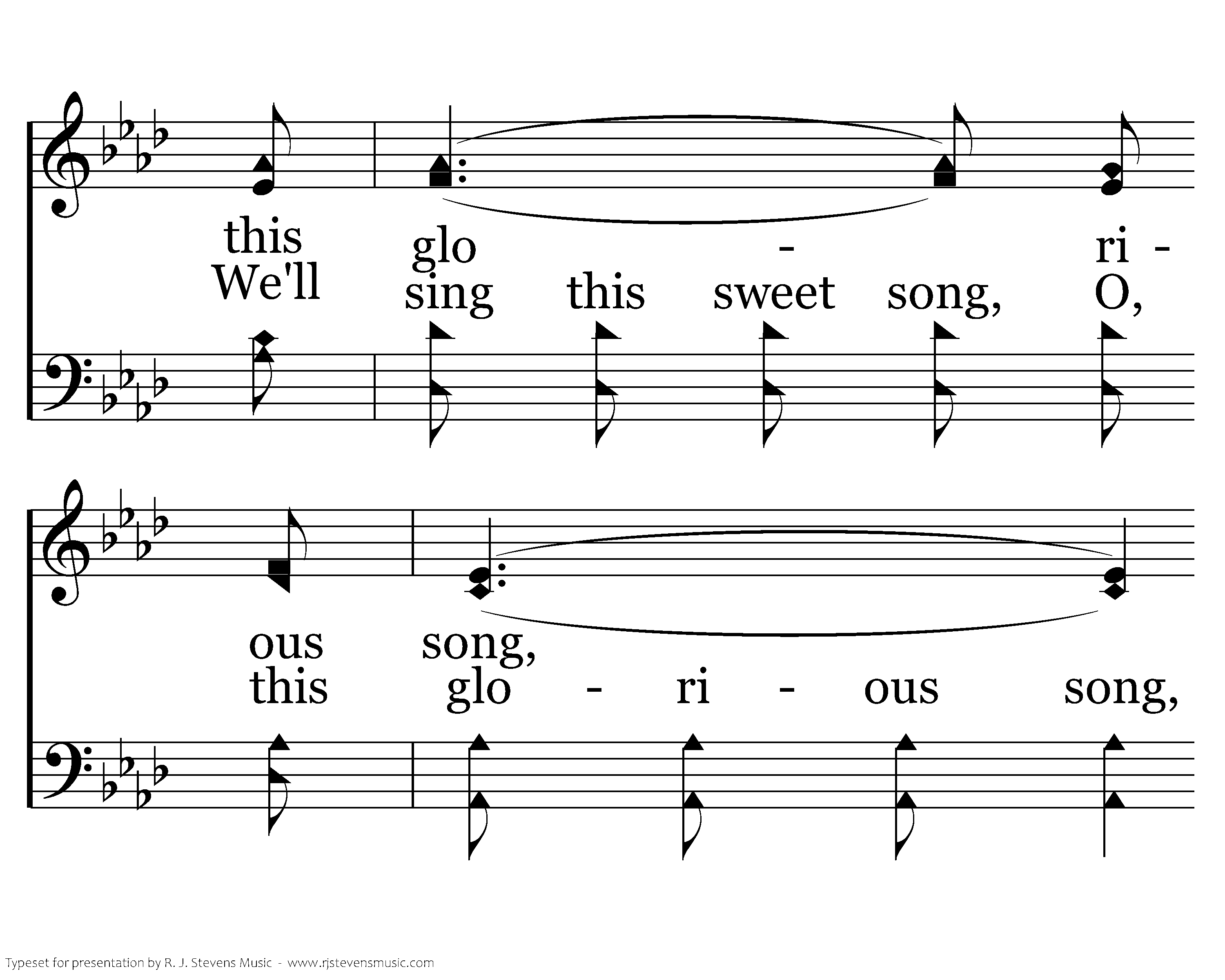 We'll sing this sweet song, this glorious song, Of Jesus who died on the tree! He died on the tree, for you and for me! O, sing the sweet story, Salvation is free!