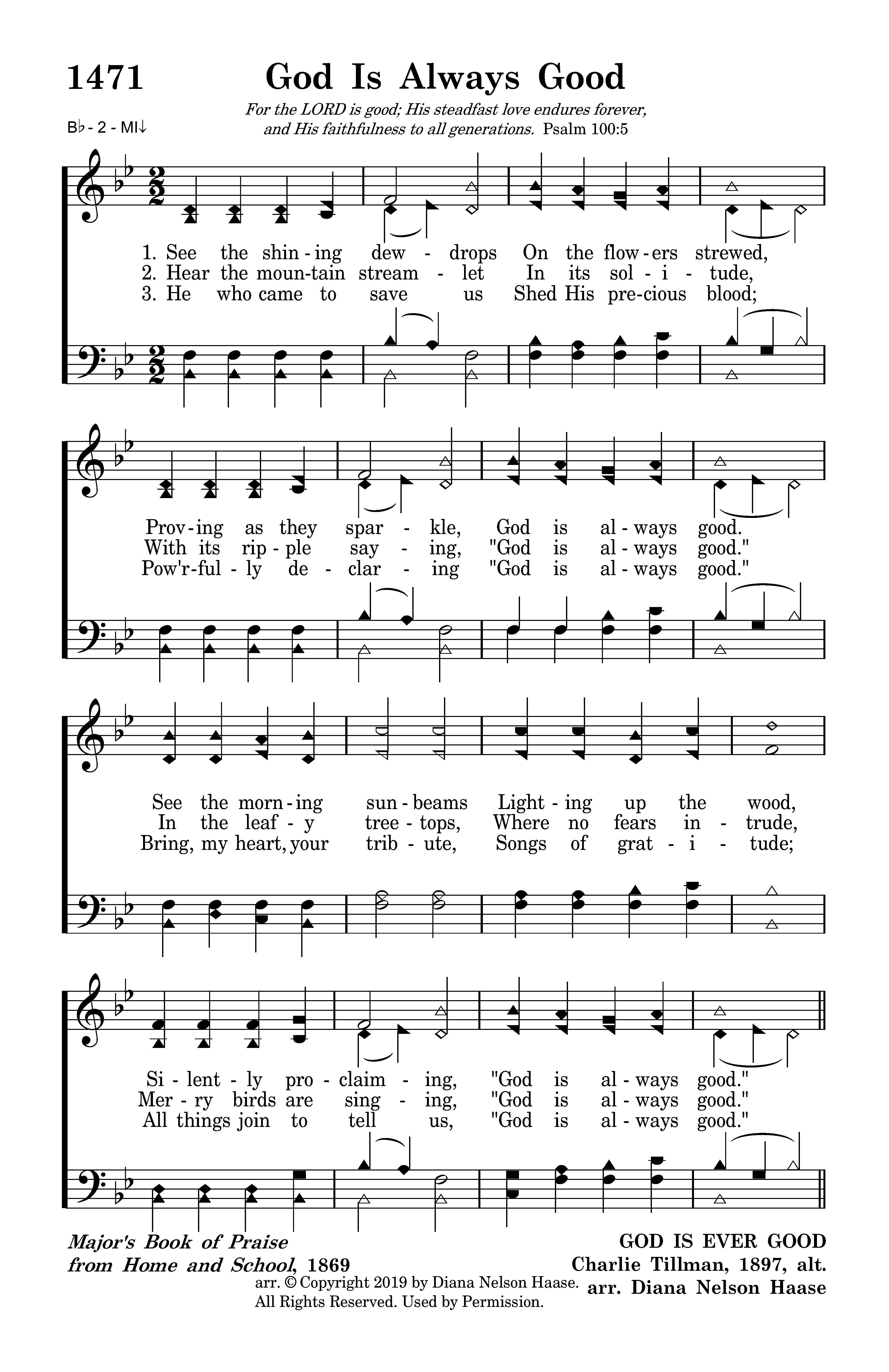 See the shining dewdrops On the flowers strewed, Proving as they sparkle, God is always good. See the morning sunbeams Lighting up the wood, Silently proclaiming, "God is always good."