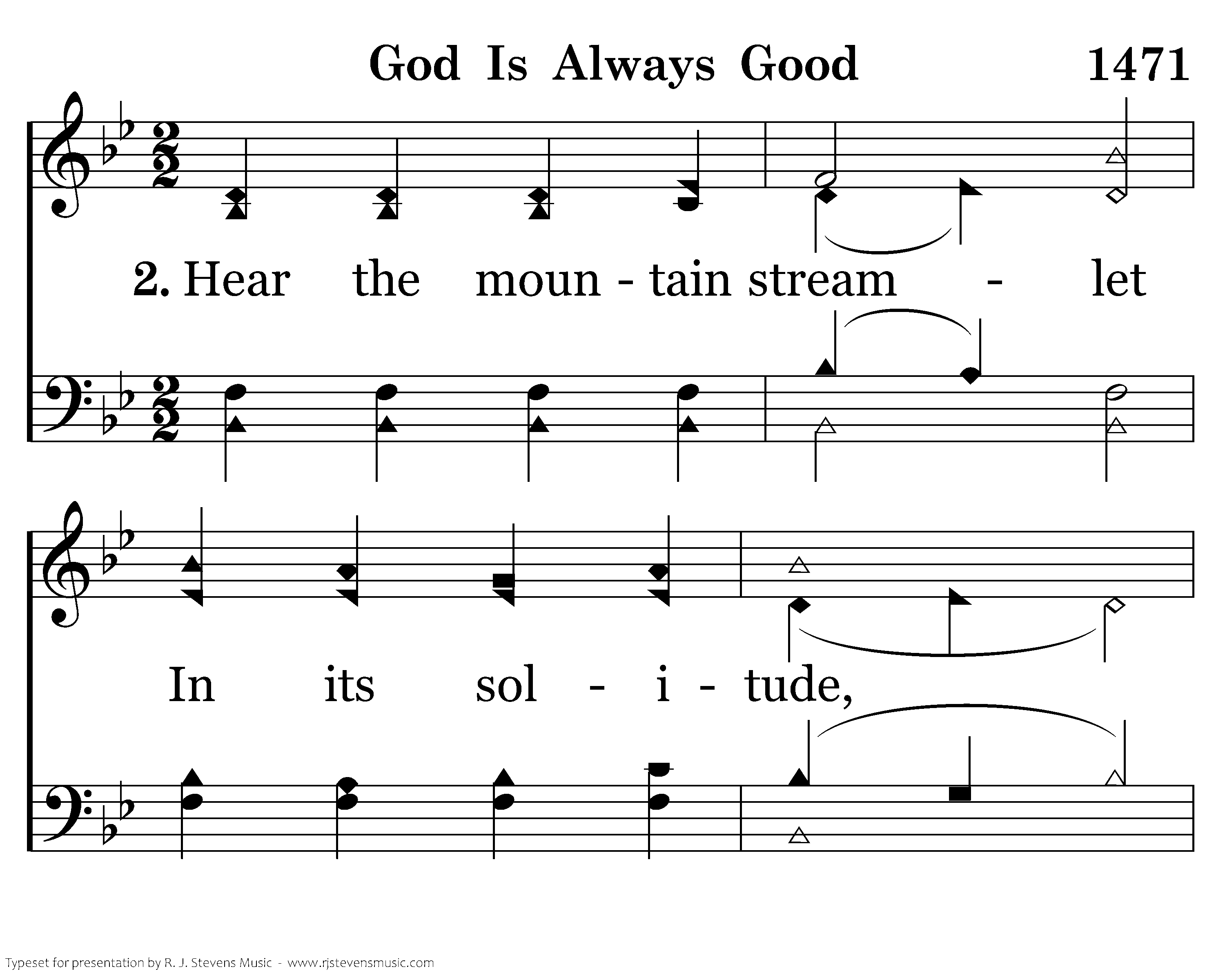 Hear the mountain streamlet In its solitude, With its ripple saying, "God is always good." In the leafy treetops, Where no fears intrude, Merry birds are singing, "God is always good."