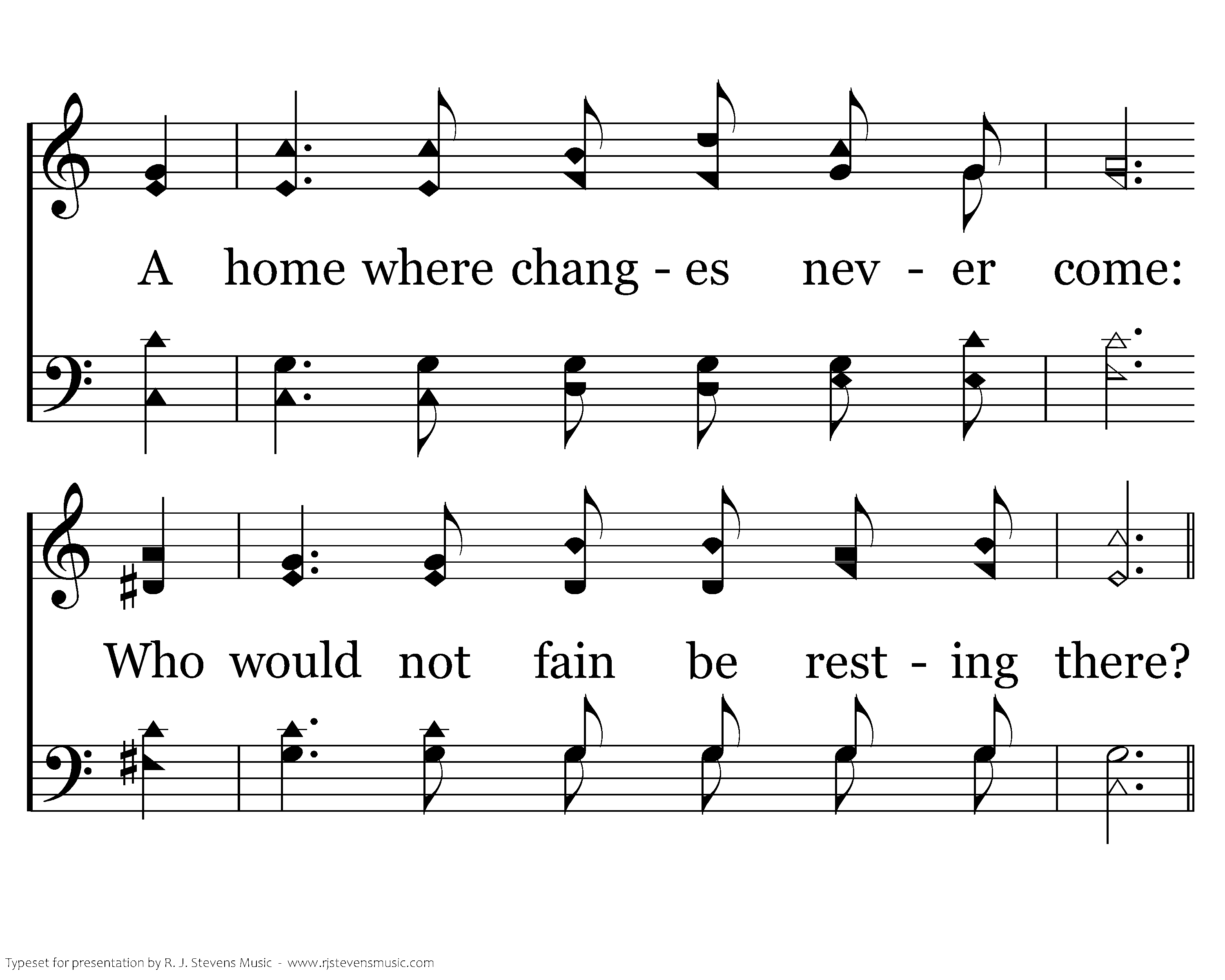 O troubled heart, there is a home Beyond the reach of toil and care; A home where changes never come: Who would not fain be resting there.