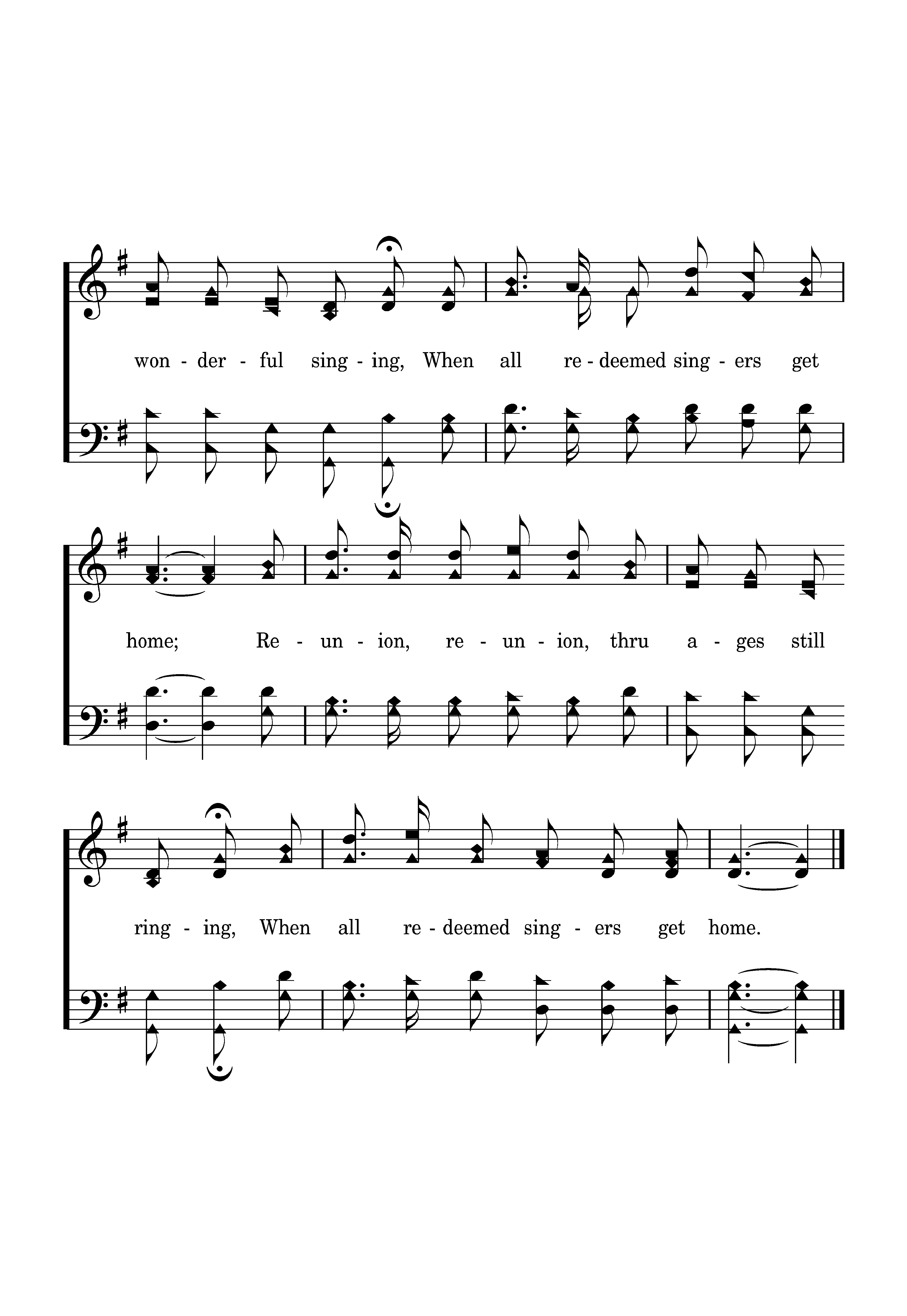 Then, O, what a wonderful, wonderful singing, When all redeemed singers get home; Reunion, reunion, thru ages still ringing, When all redeemed singers get home.