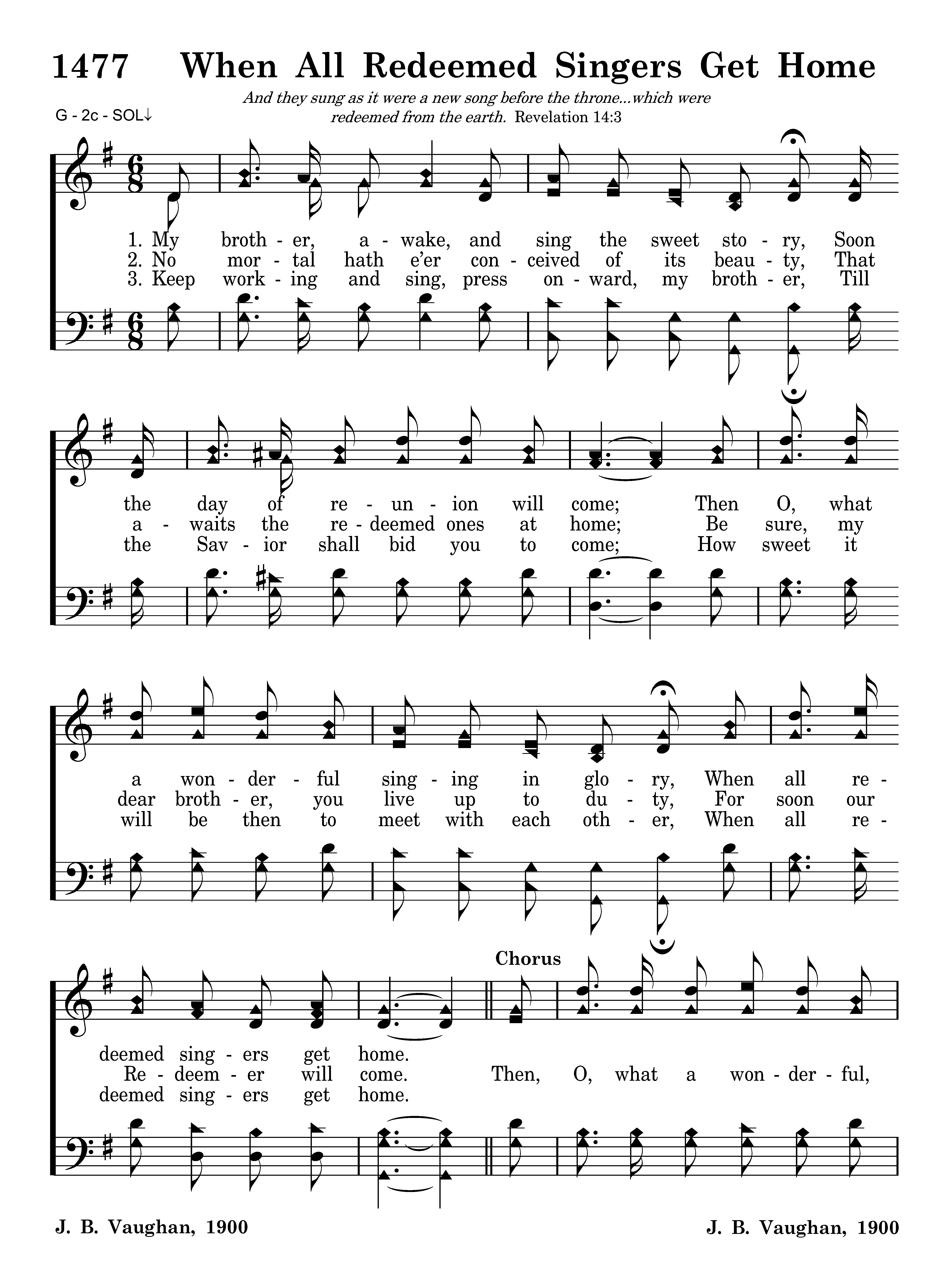 My brother, awake, and sing the sweet story,Soon the day of reunion will come; Then O, what a wonderful singing in glory, When all redeemed singers get home.
