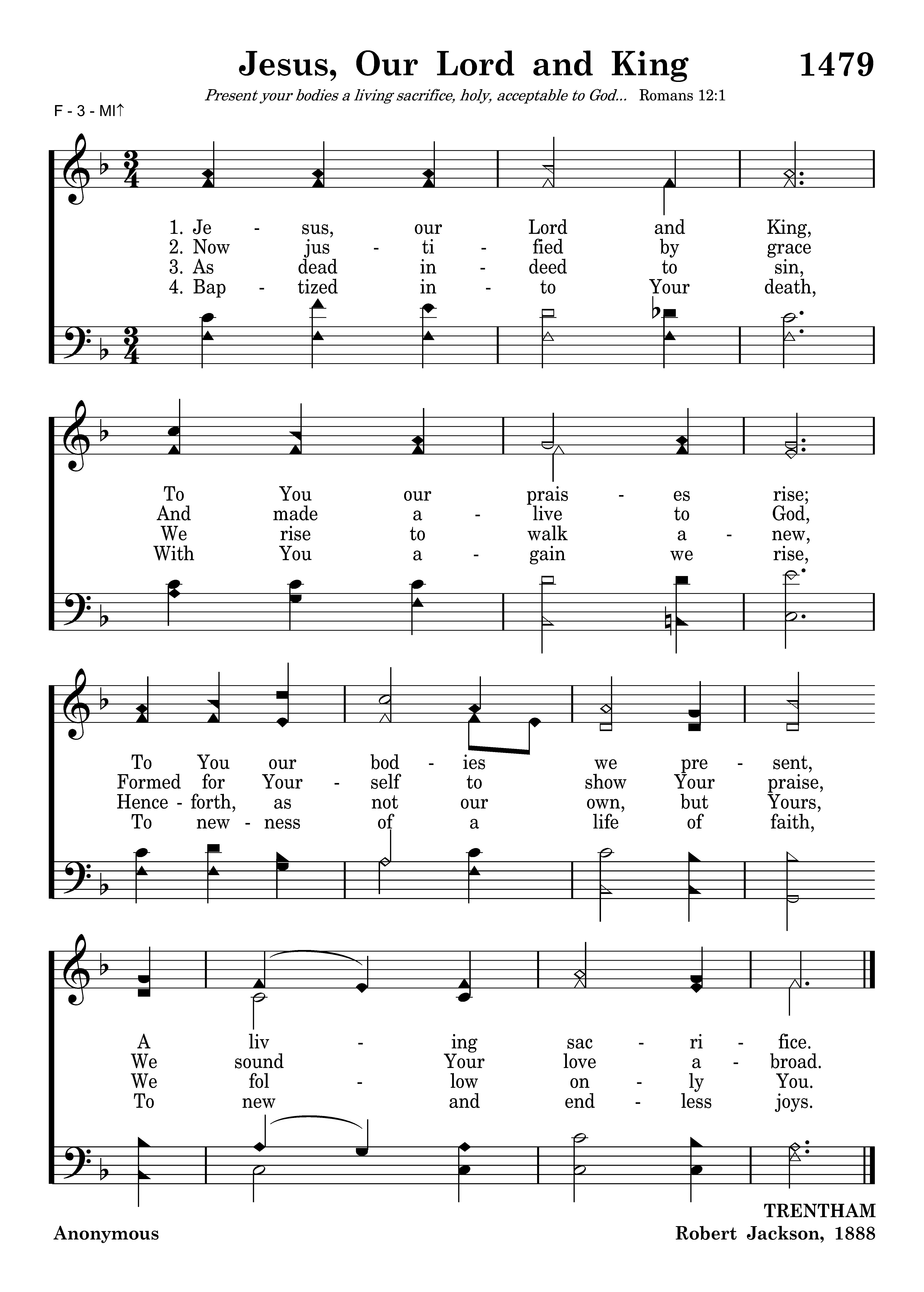 Jesus, our Lord and King, To You our praises rise; To You our bodies we present, A living sacrifice.
