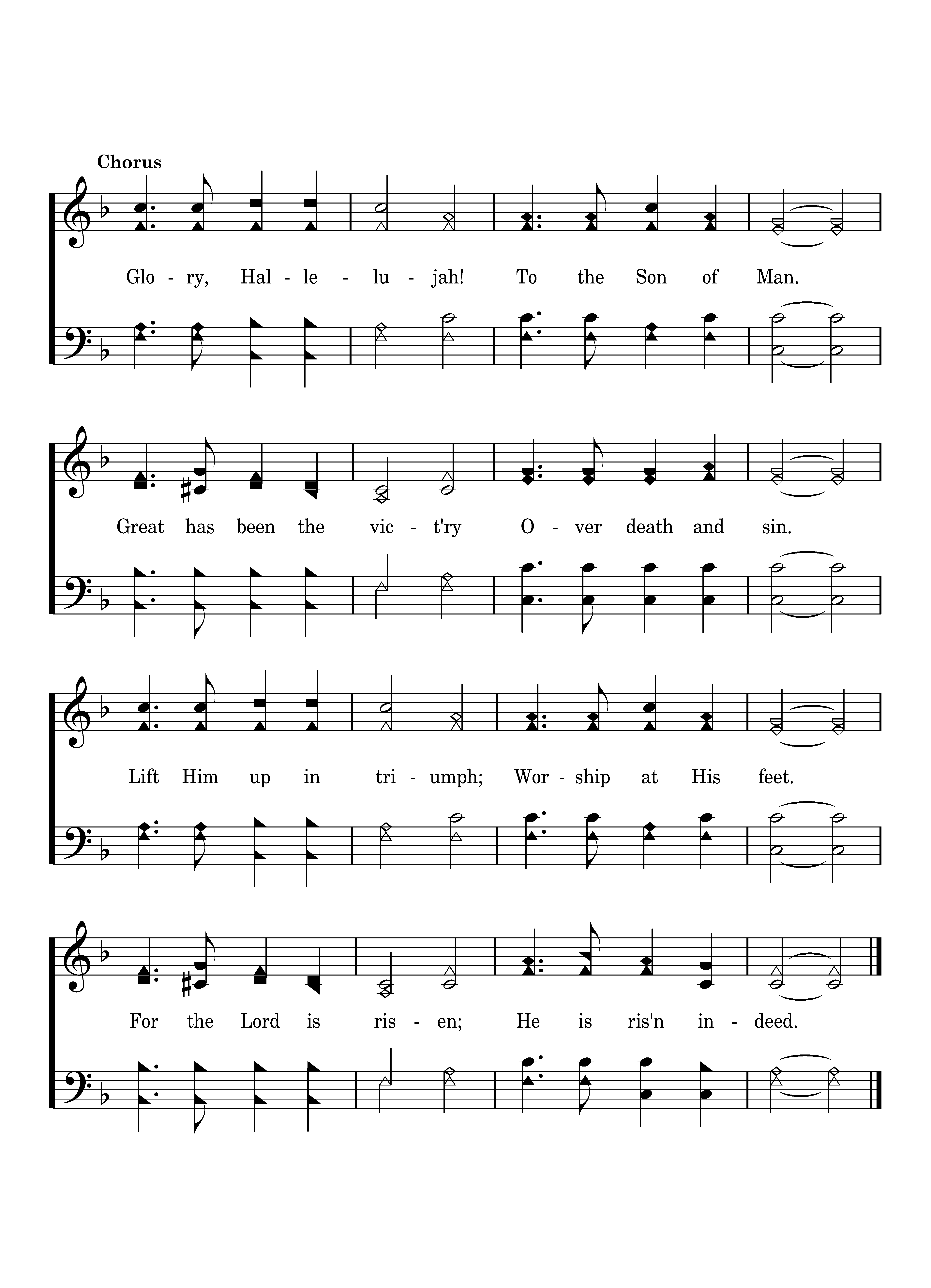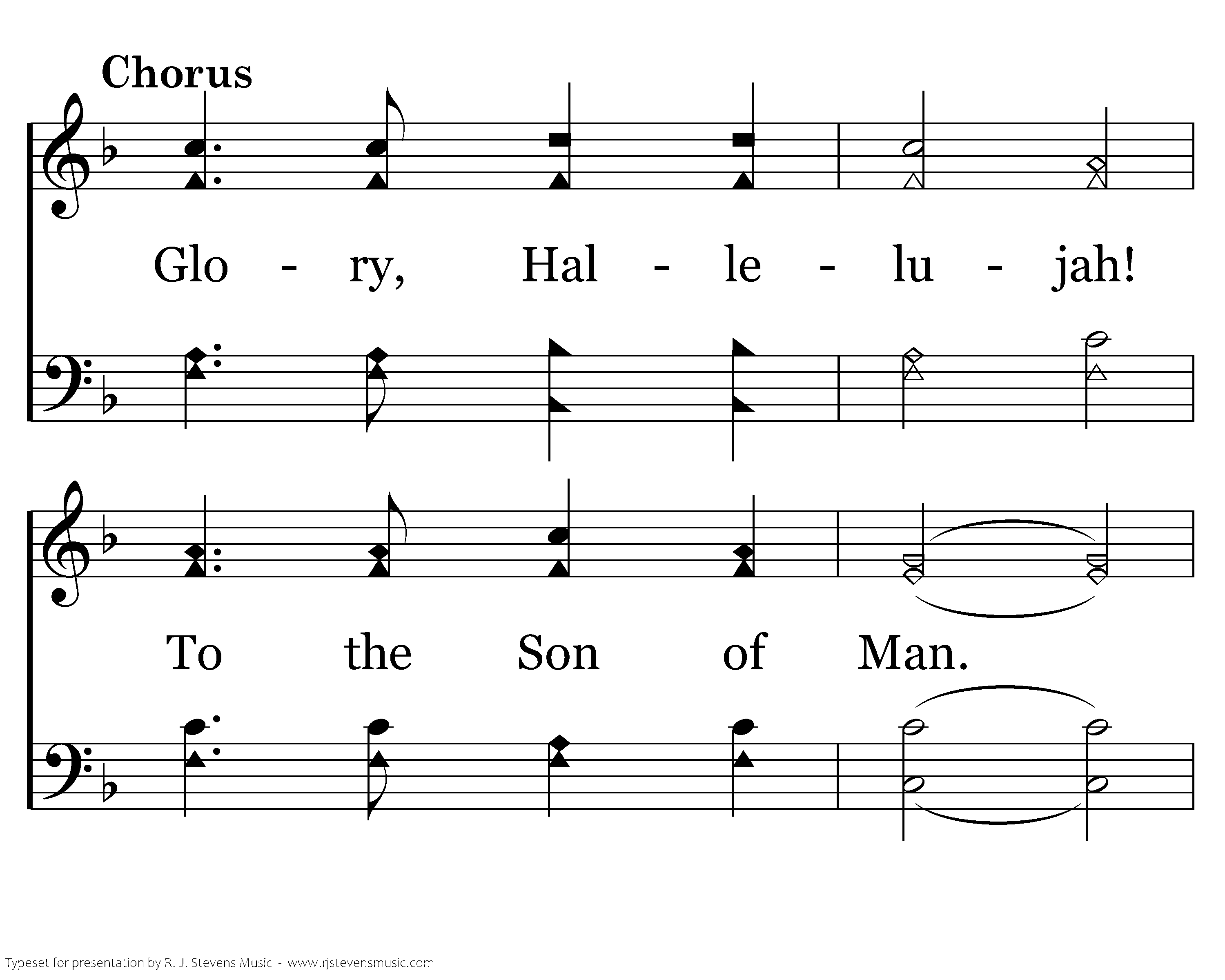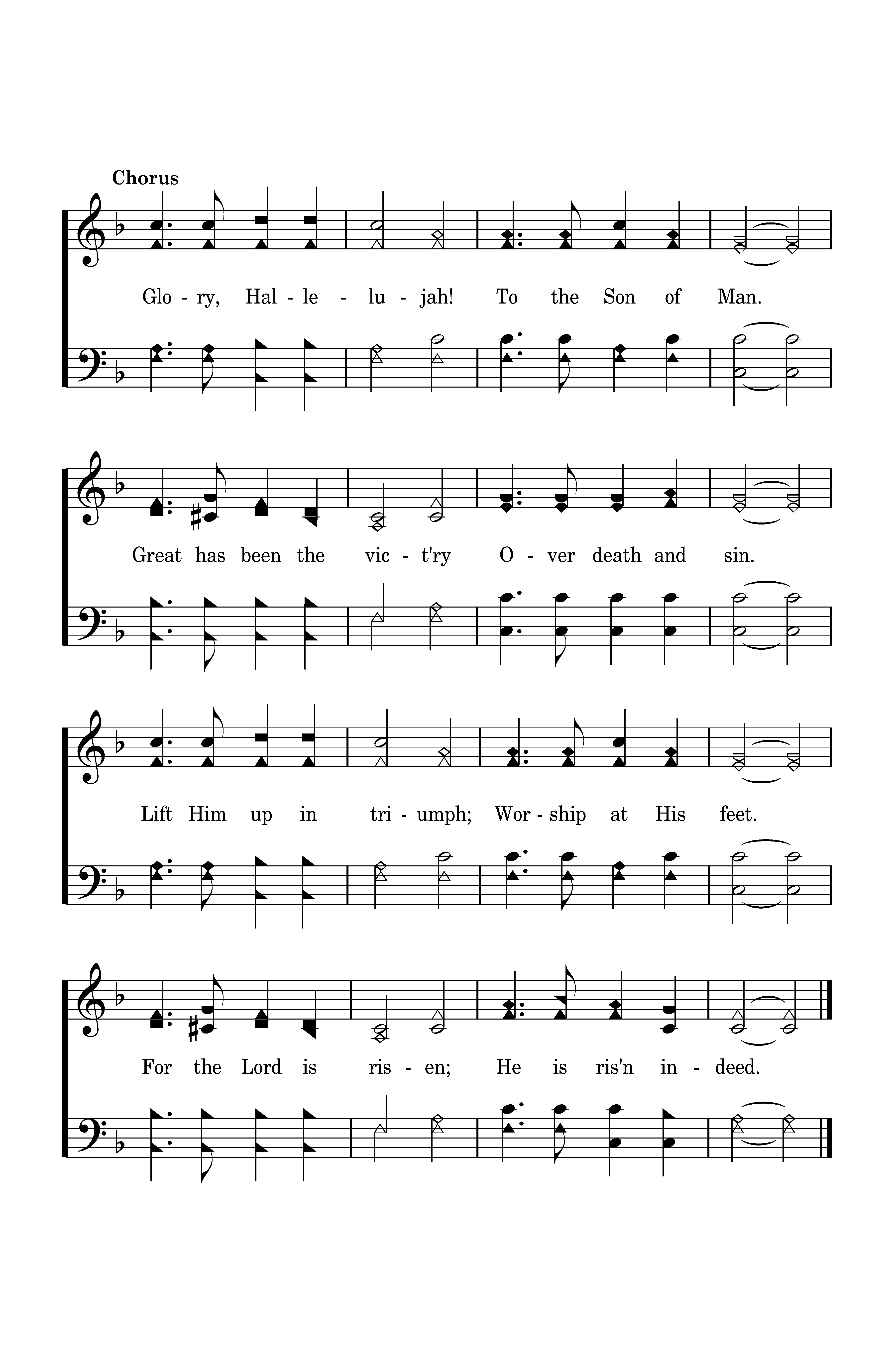 Glory, Hallelujah! To the Son of Man. Great has been the vict'ry Over death and sin. Lift Him up in triumph; Worship at His feet. For the Lord is risen; He is ris'n indeed.