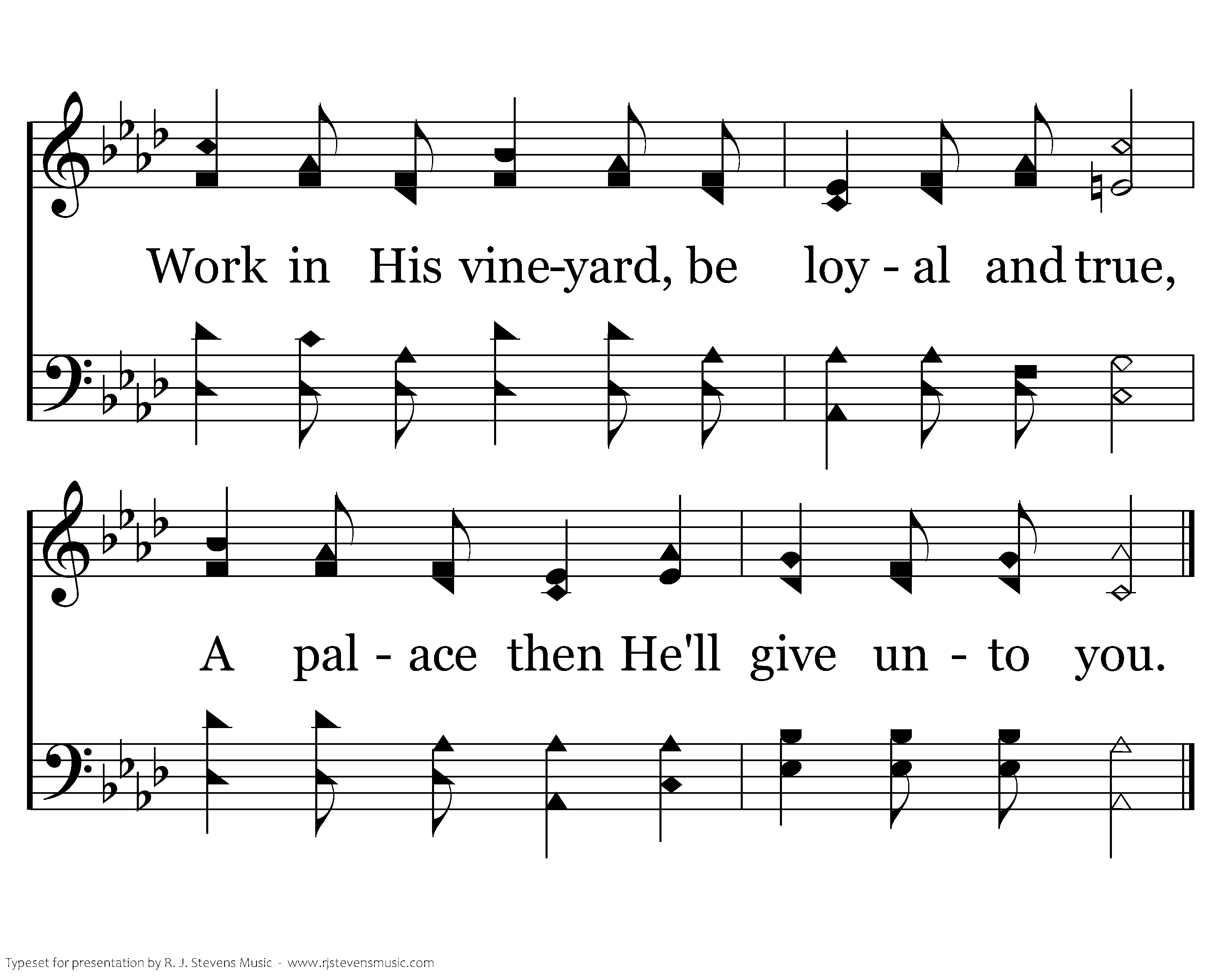 Why stand ye idle all day long? Your labor Jesus will repay, Work in His vineyard, be loyal and true, A palace then He'll give unto you.
