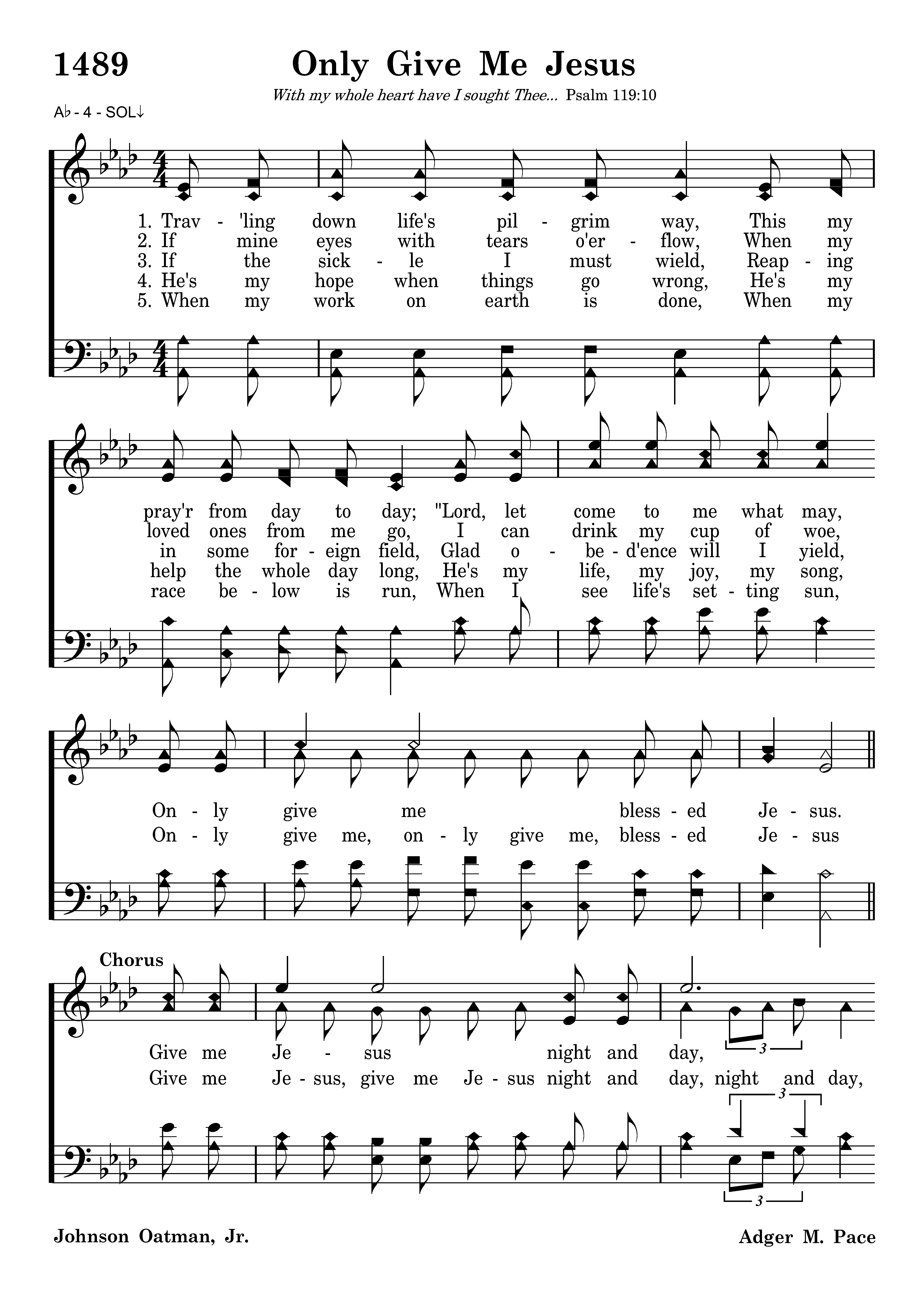 Trav'ling down life's pilgrim way, This my pray'r from day to day; "Lord, let come to me what may, Only give me, only give me, blessed Jesus.