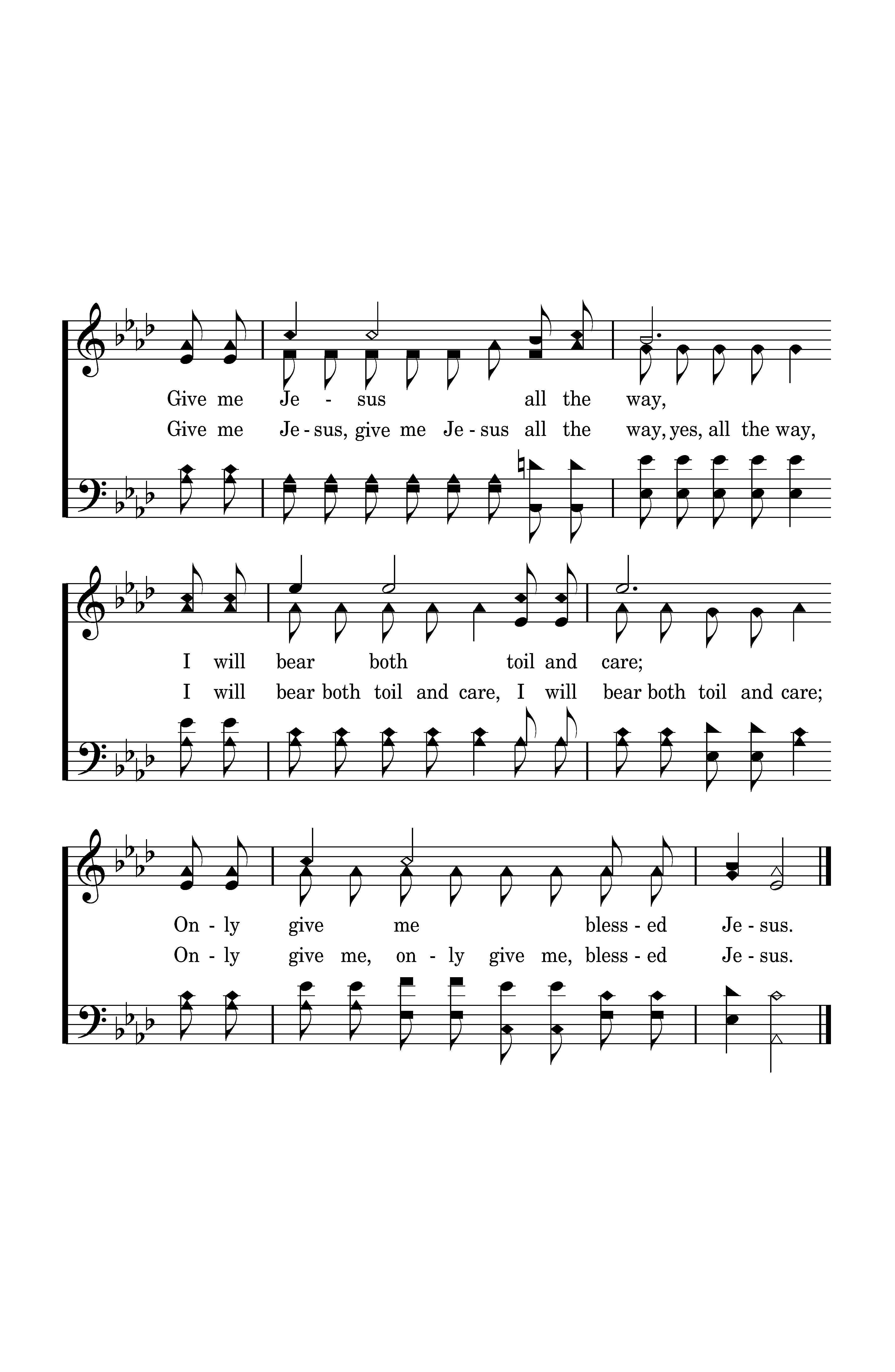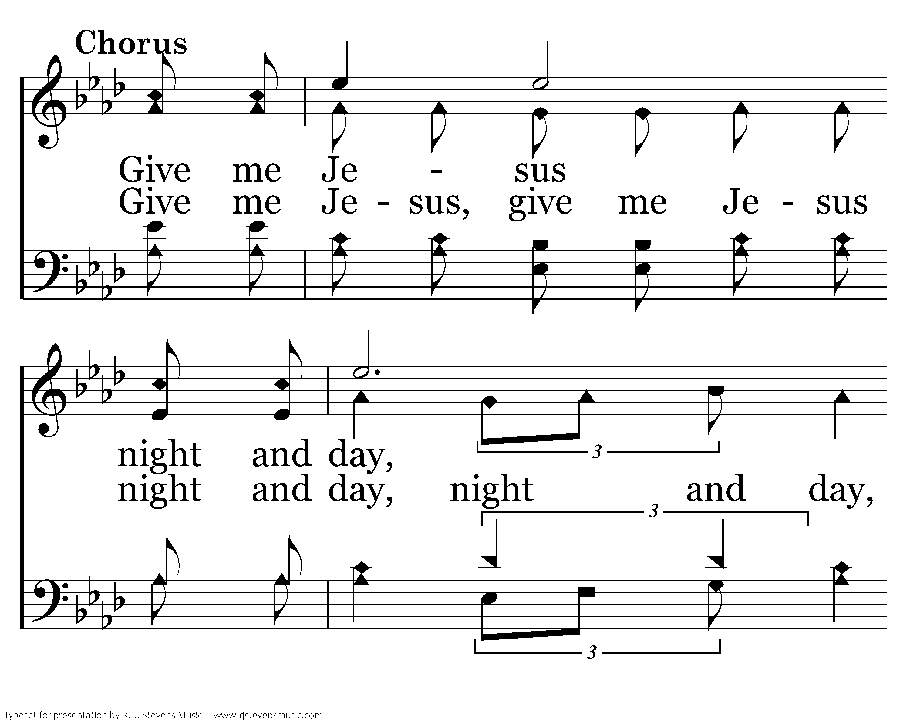 Give me Jesus night and day, Give me Jesus all the way, I will bear both toil and care; Only give me blessed Jesus.