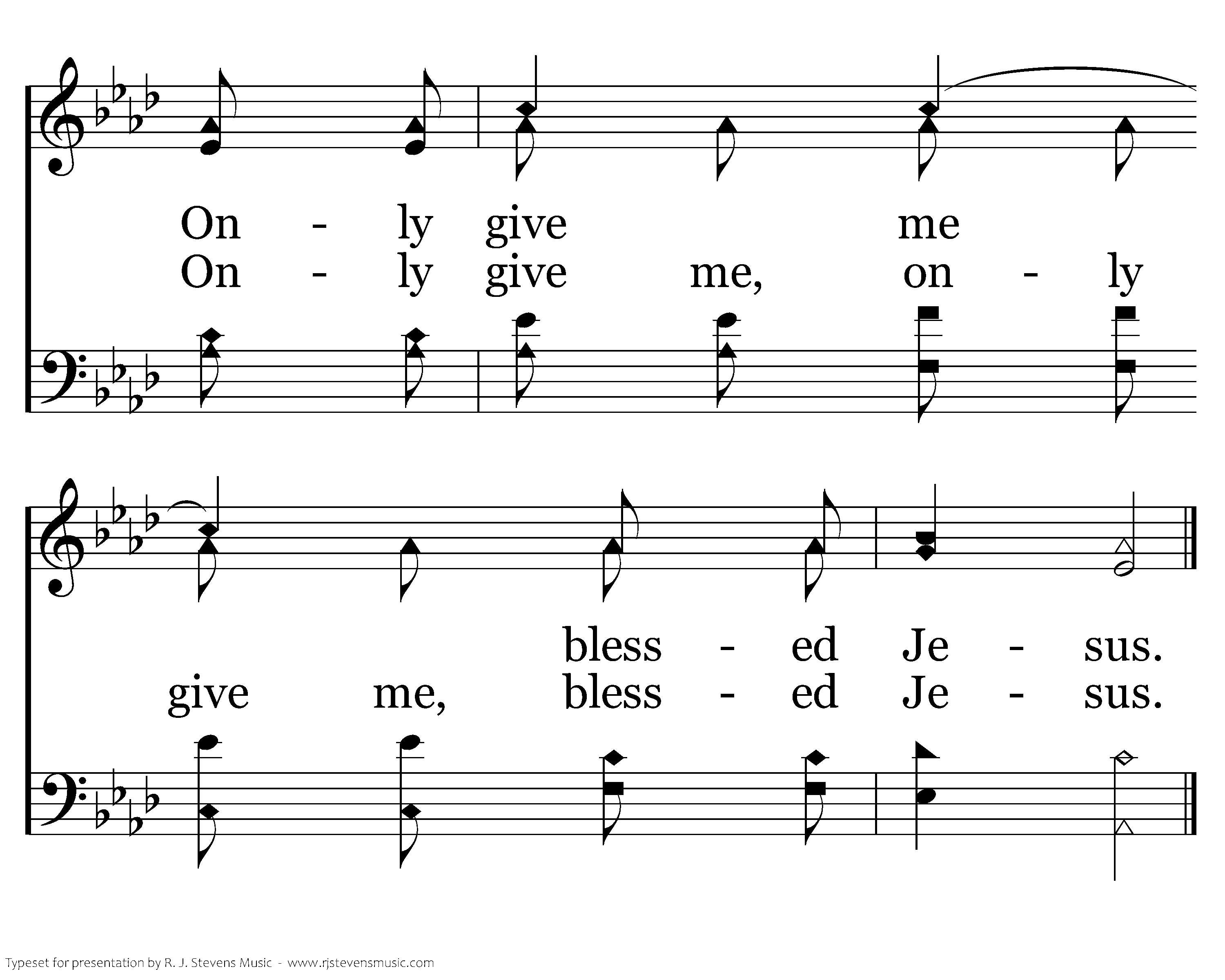 He's my hope when things go wrong, He's my help the whole day long, He's my life, my joy, my song, Only give me, only give me, blessed Jesus.