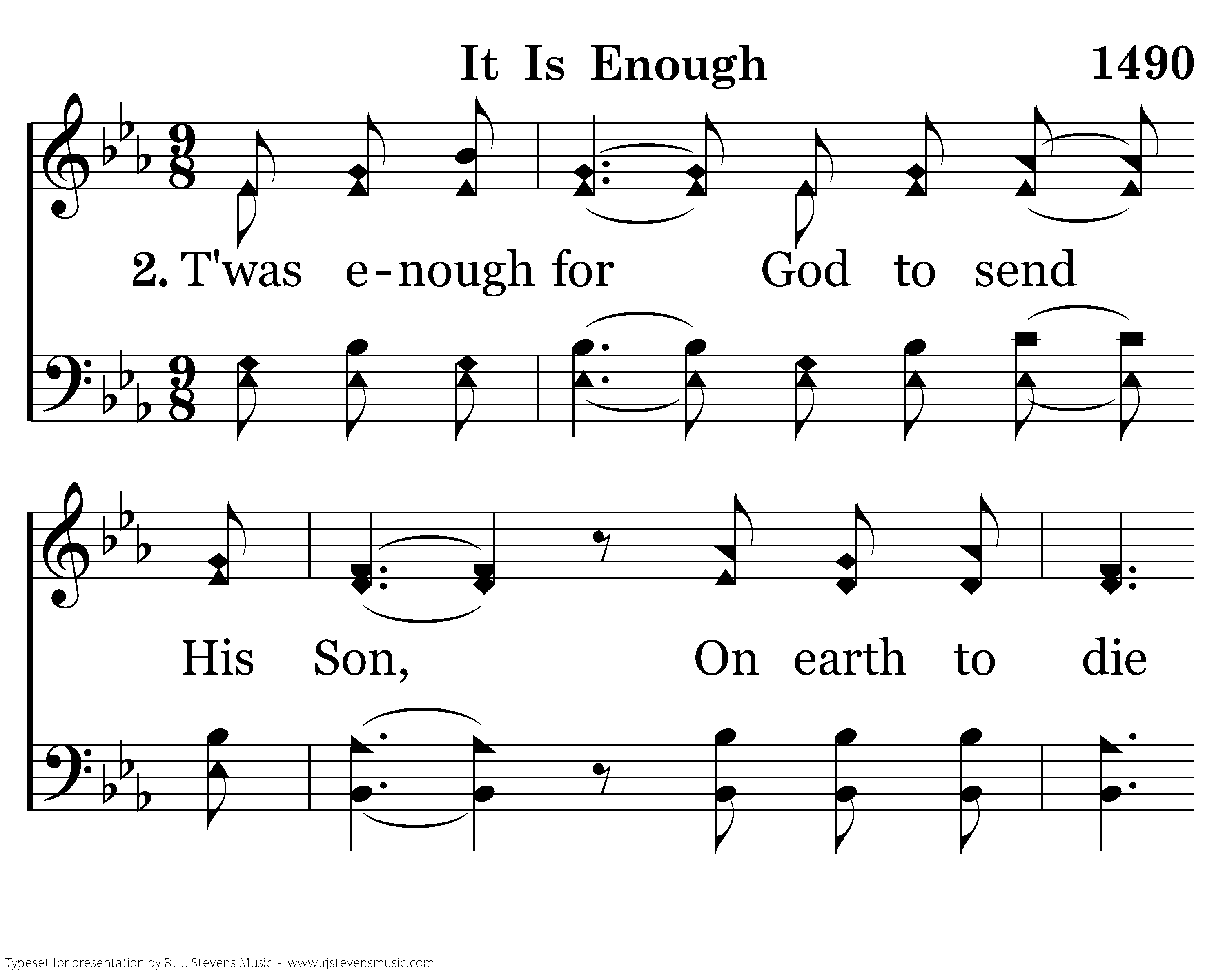 T'was enough for God to send His Son, On earth to die that holy One, He conquered death, a vict'ry won, Only His death would have done.