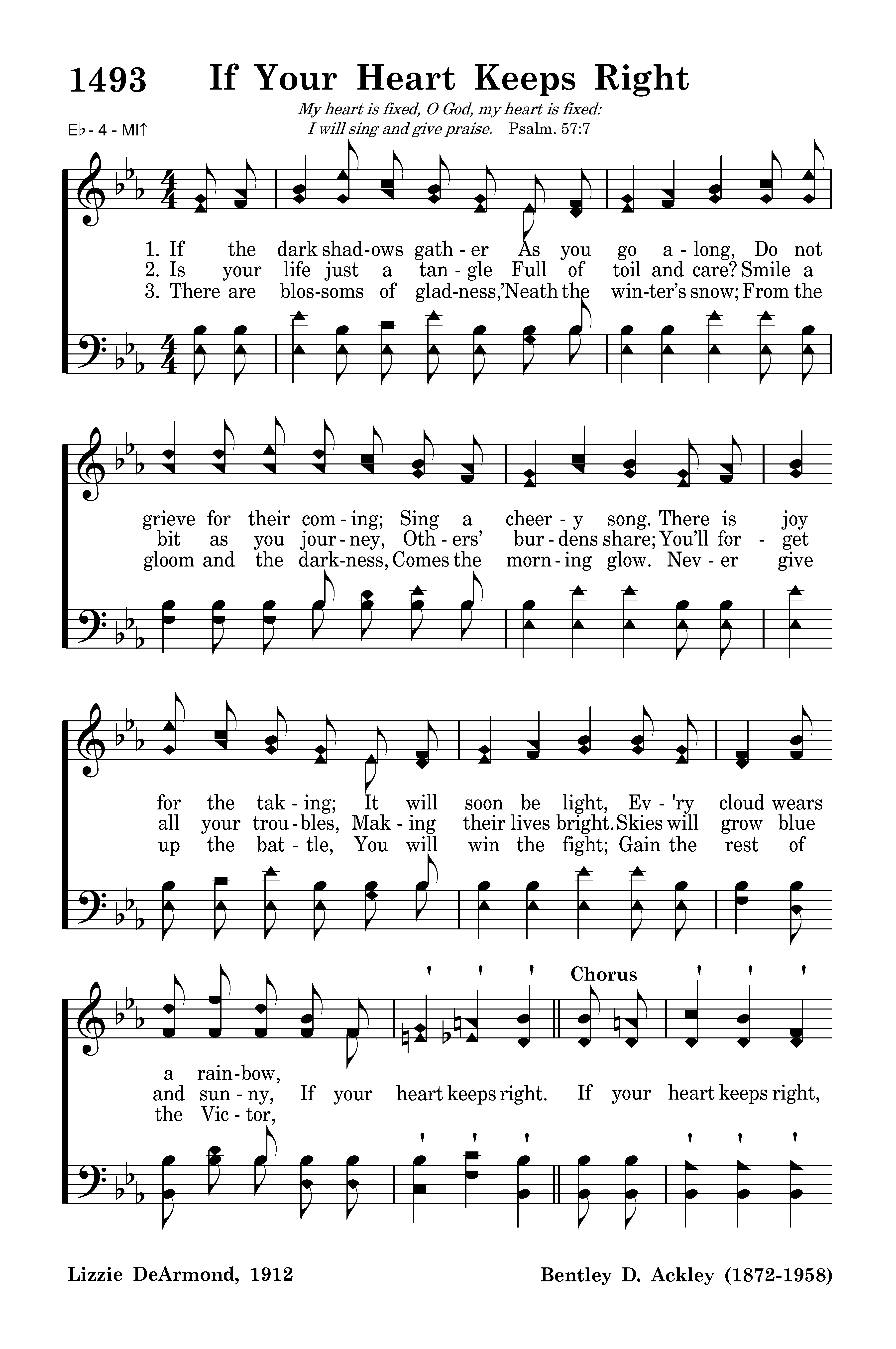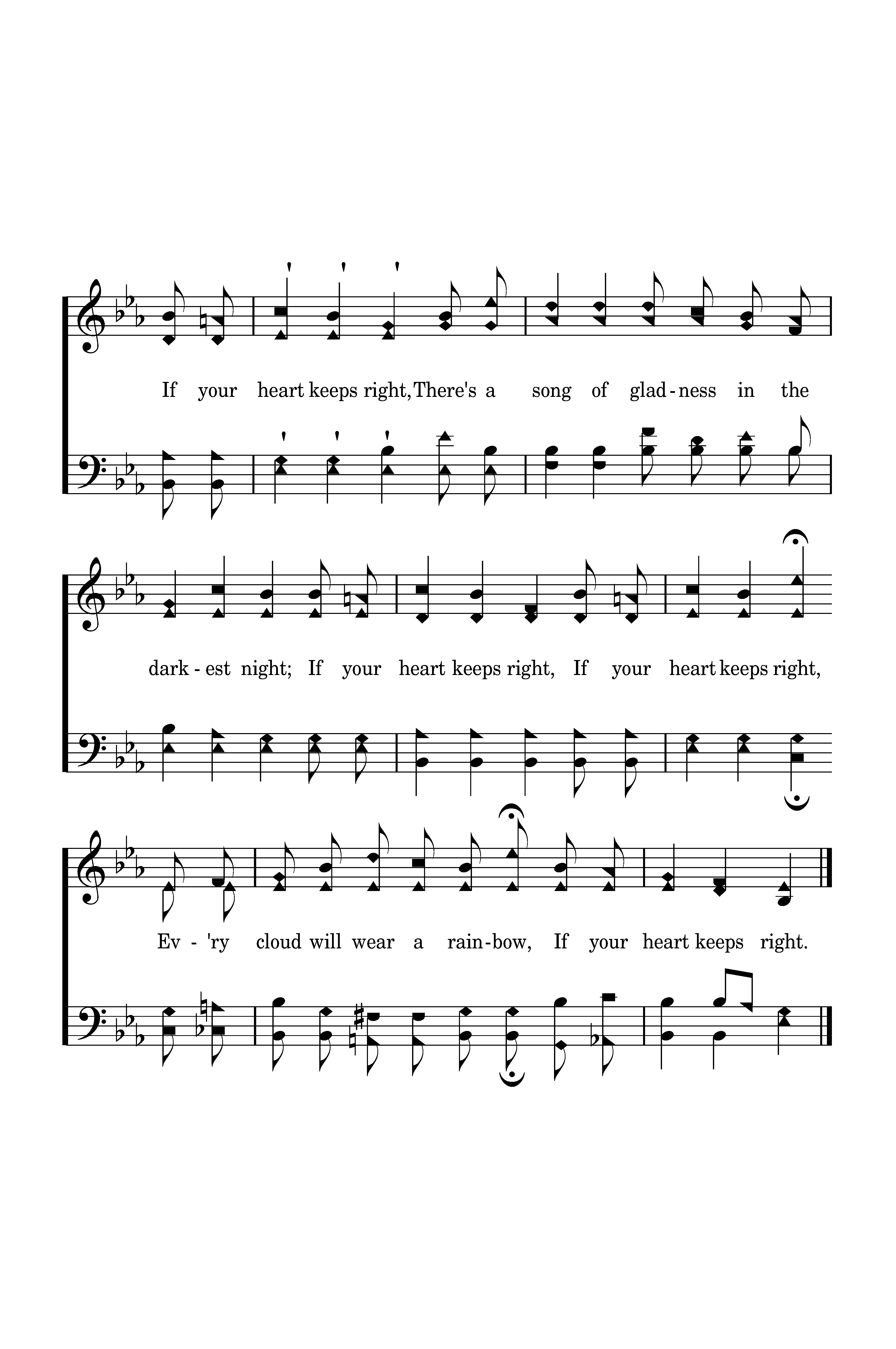 If your heart keeps right, If your heart keeps right, There's a song of gladness in the darkest night; If your heart keeps right, If your heart keeps right, Ev'ry cloud will wear a rainbow, If your heart keeps right.