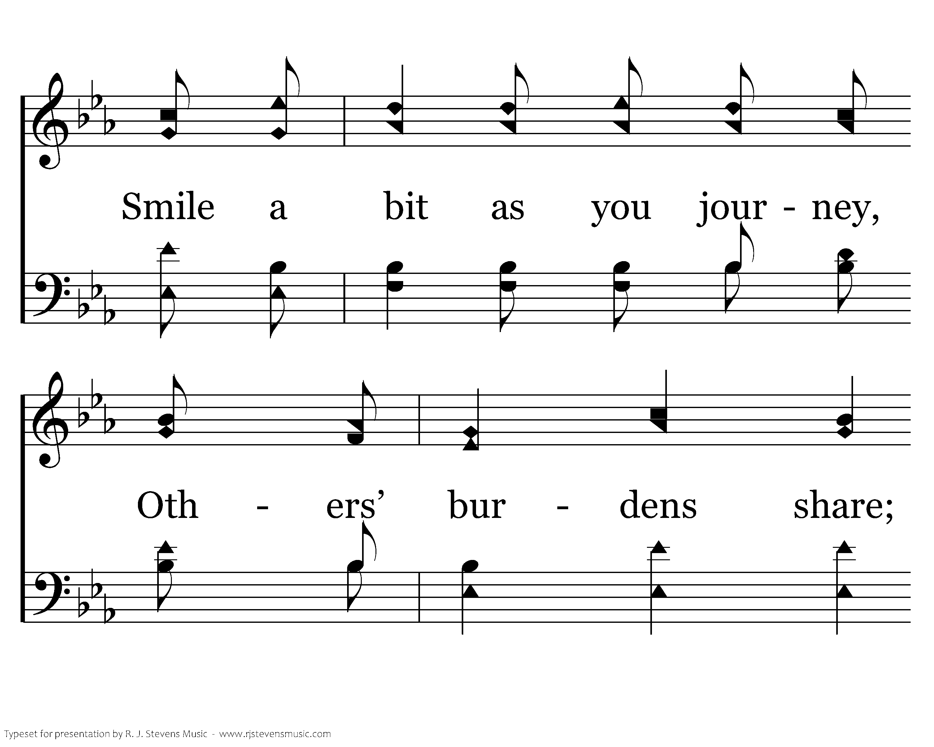 Is your life just a tangle Full of toil and care? Smile a bit as you journey, Others’ burdens share; You’ll forget all your troubles, Making their lives bright. Skies will grow blue and sunny, If your heart keeps right.