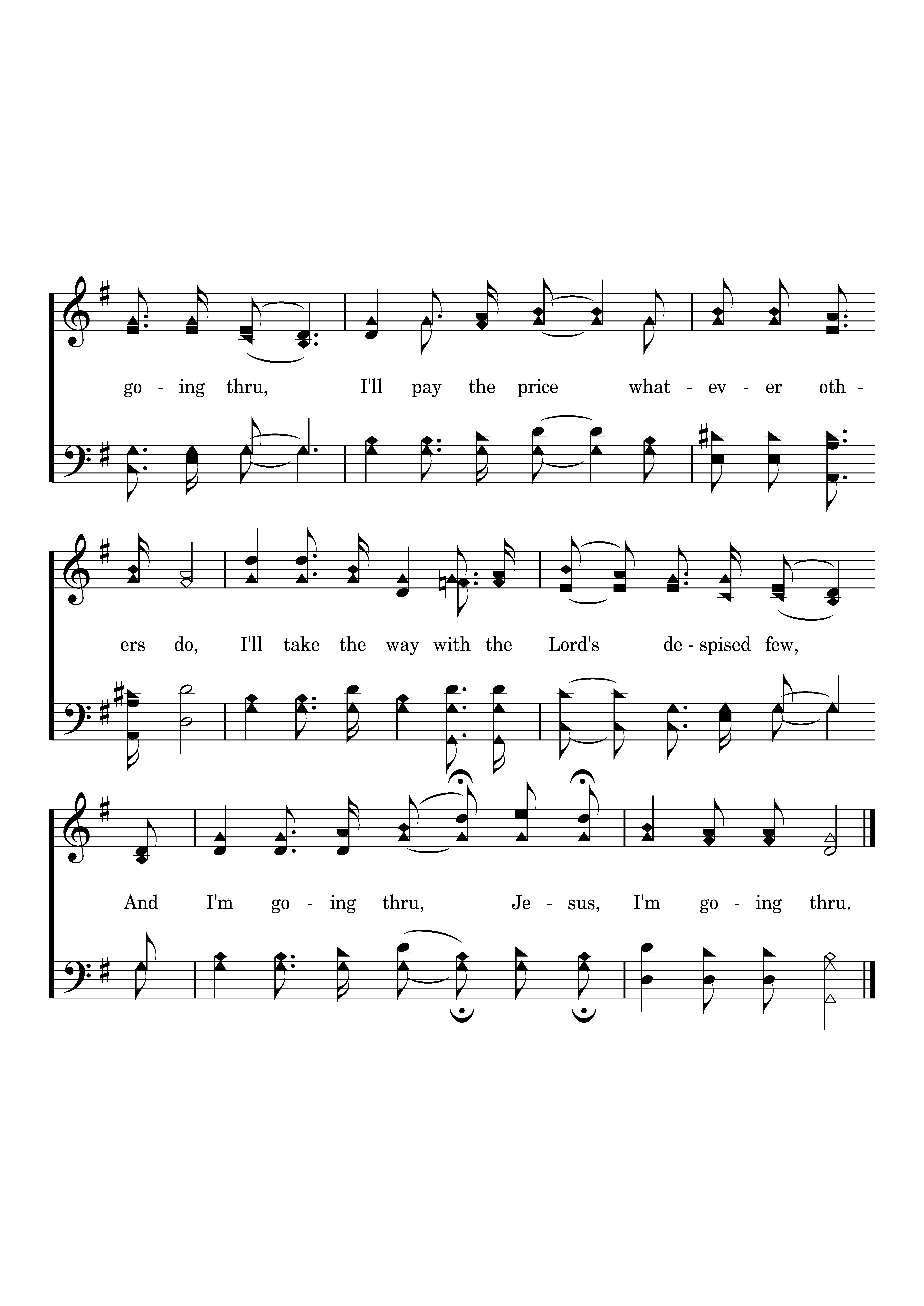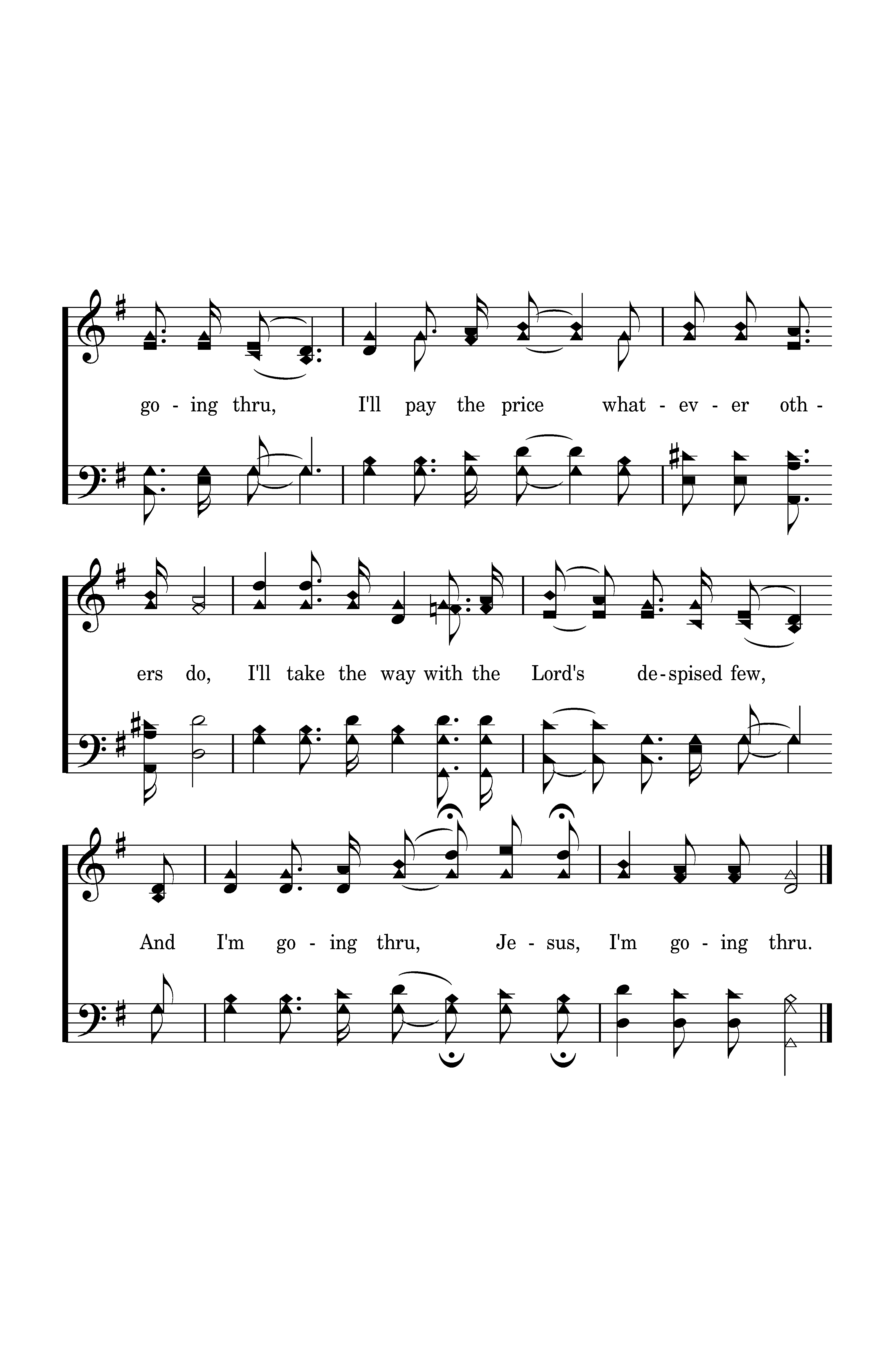 I'm going thru, yes, I'm going thru, I'll pay the price whatever others do, I'll take the way with the Lord's despised few, And I'm going thru, Jesus, I'm going thru.
