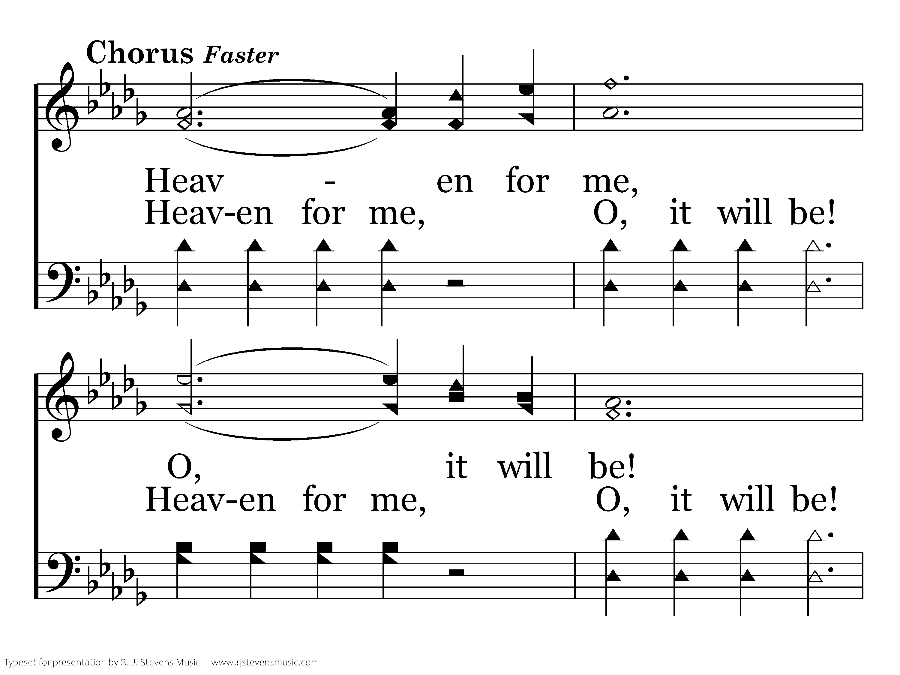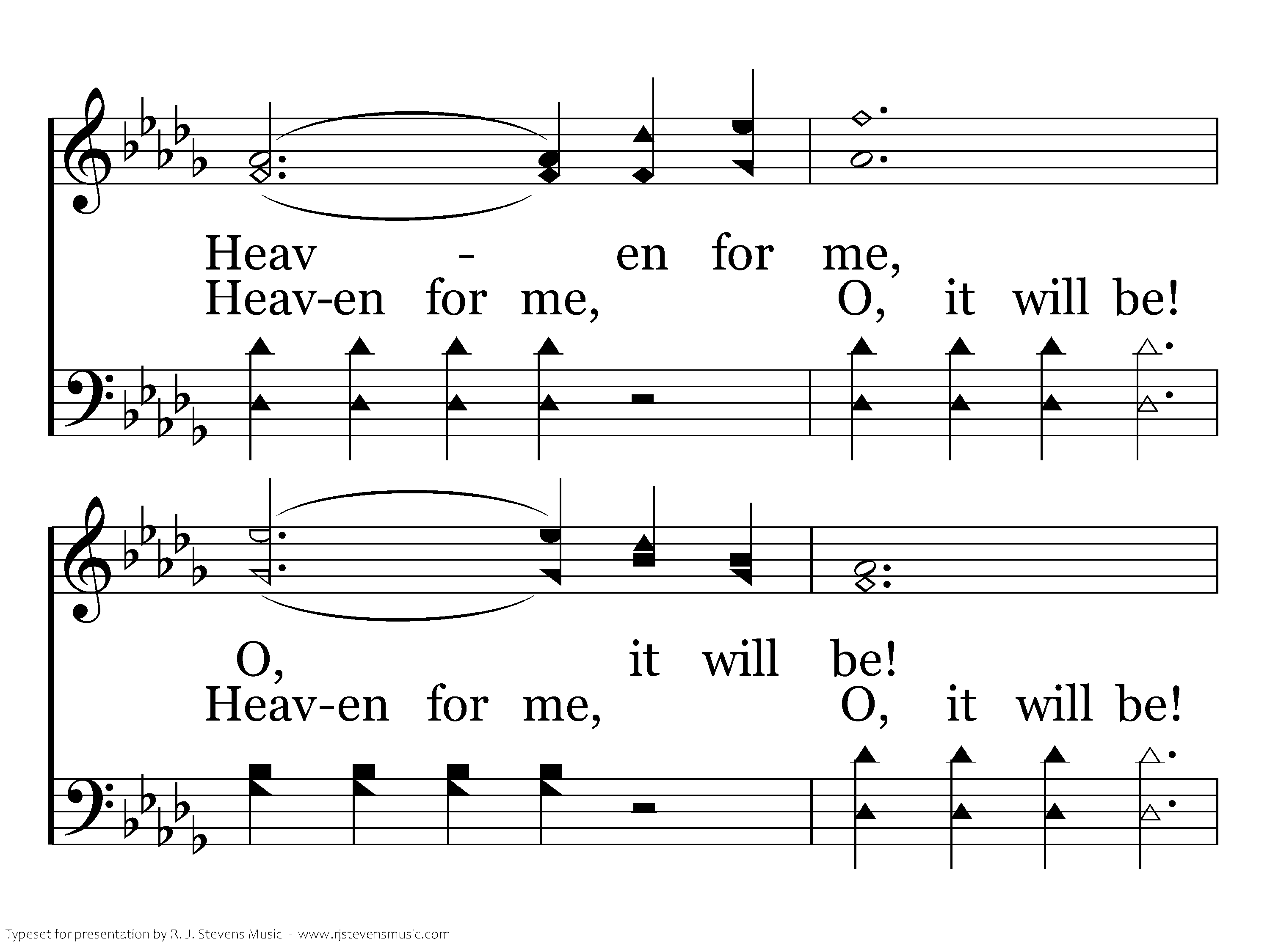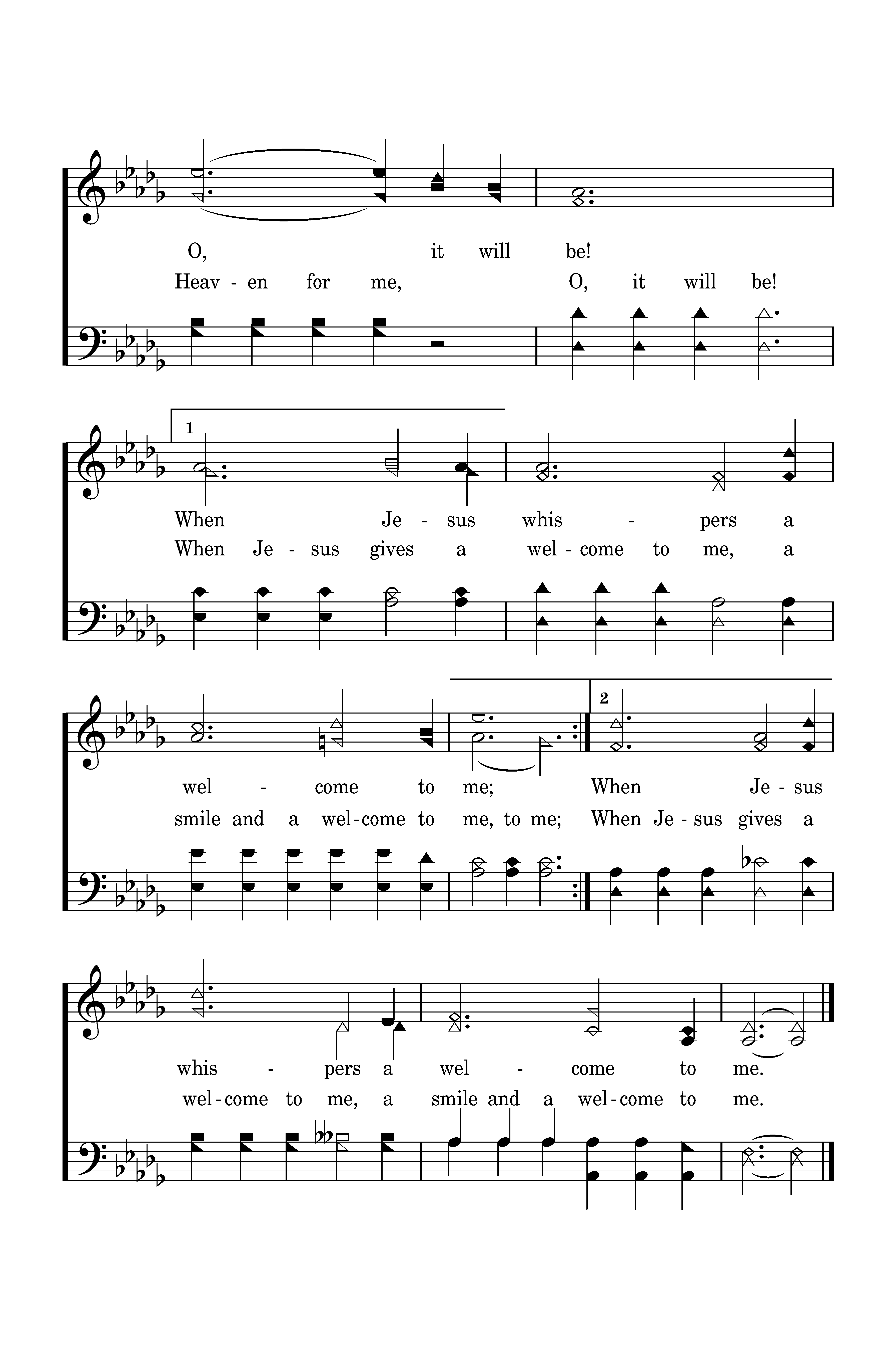 Heaven for me, O, it will be! When Jesus whispers a welcome to me; When Jesus whispers a welcome to me. Heaven for me, O, it will be! When Jesus whispers a welcome to me; When Jesus gives a welcome to me, a smile and a welcome to me.