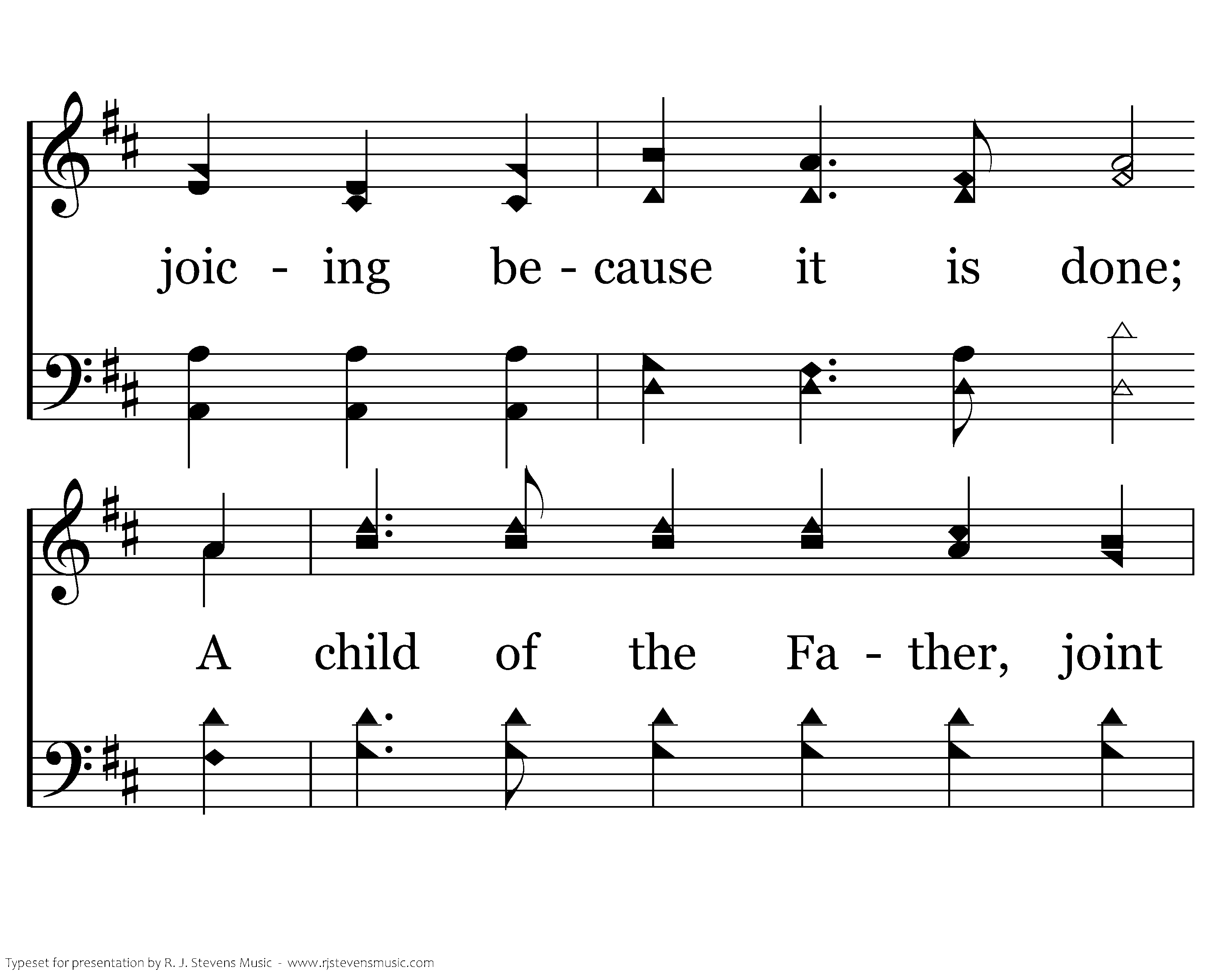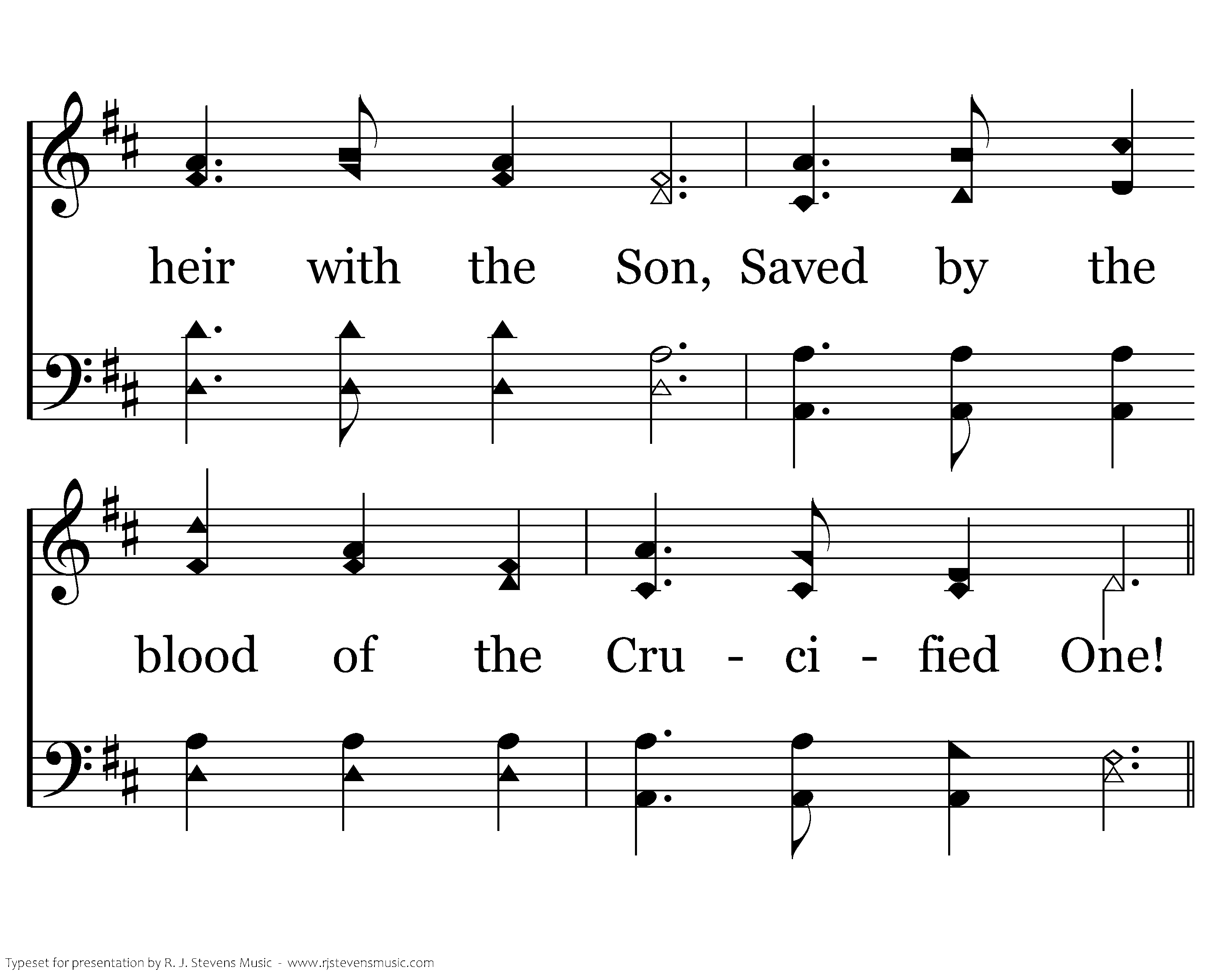 Saved by the blood of the Crucified One! The angels rejoicing because it is done; A child of the Father, joint heir with the Son, Saved by the blood of the Crucified One!