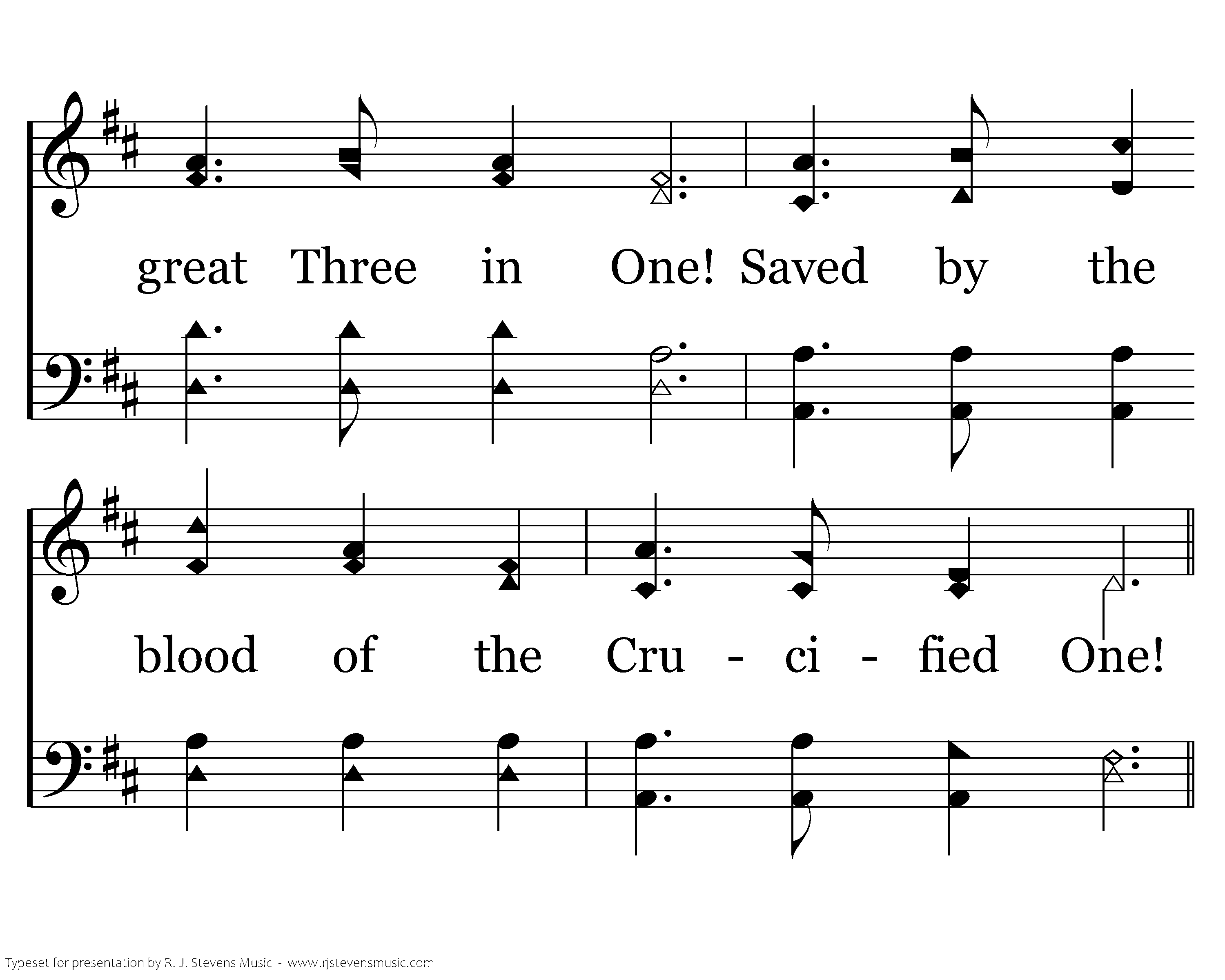 Saved by the blood of the Crucified One! All hail to the Father, all hail to the Son, All hail to the Spirit, the great Three in One! Saved by the blood of the Crucified One!