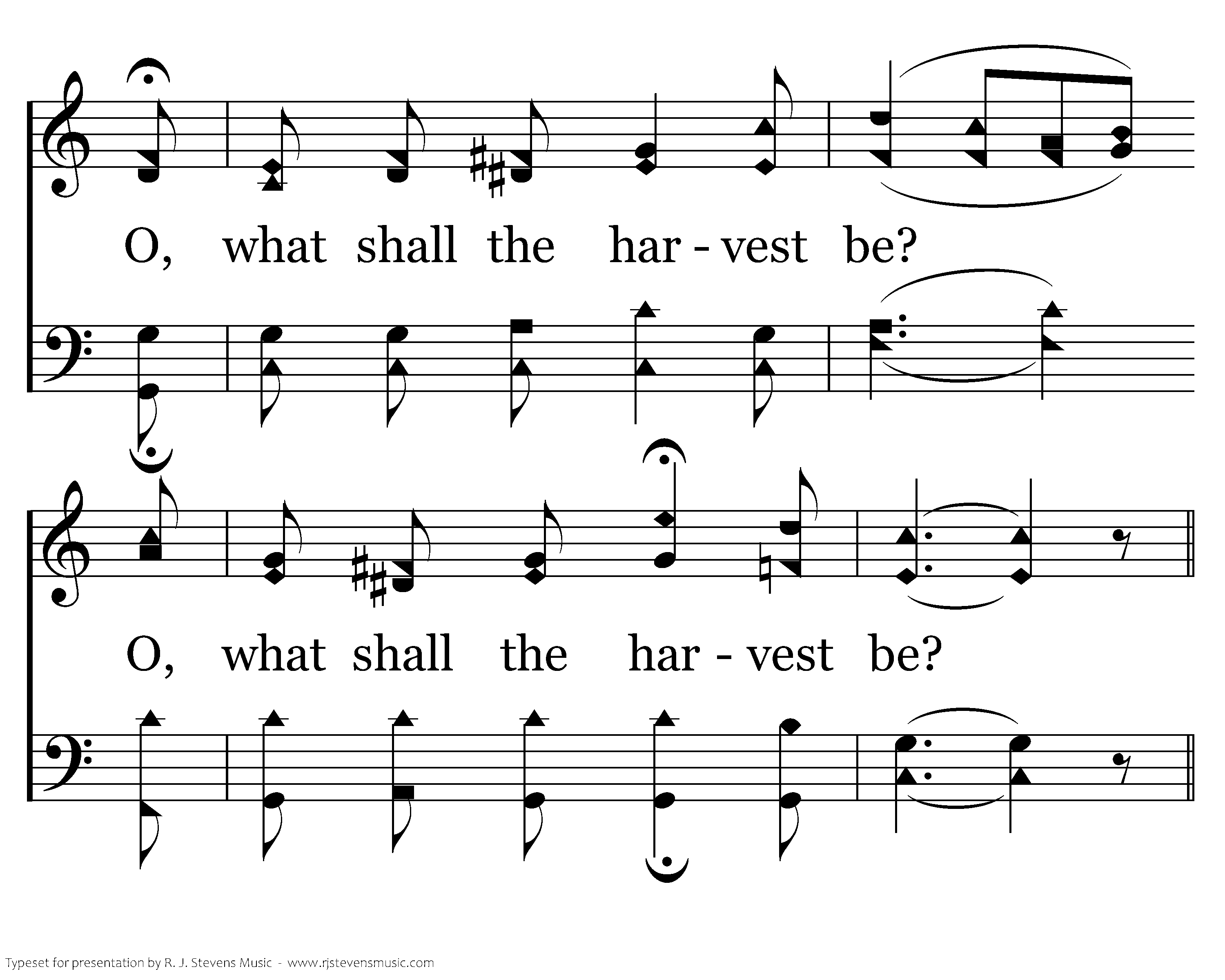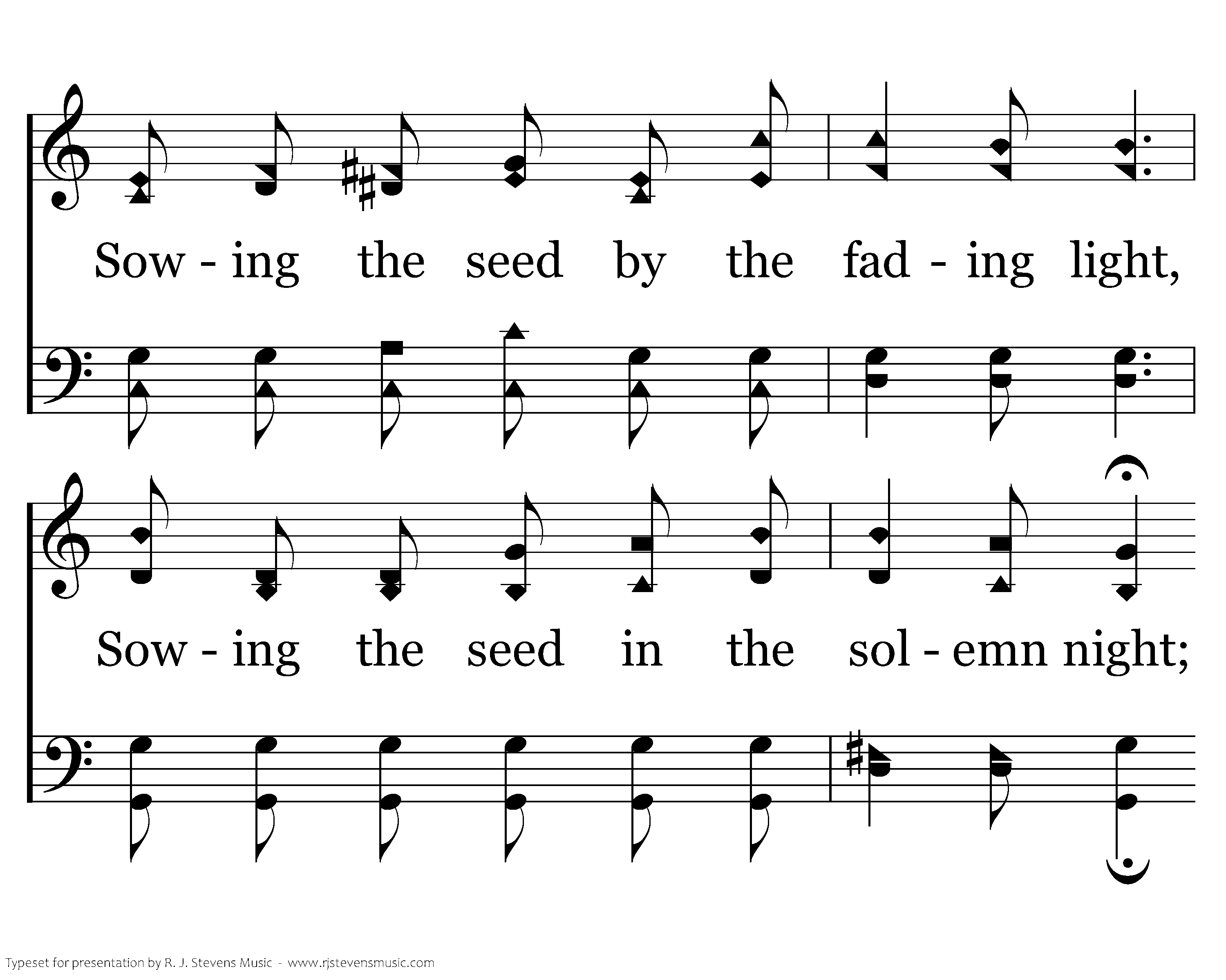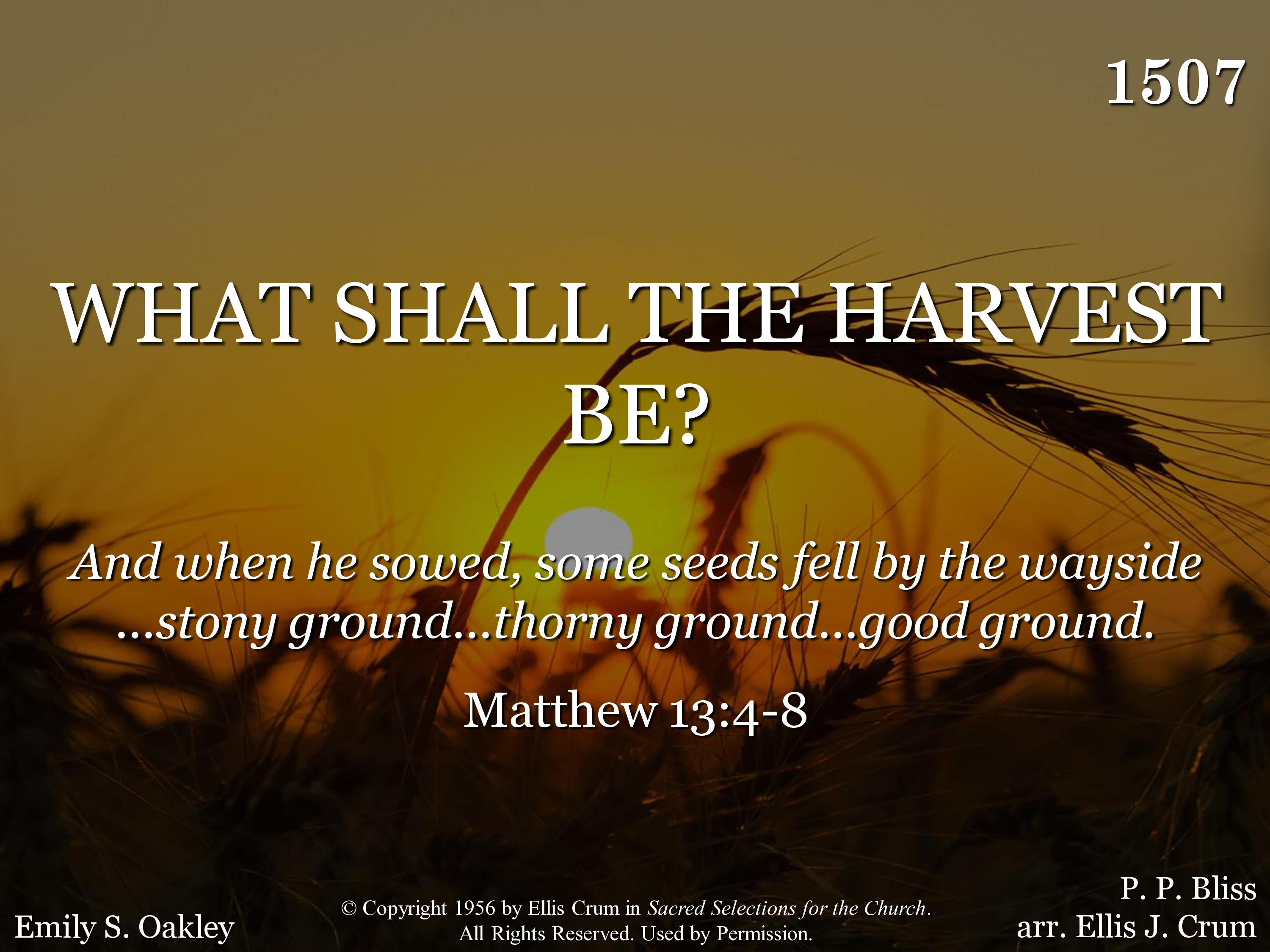 Sowing the seed by the daylight fair, Sowing the seed by the noonday glare, Sowing the seed by the fading light, Sowing the seed in the solemn night; O, what shall the harvest be? O, what shall the harvest be?