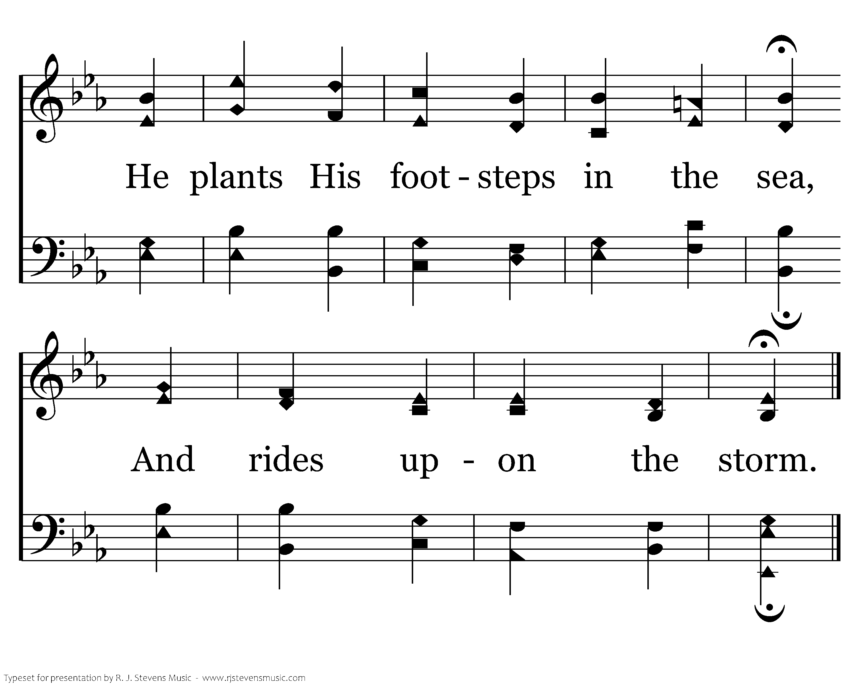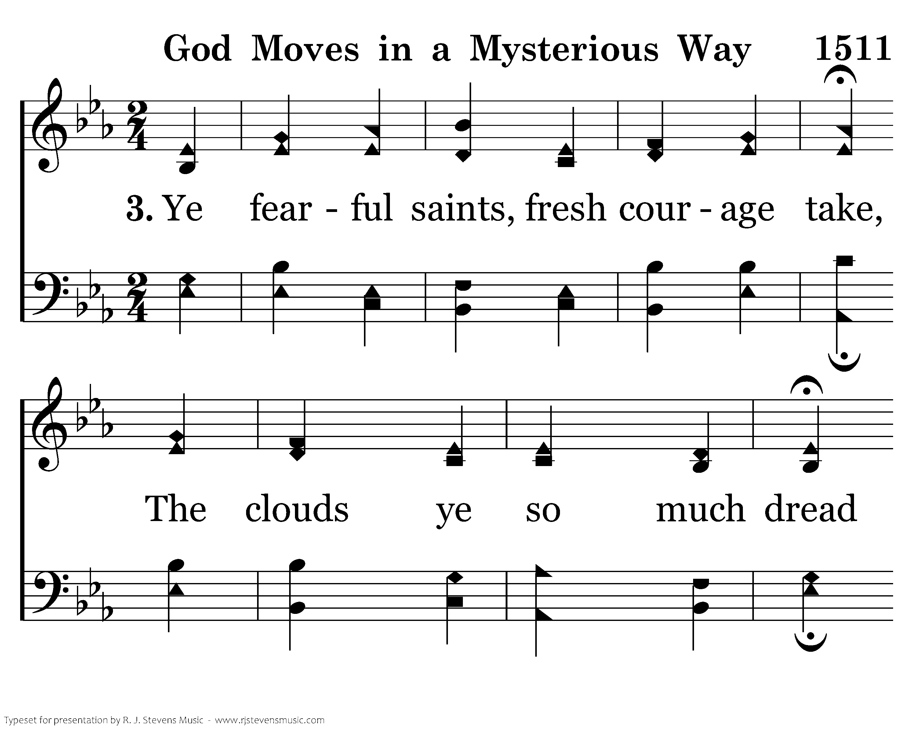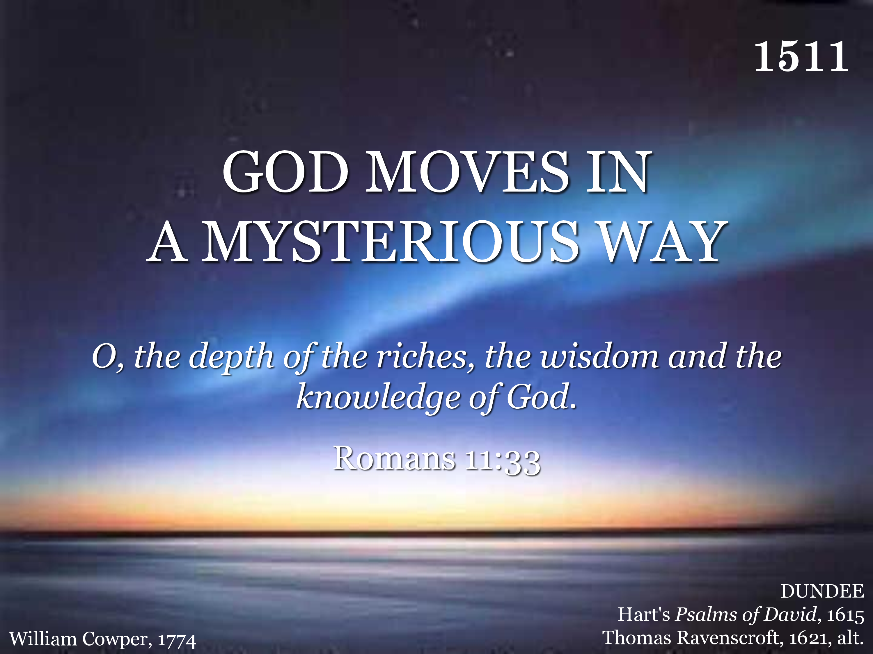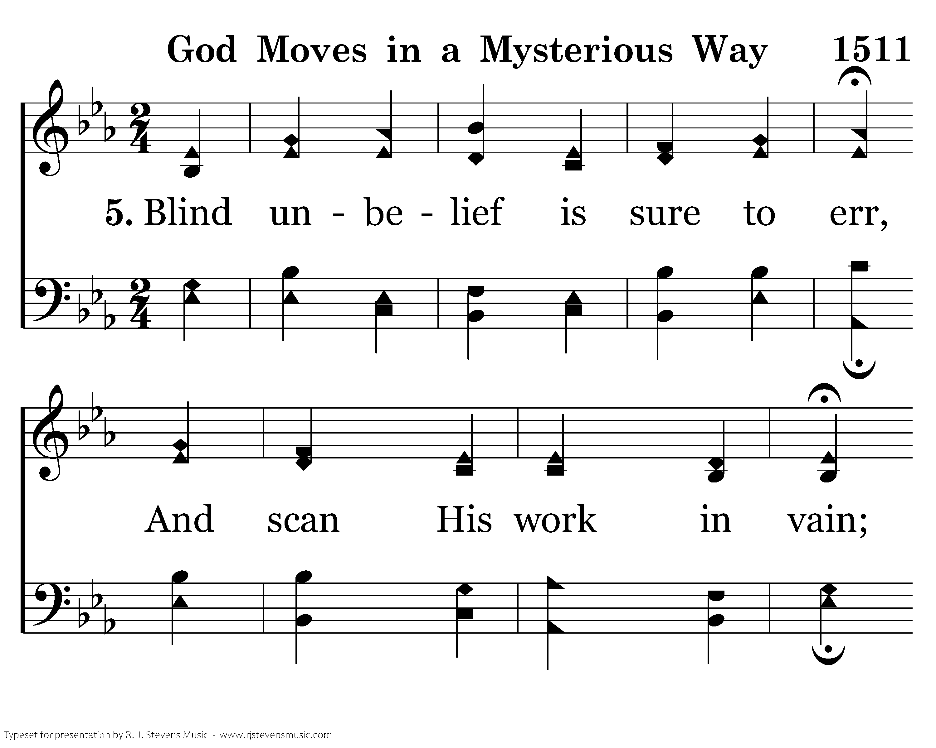 God moves in a mysterious way, His wonders to perform; He plants His footsteps in the sea, And rides upon the storm.