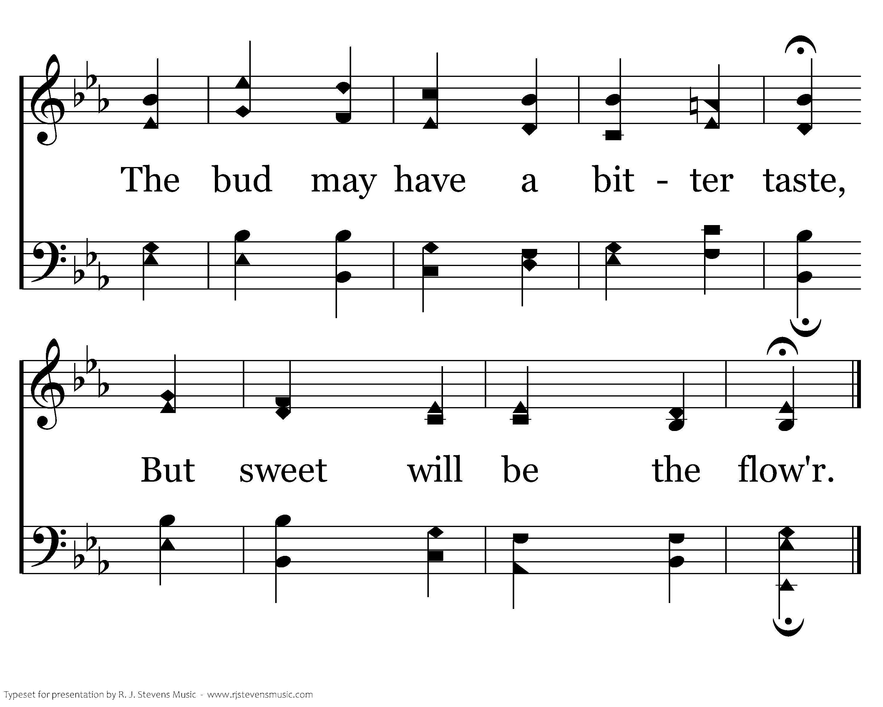 His purposes will ripen fast, Unfolding ev'ry hour; The bud may have a bitter taste, But sweet will be the flow'r.