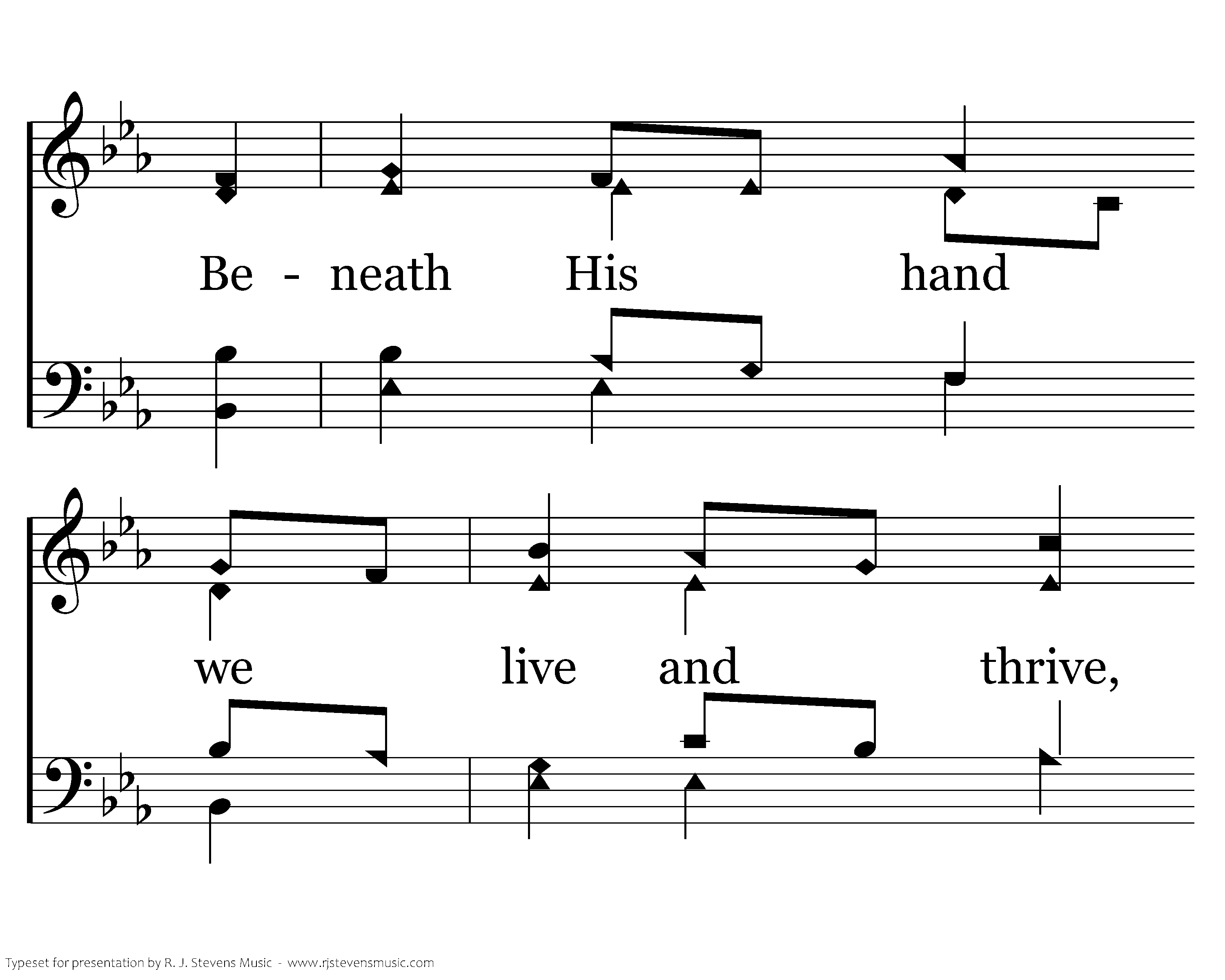 From Him our pow'rs derive; Upon His strength we call; Beneath His hand we live and thrive, Most glorious Lord of all.