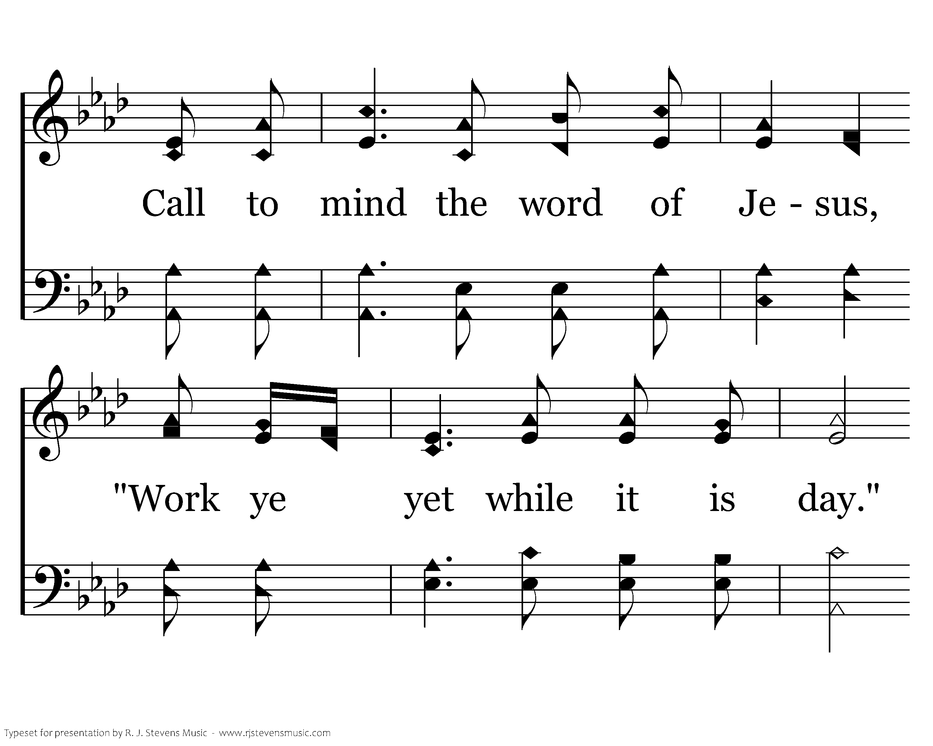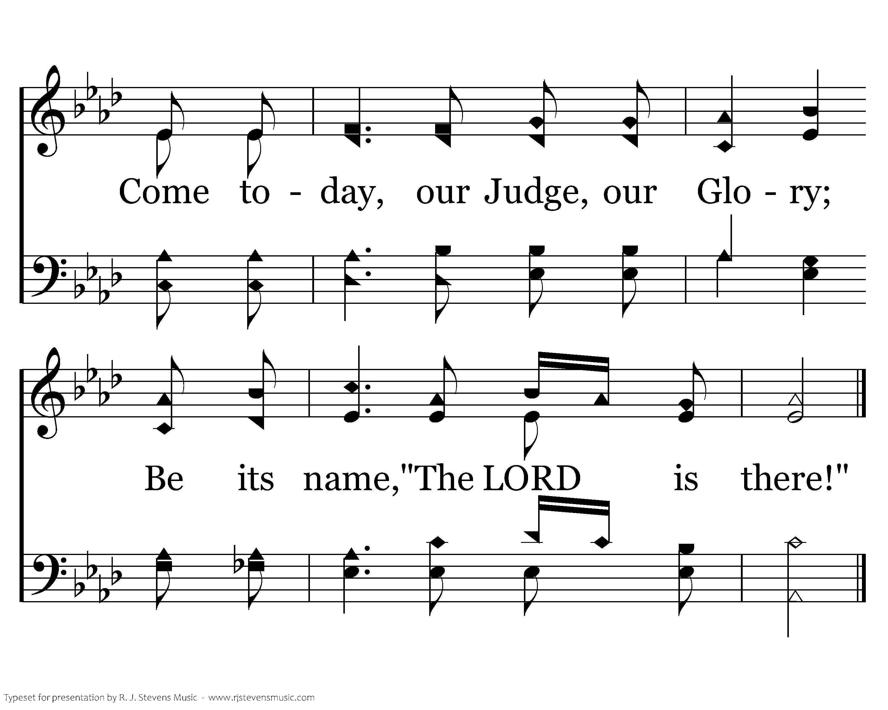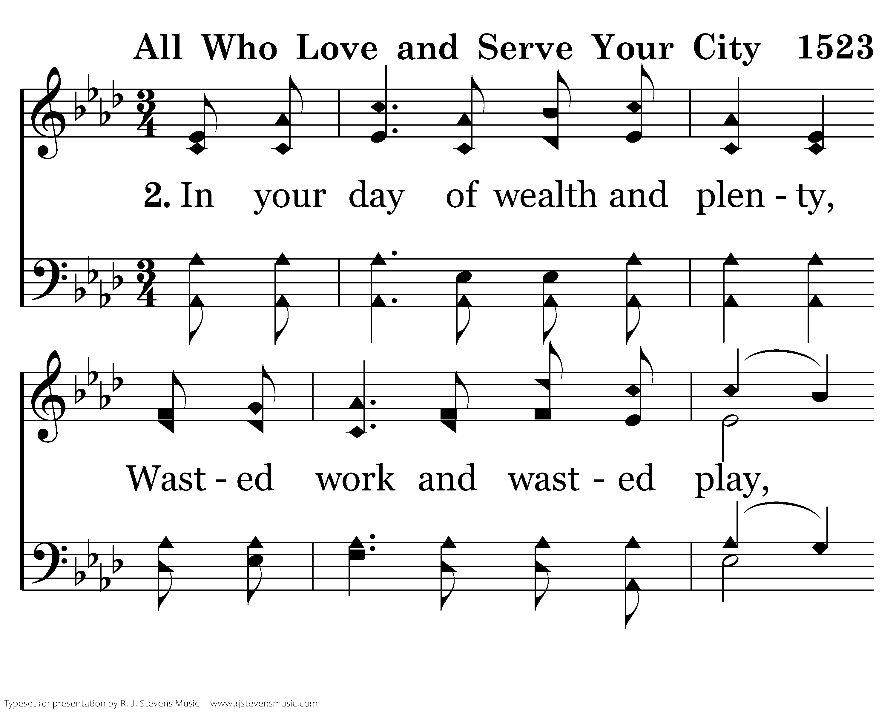 In your day of wealth and plenty, Wasted work and wasted play, Call to mind the word of Jesus, "Work ye yet while it is day." For all days are days of judgment, And the Lord is waiting still, Drawing near to all who spurn Him, Off'ring peace from Calv'ry's hill. Risen Lord, shall yet the city Be the city of despair? Come today, our Judge, our Glory; Be its name, "The LORD is there!"