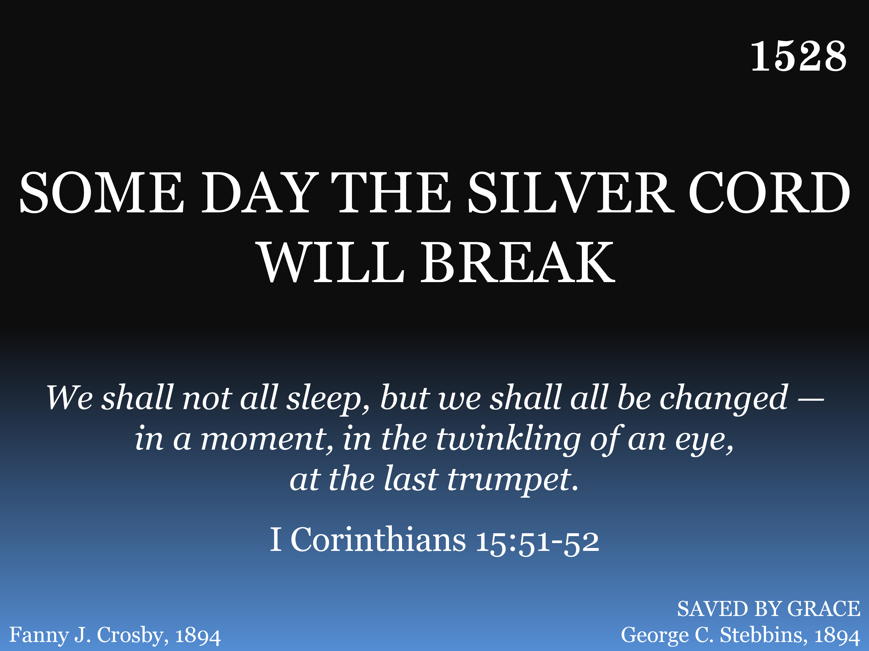 Some day the silver cord will break, And I no more as now shall sing; But, O, the joy when I shall wake Within the palace of the King!