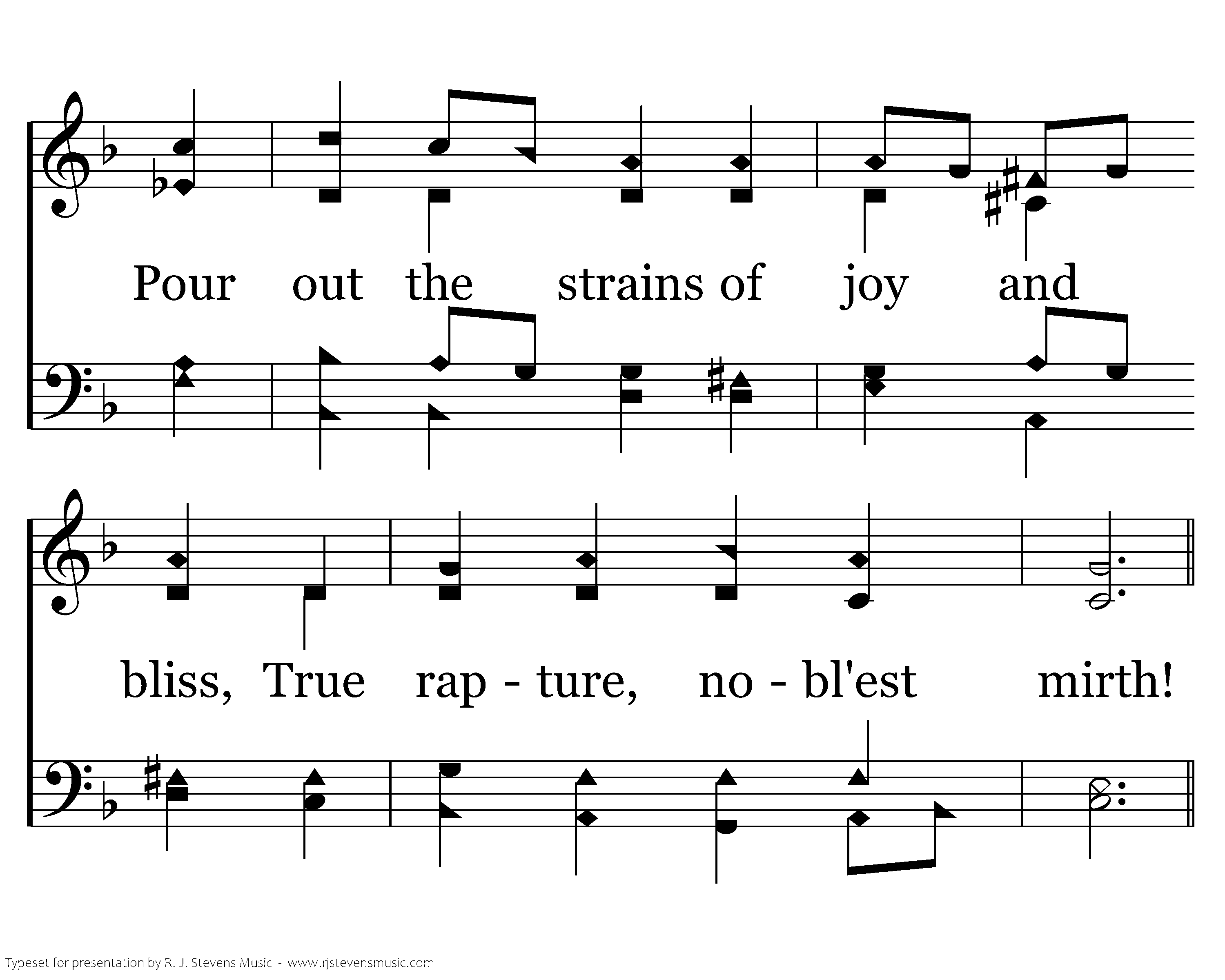 With all the angel choirs, With all the saints on earth, Pour out the strains of joy and bliss, True rapture, nobl'est mirth!