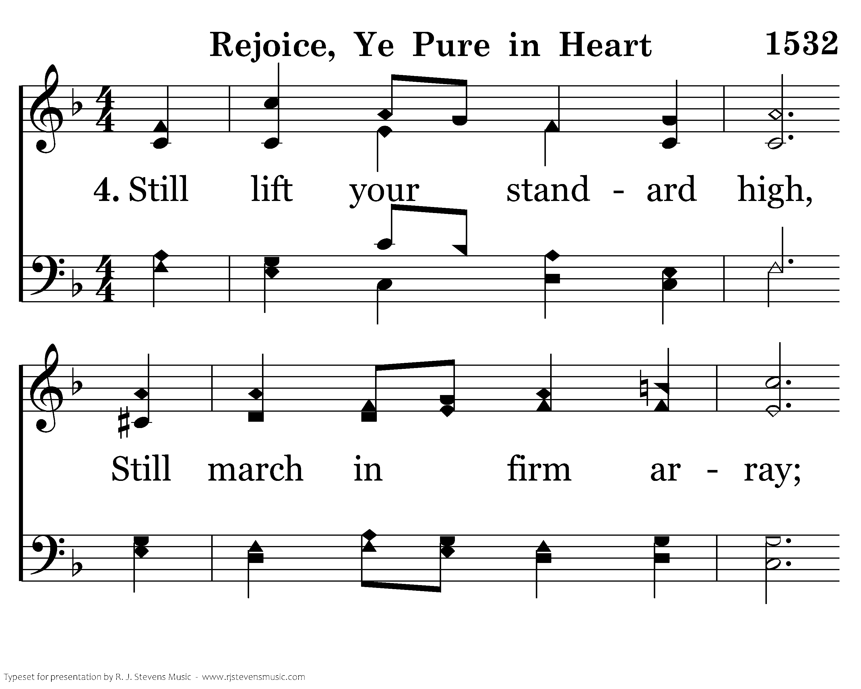 Still lift your standard high, Still march in firm array; As warriors thru the darkness toil Till dawns the golden day.