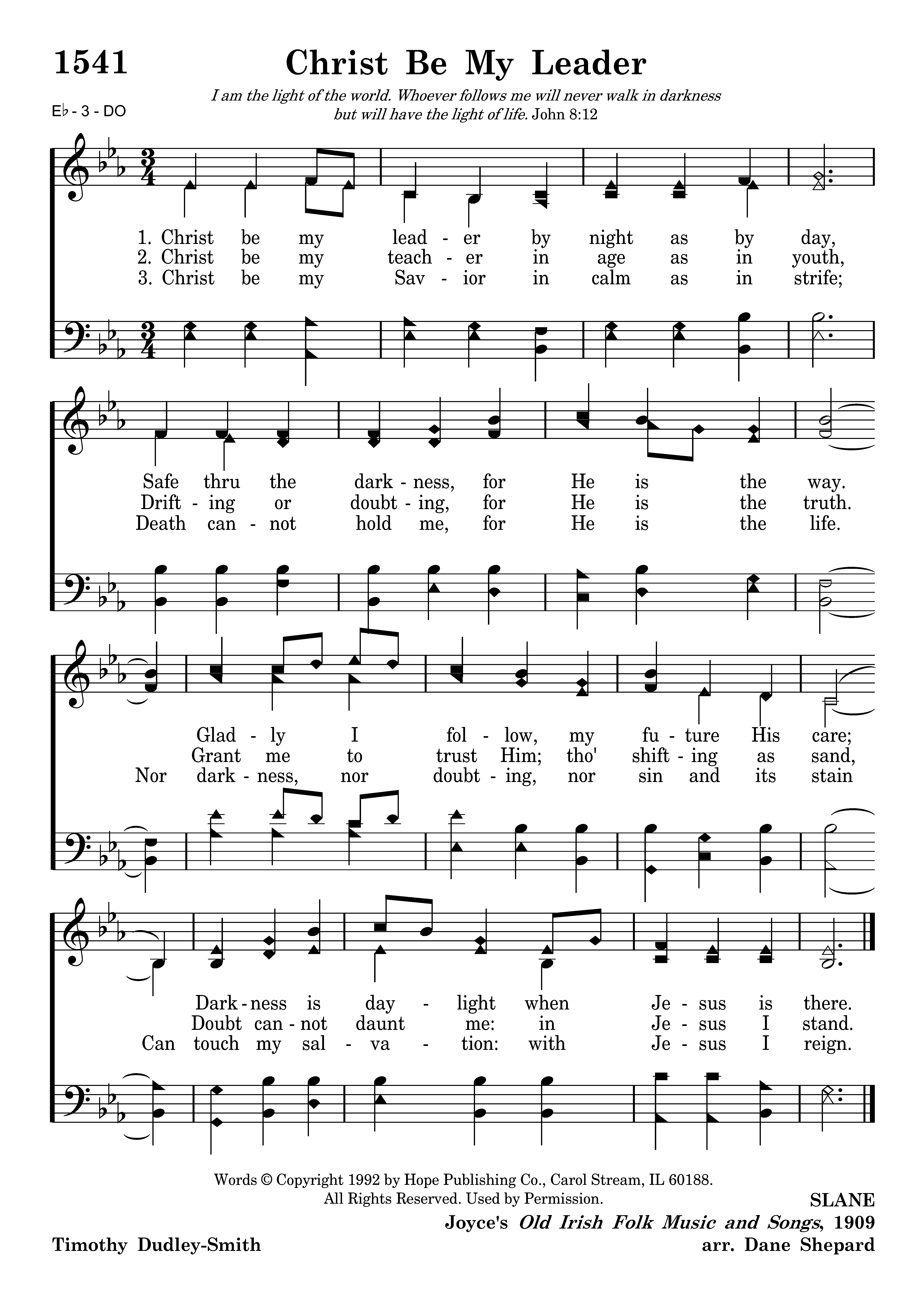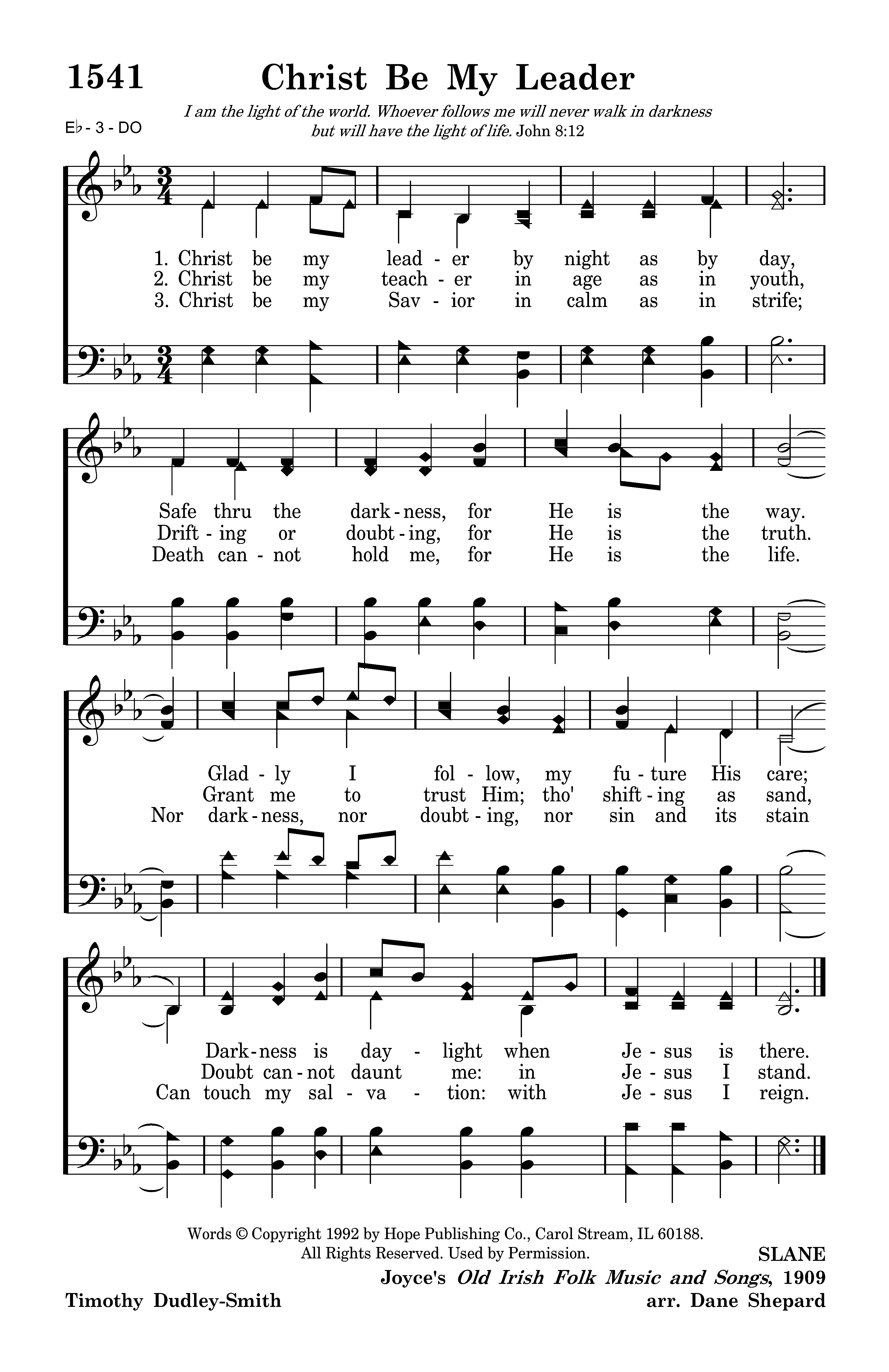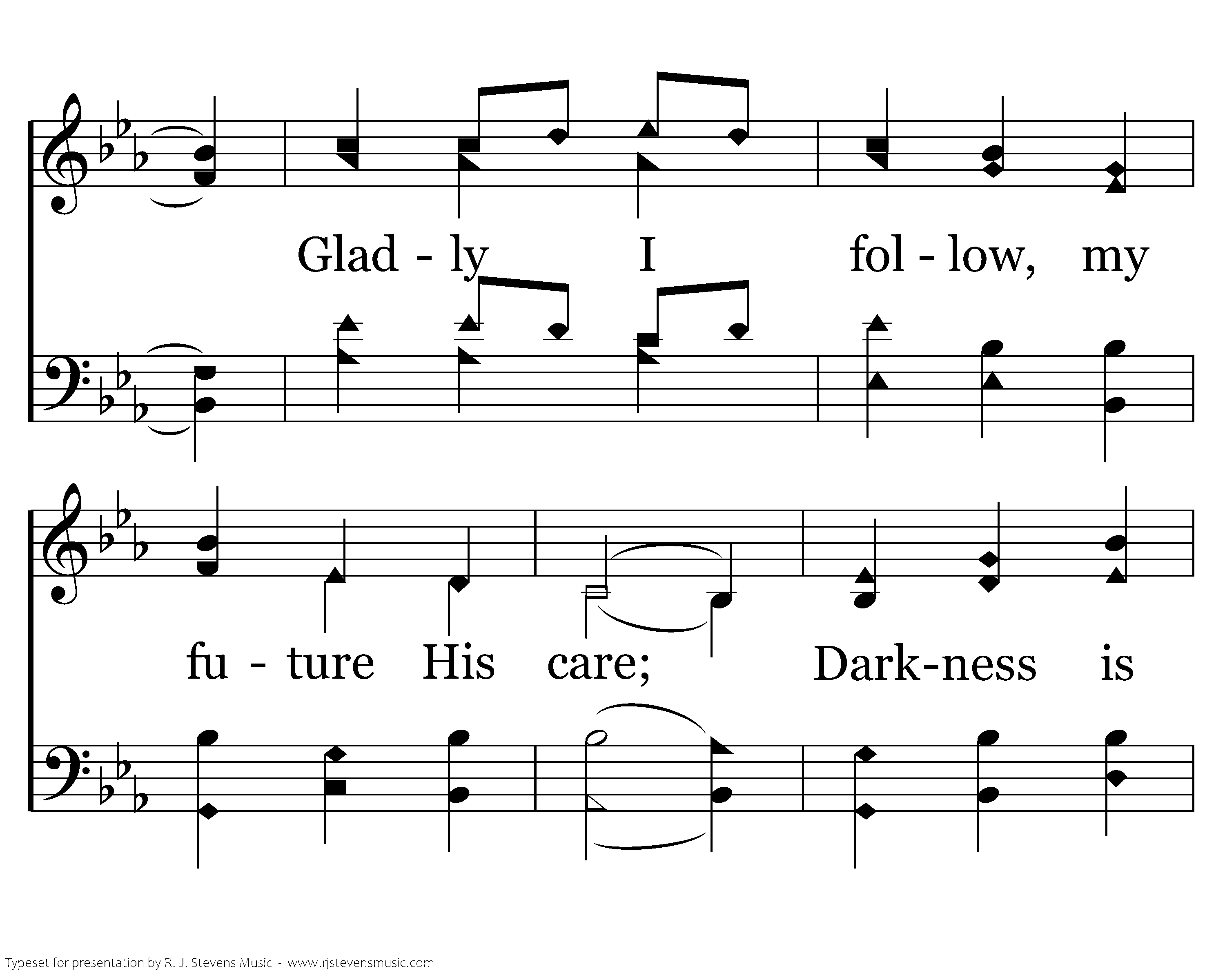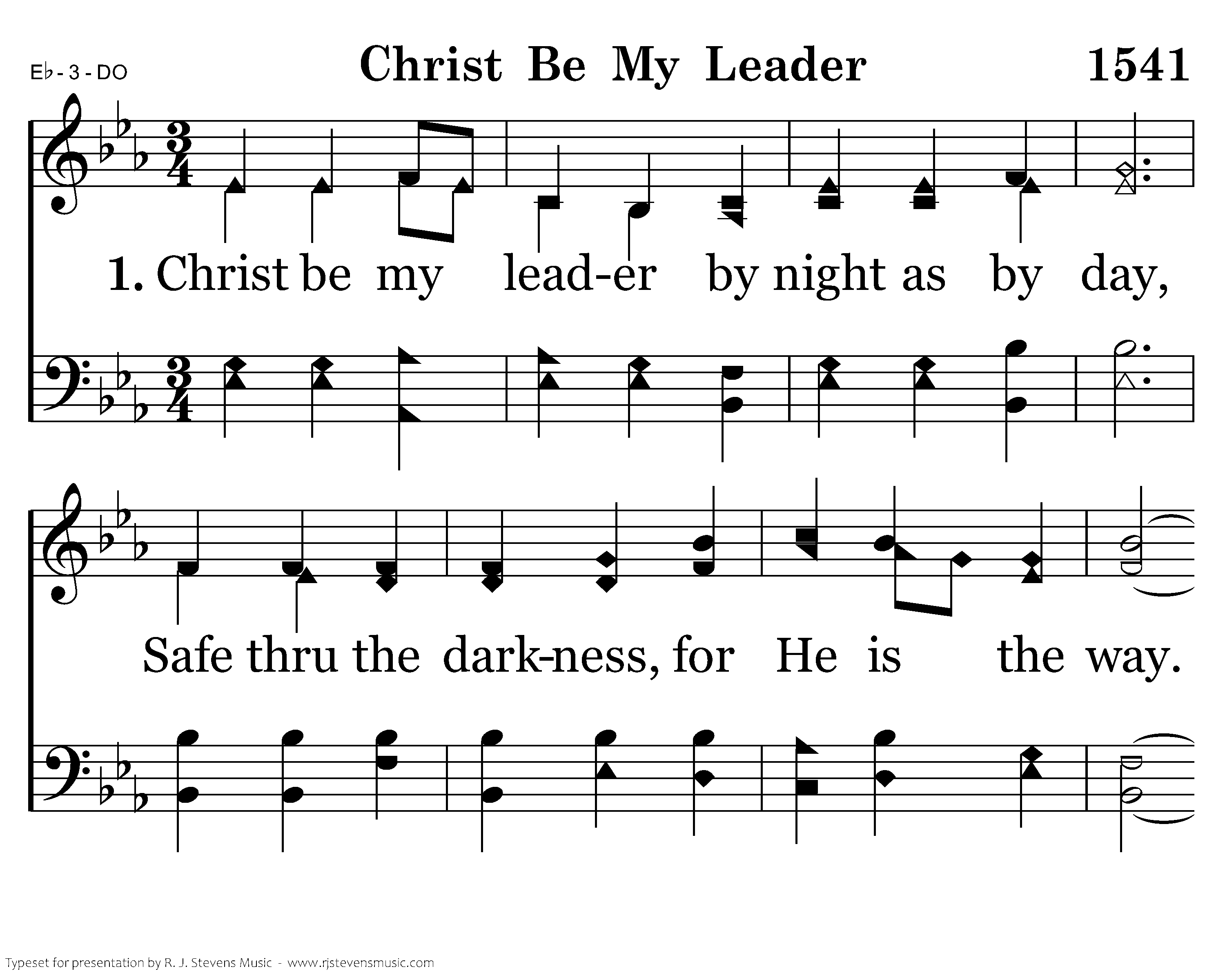 Christ be my leader by night as by day, Safe thru the darkness, for He is the way. Gladly I follow, my future His care; Darkness is daylight when Jesus is there.