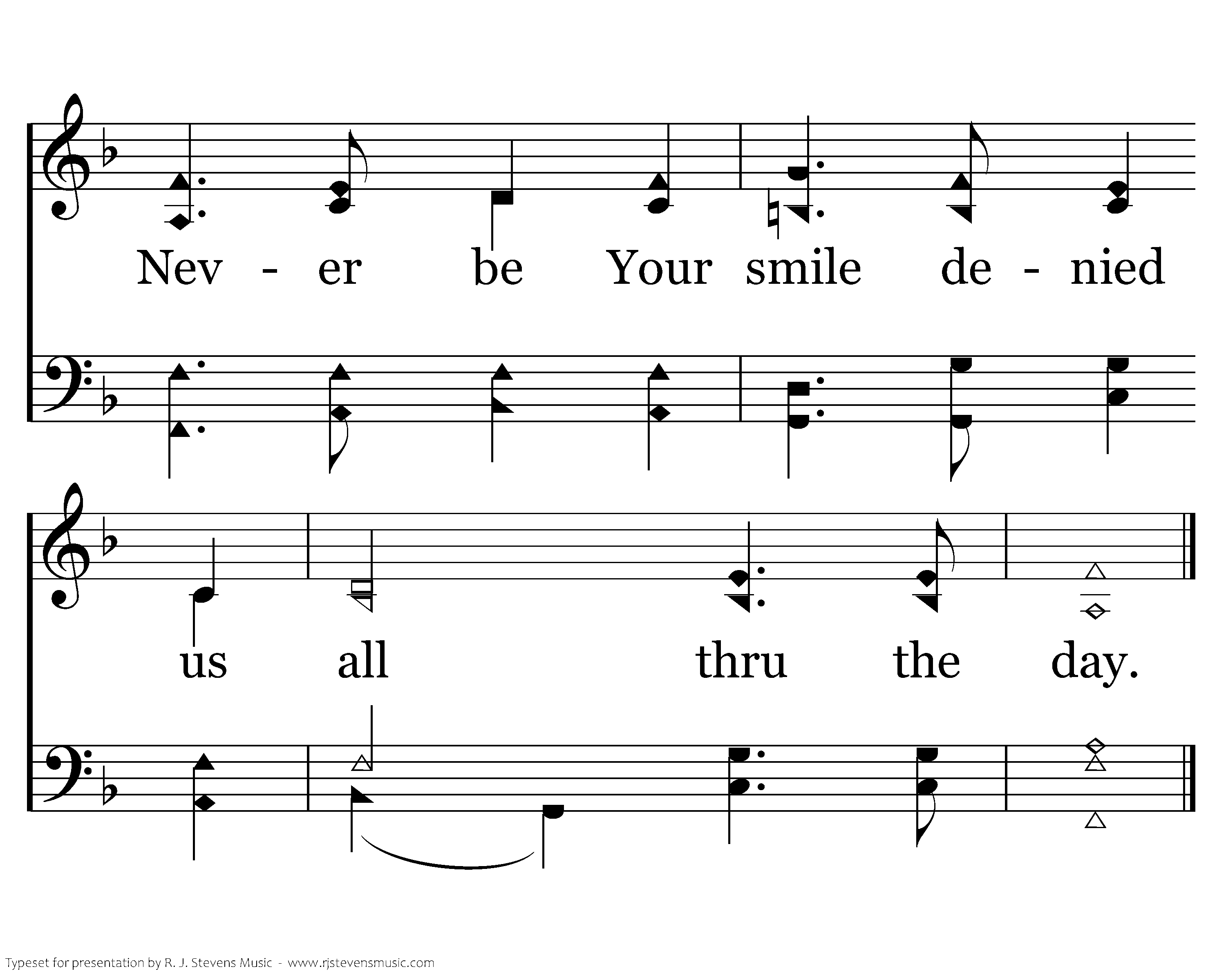 And when morn again shall call us to run life's way, May we still, what e'er befall us, Your will obey. From the pow'r of evil hide us, in the narrow pathway guide us, Never be Your smile denied us all thru the day.