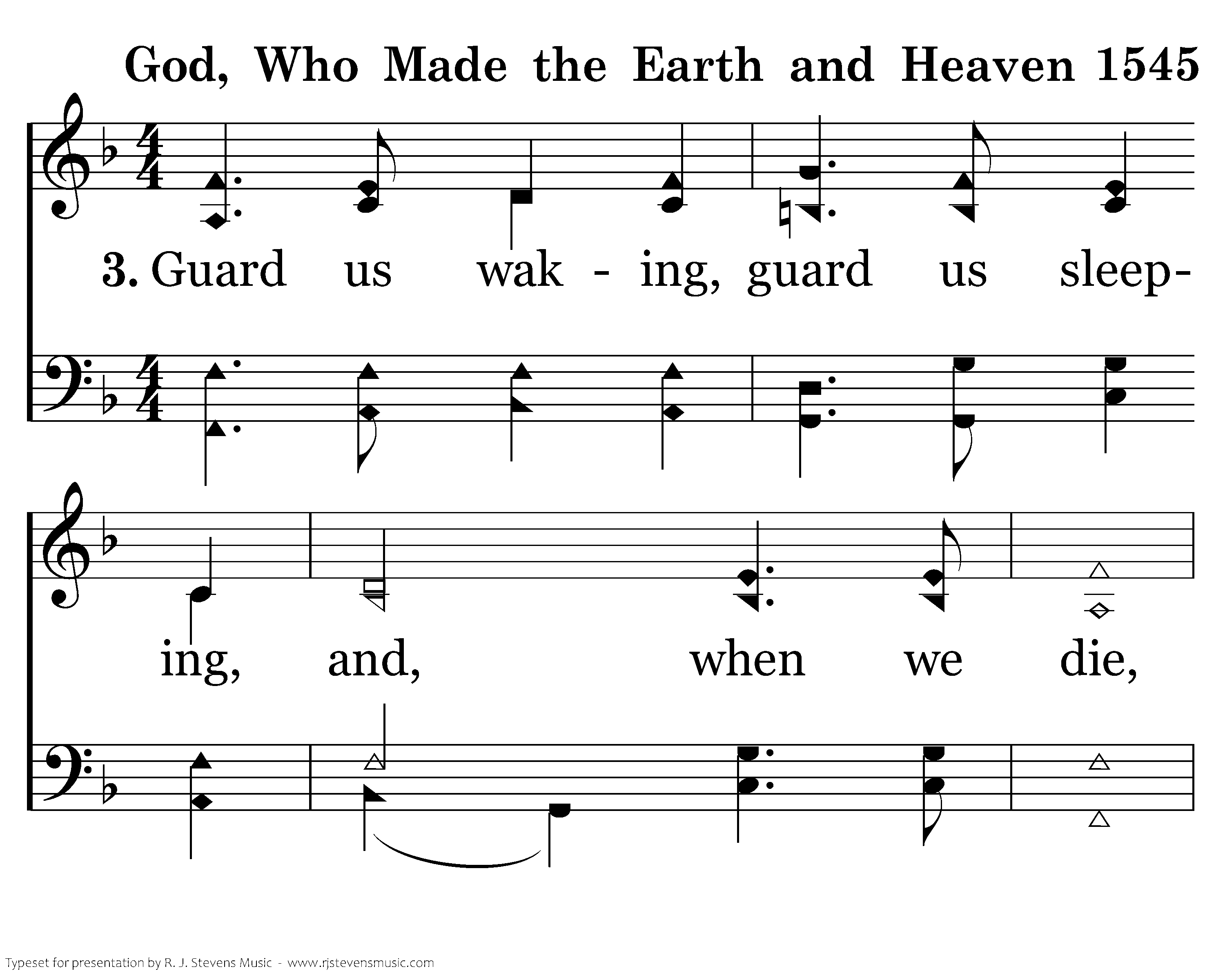 God, who made the earth and heaven, darkness and light: You the day for work have given, for rest the night. May Your angel guards defend us, slumber sweet Your mercy send us, Holy dreams and hopes attend us all thru the night.