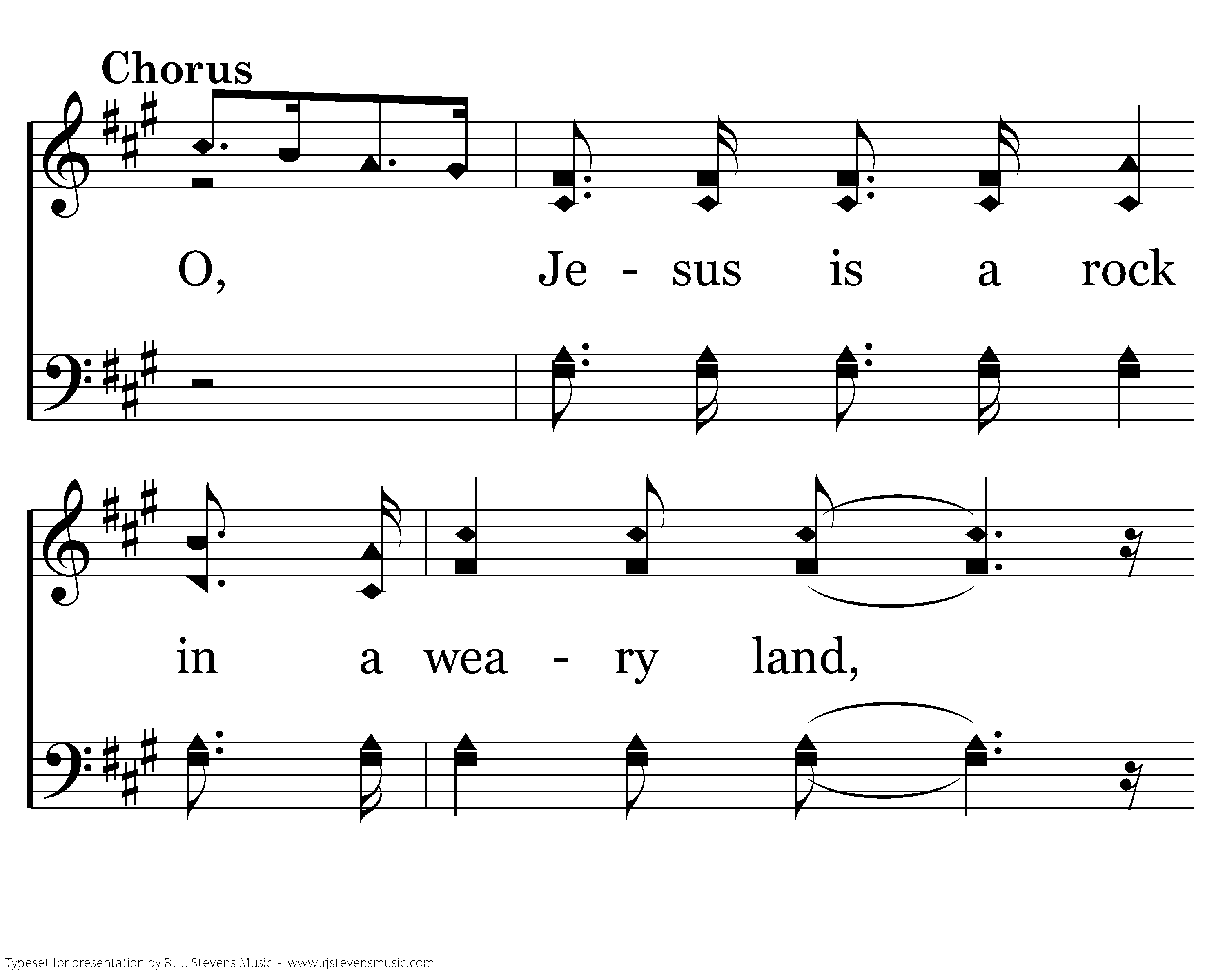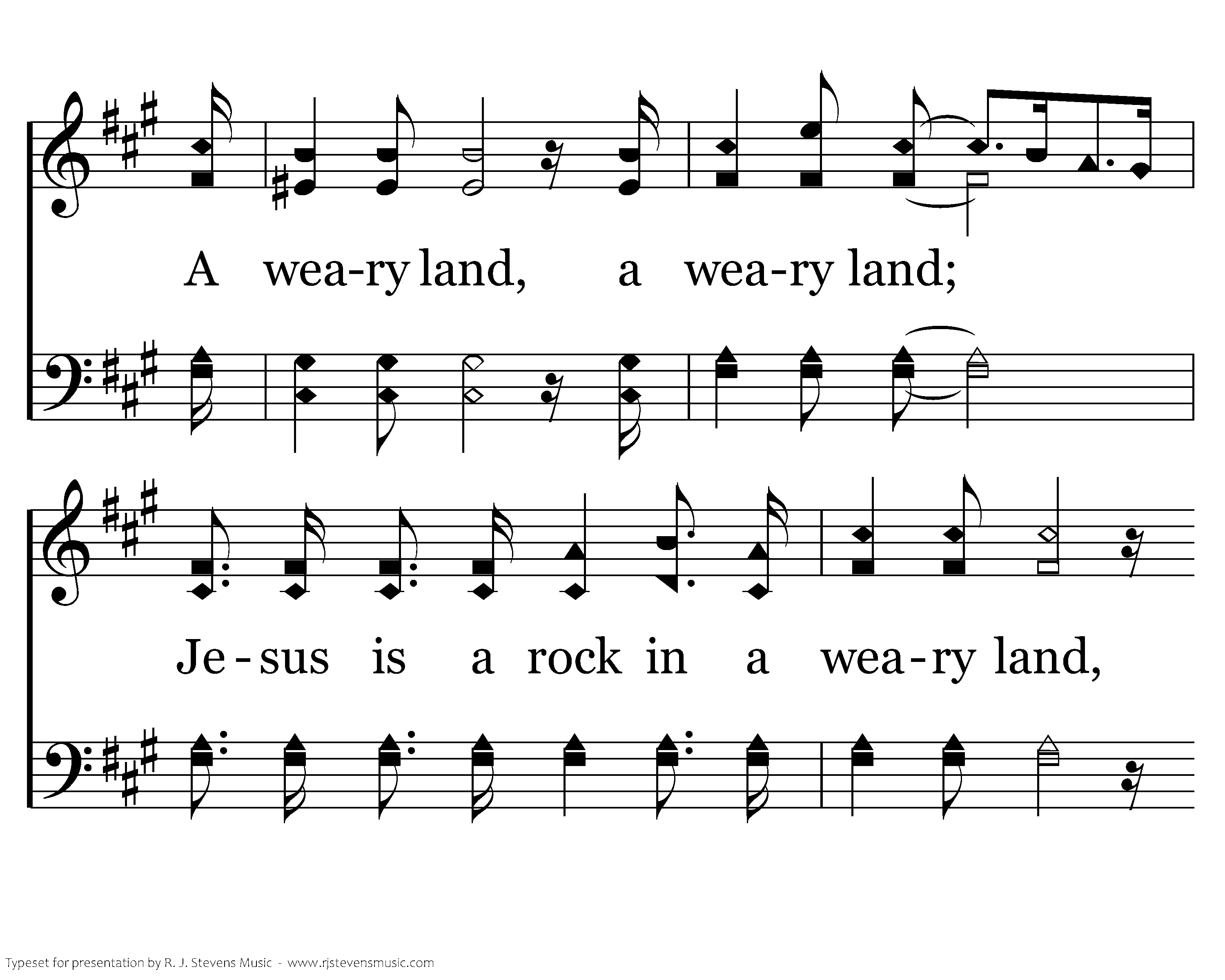 O, Jesus is a rock in a weary land, A weary land, a weary land; Jesus is a rock in a weary land, A shelter in the time of storm.