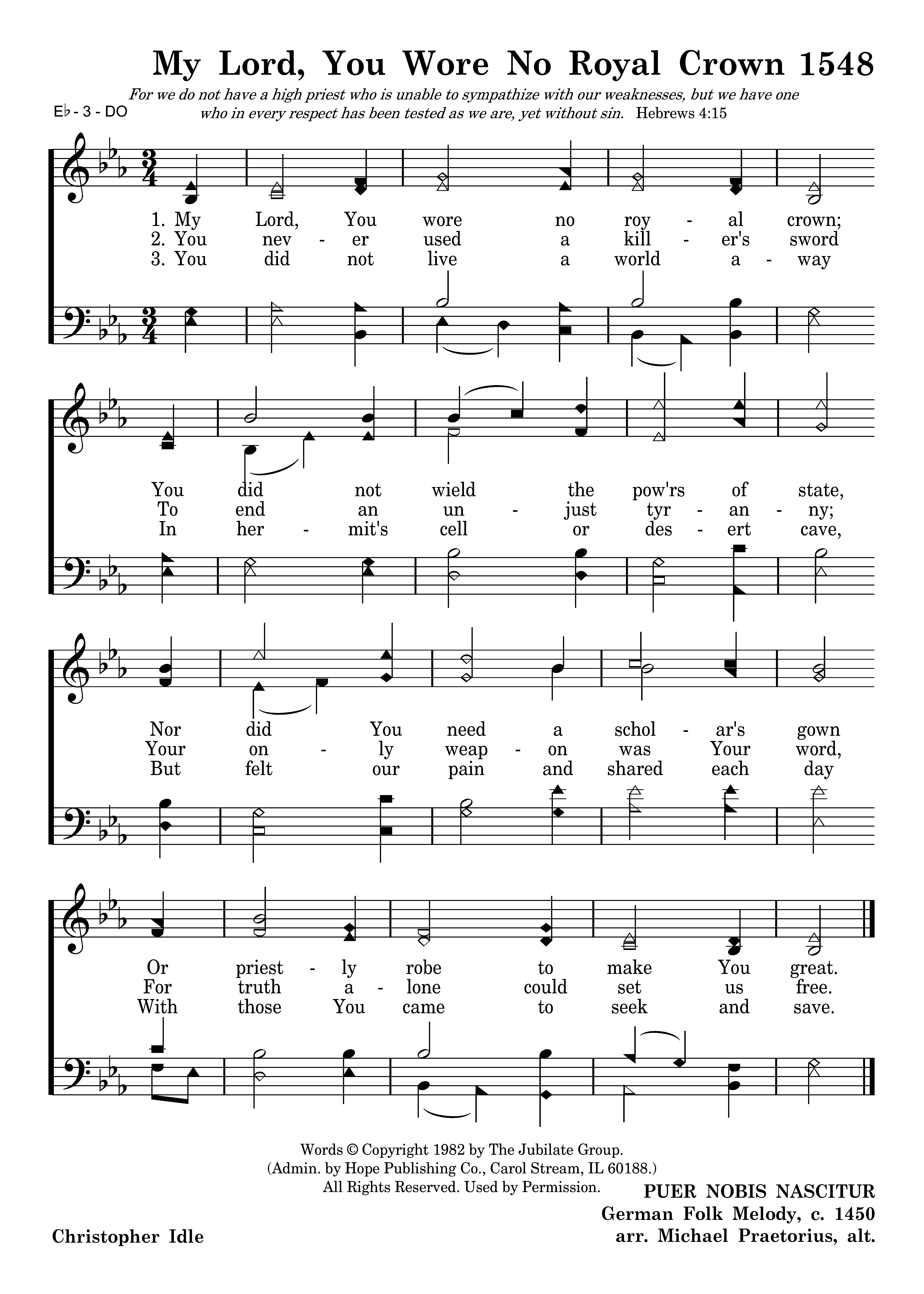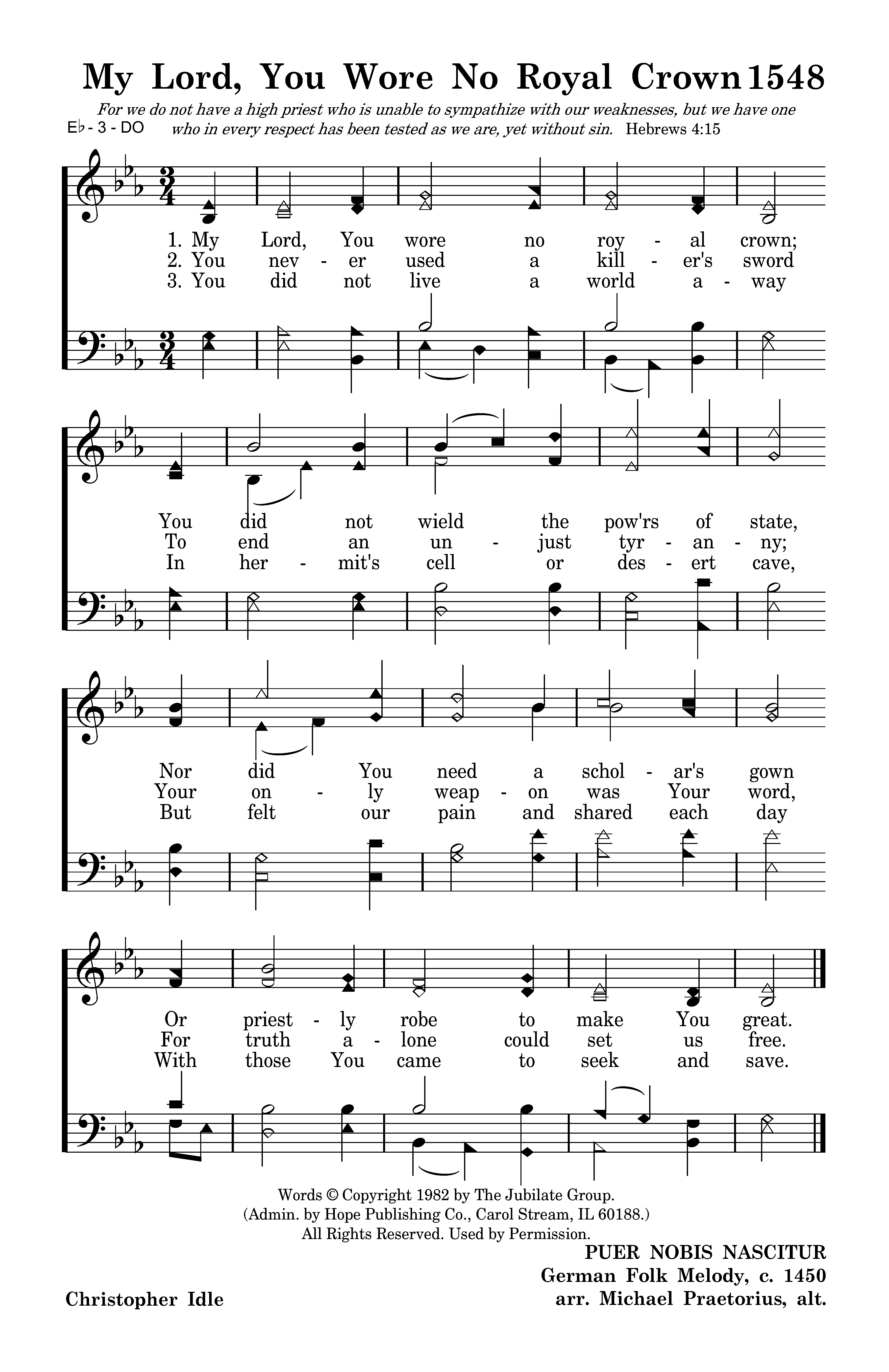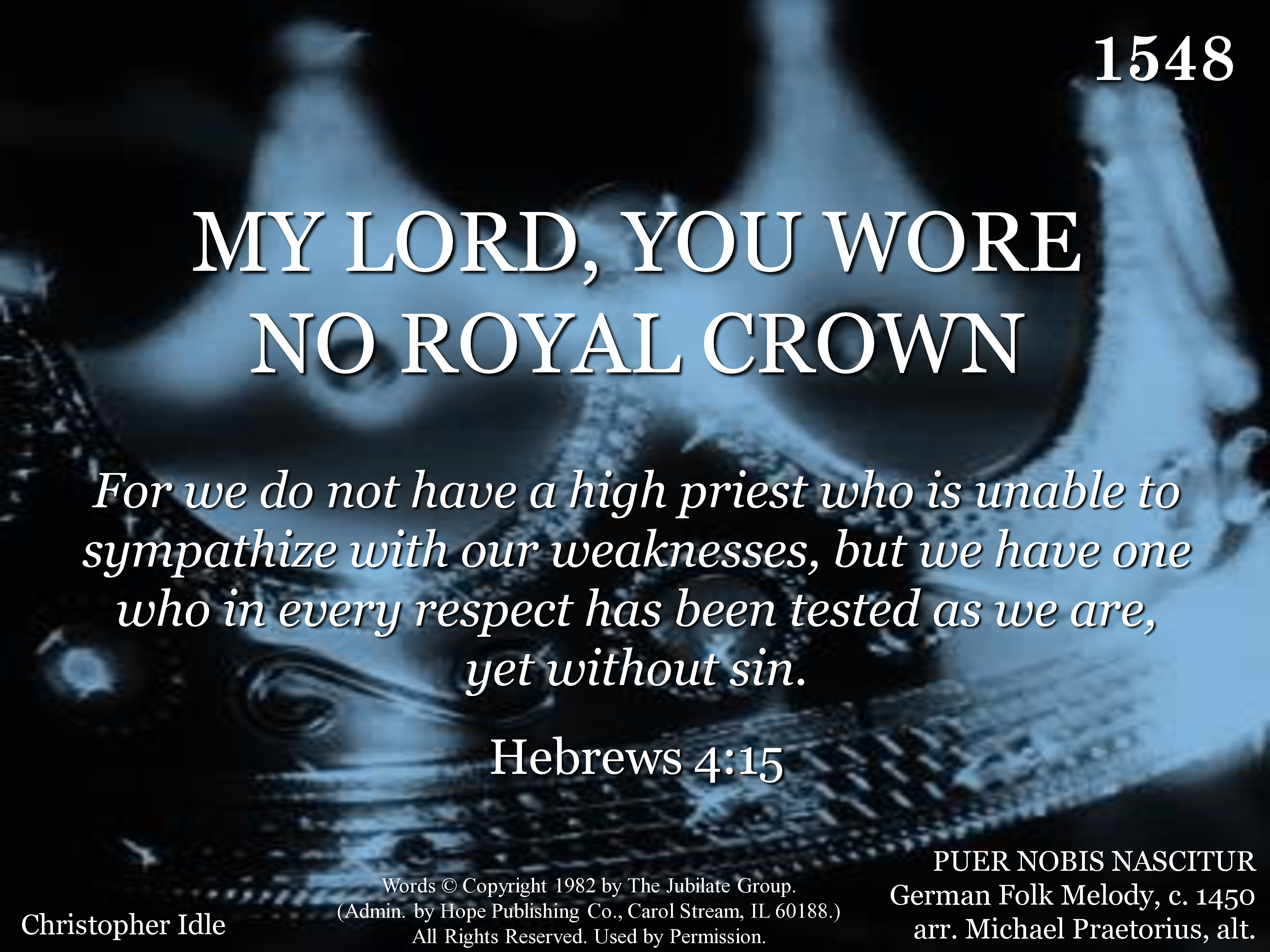 My Lord, You wore no royal crown; You did not wield the pow'rs of state, Nor did You need a scholar's gown Or priestly robe to make You great.