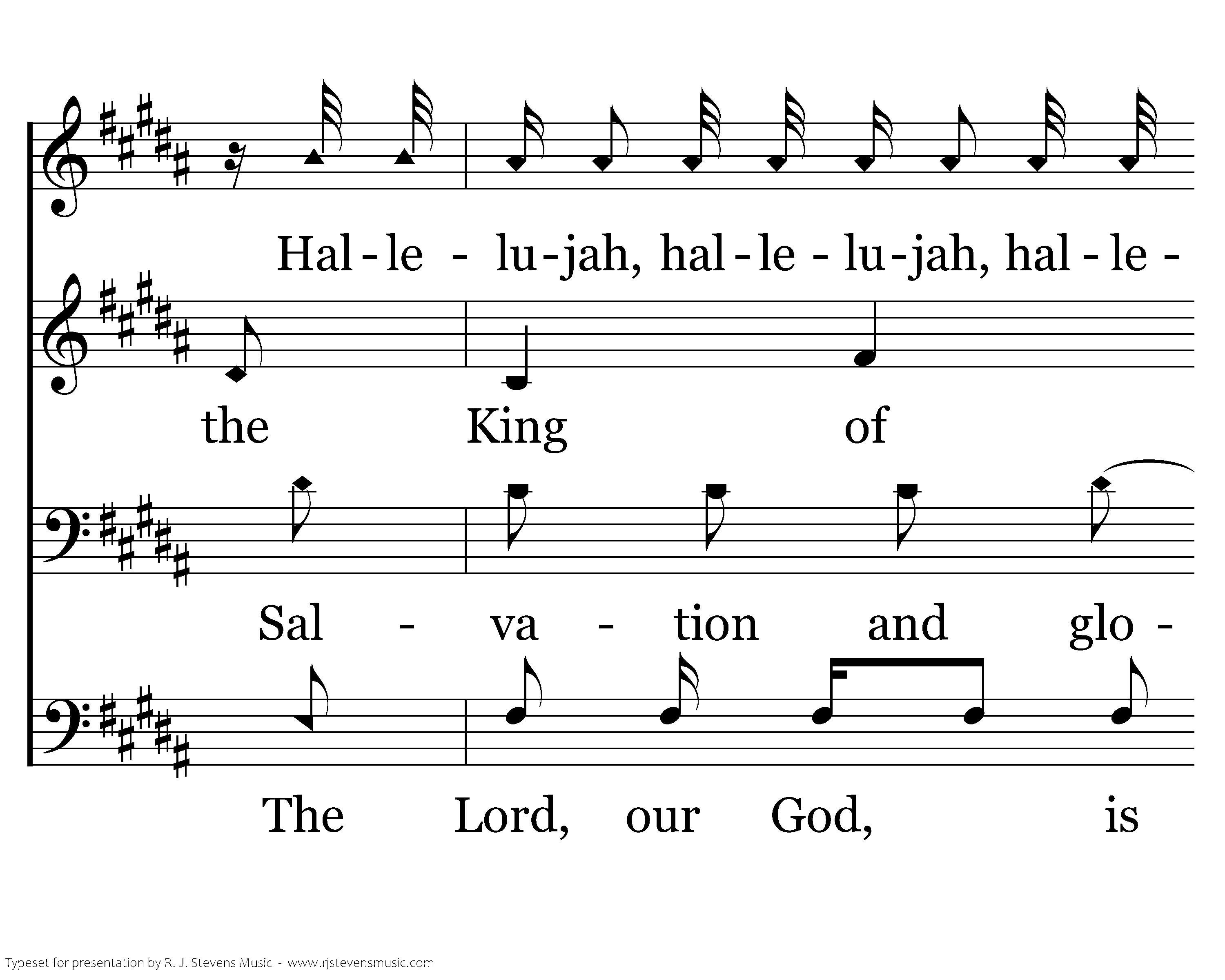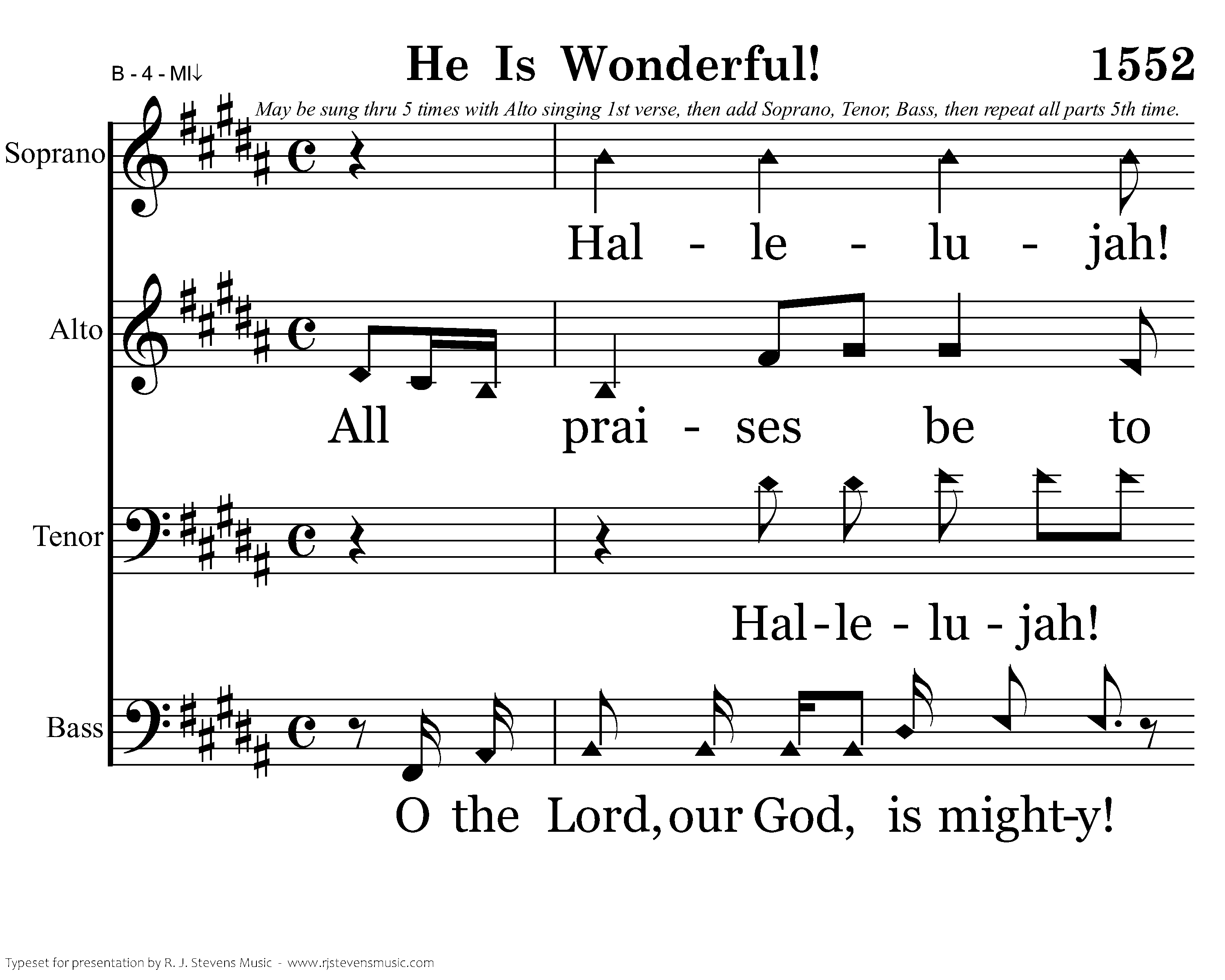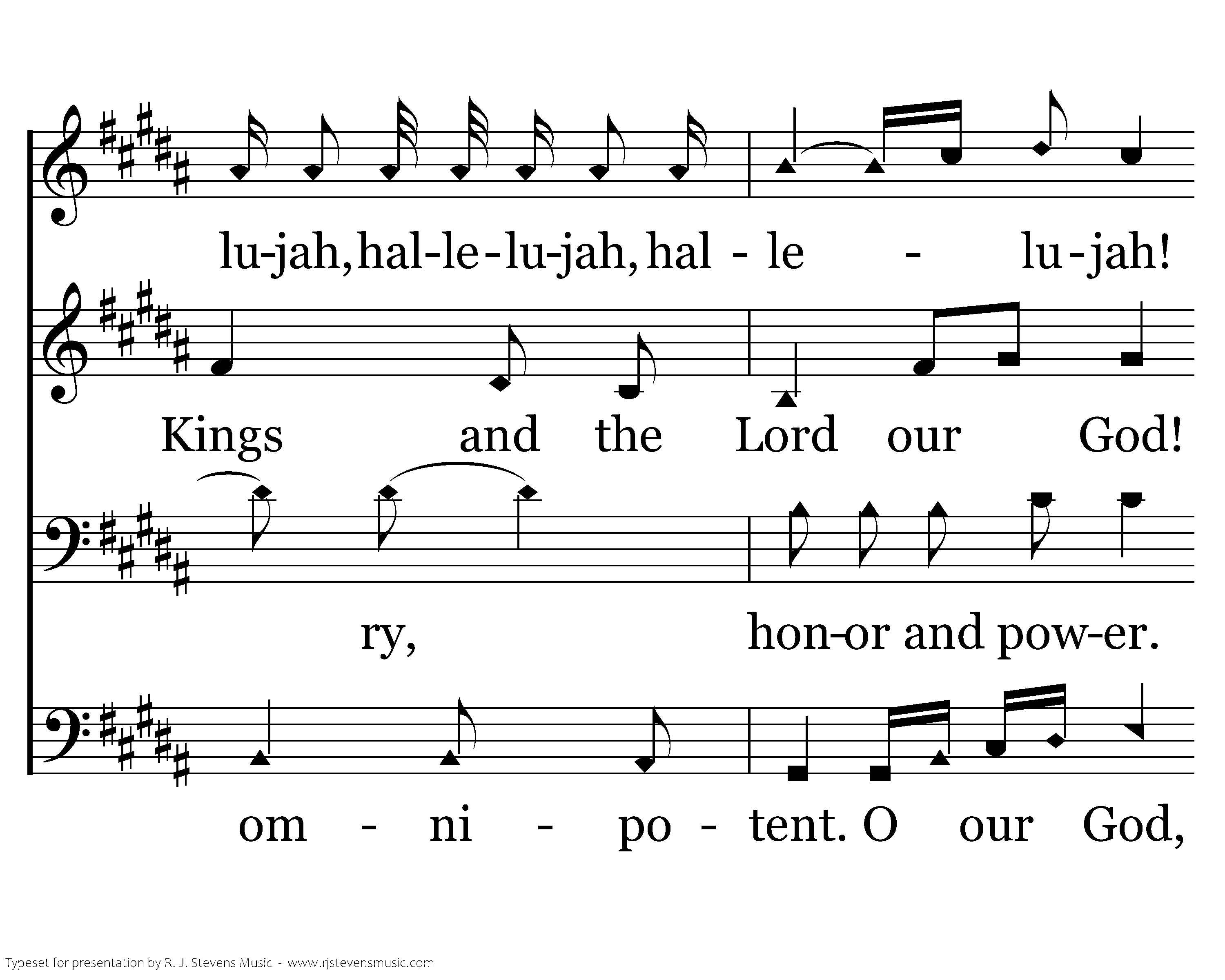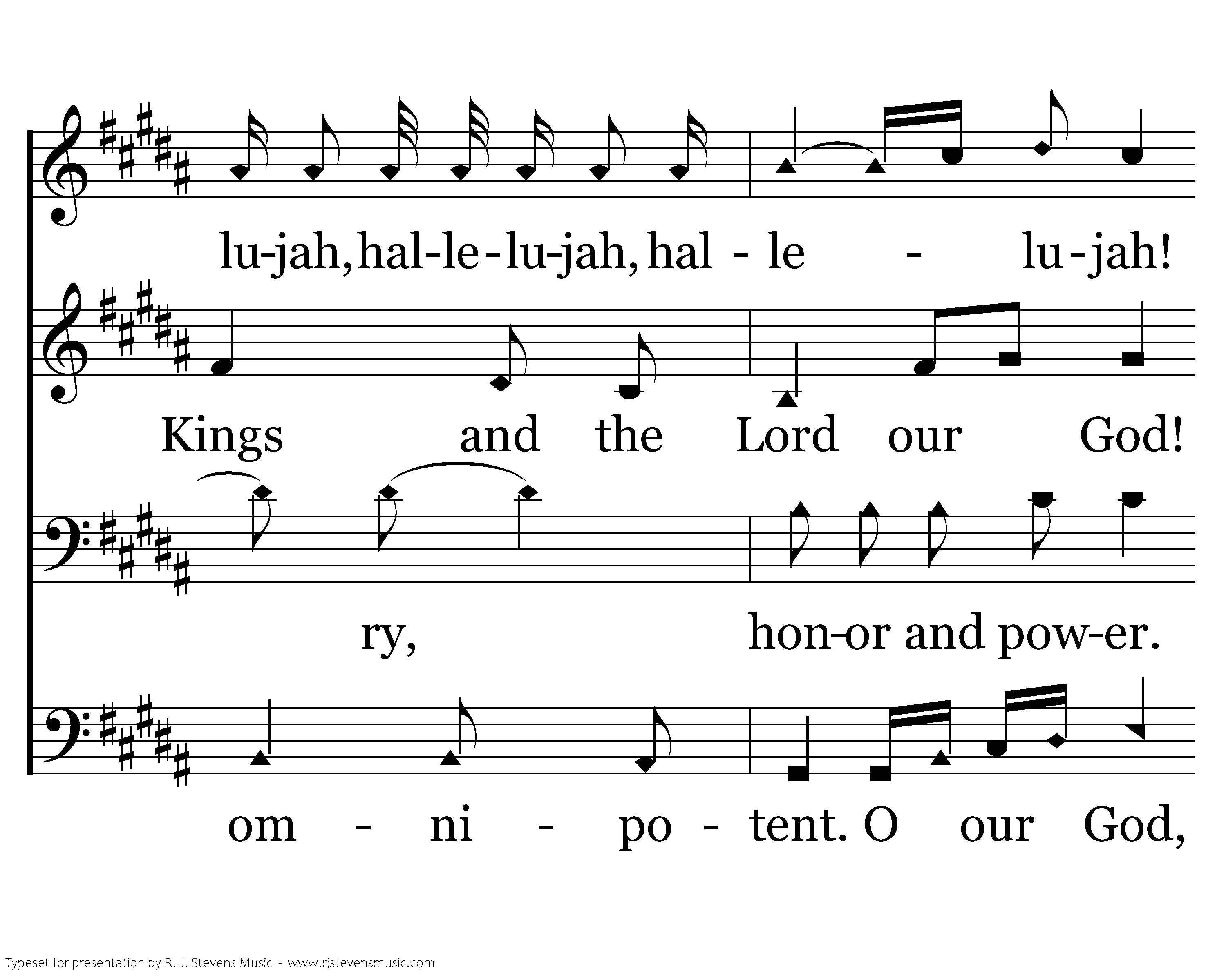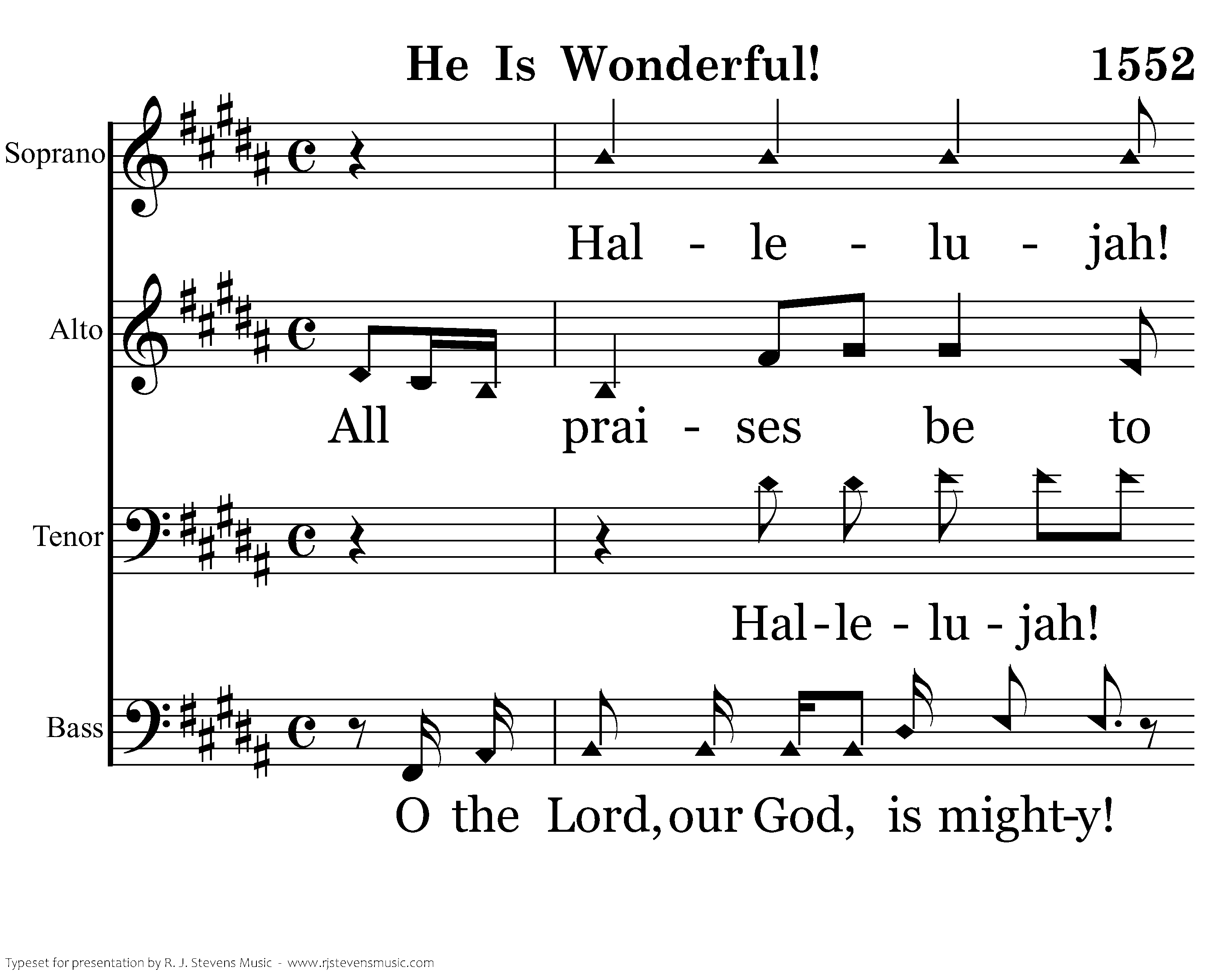 Hallelujah! Hallelujah, hallelujah, hallelujah, hallelujah, hallelujah! He is wonderful! wonderful! All praises be to the King of Kings and the Lord our God! He is wonderful! All wonderful! Hallelujah! Salvation and glory, honor and power. He is wonderful! wonderful! O the Lord, our God, is mighty! The Lord, our God, is omnipotent. O our God, He is wonderful!